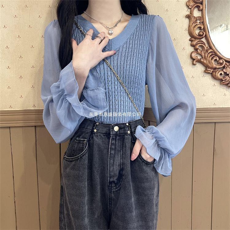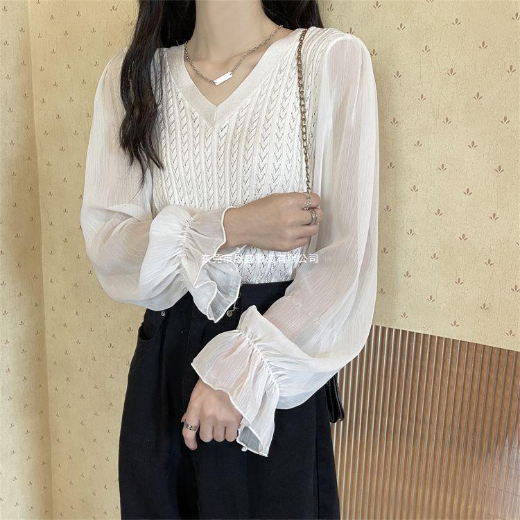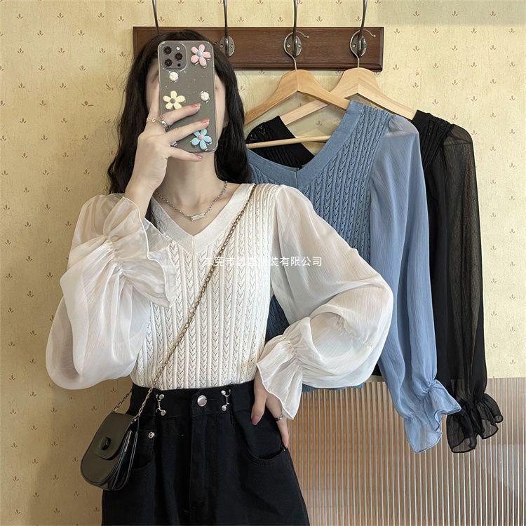 시폰 스플라이스 벨 슬리브 v 넥 2024 가을 여성용 니트 스웨터 얇은 한국 스타일 슬리밍 바닥 셔츠