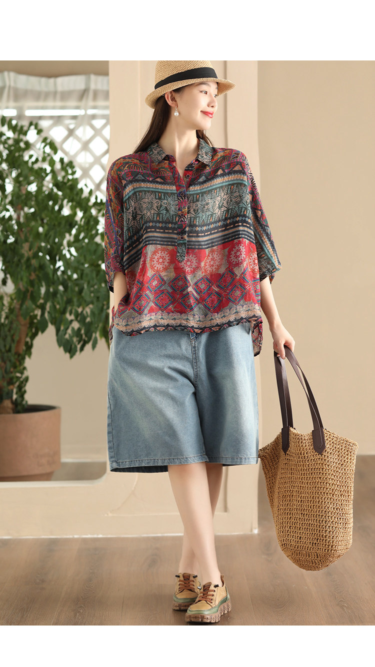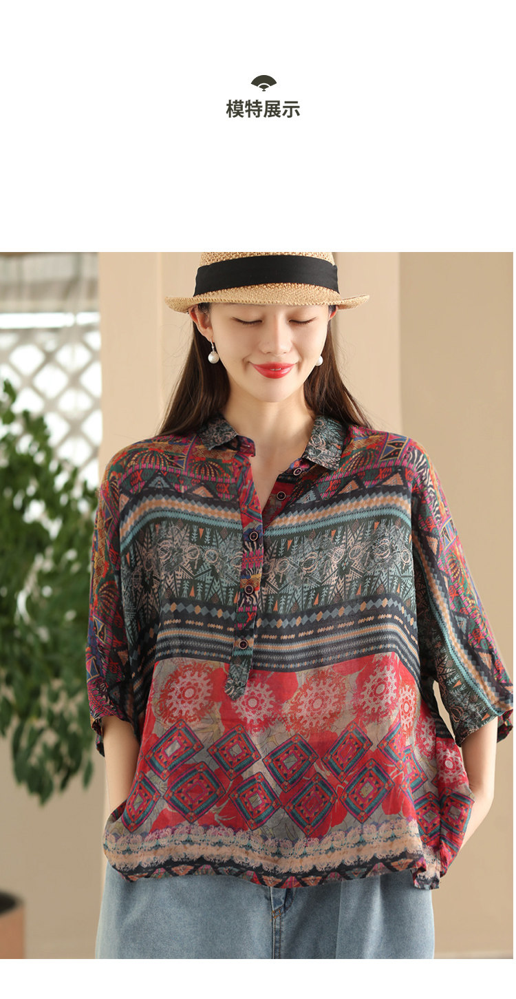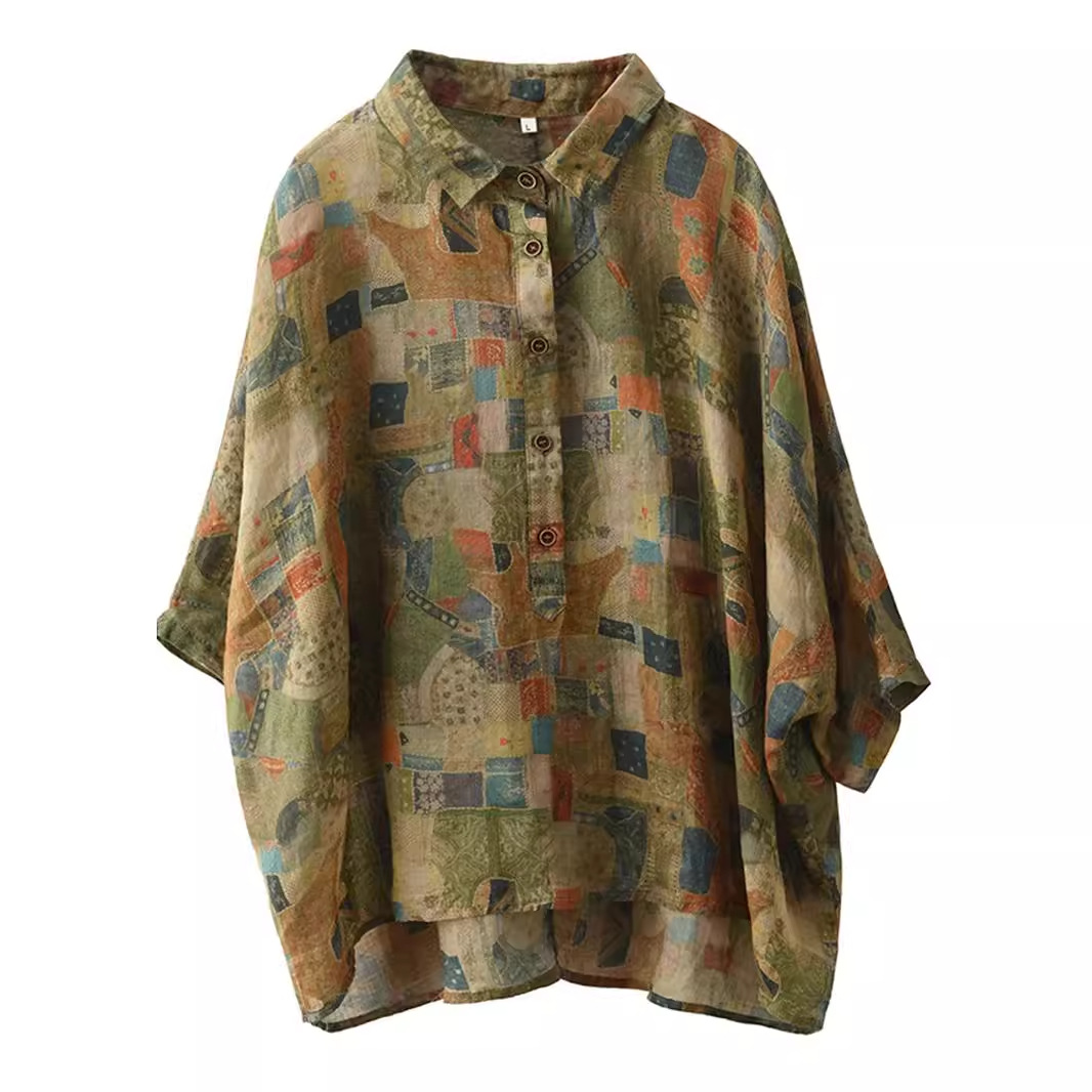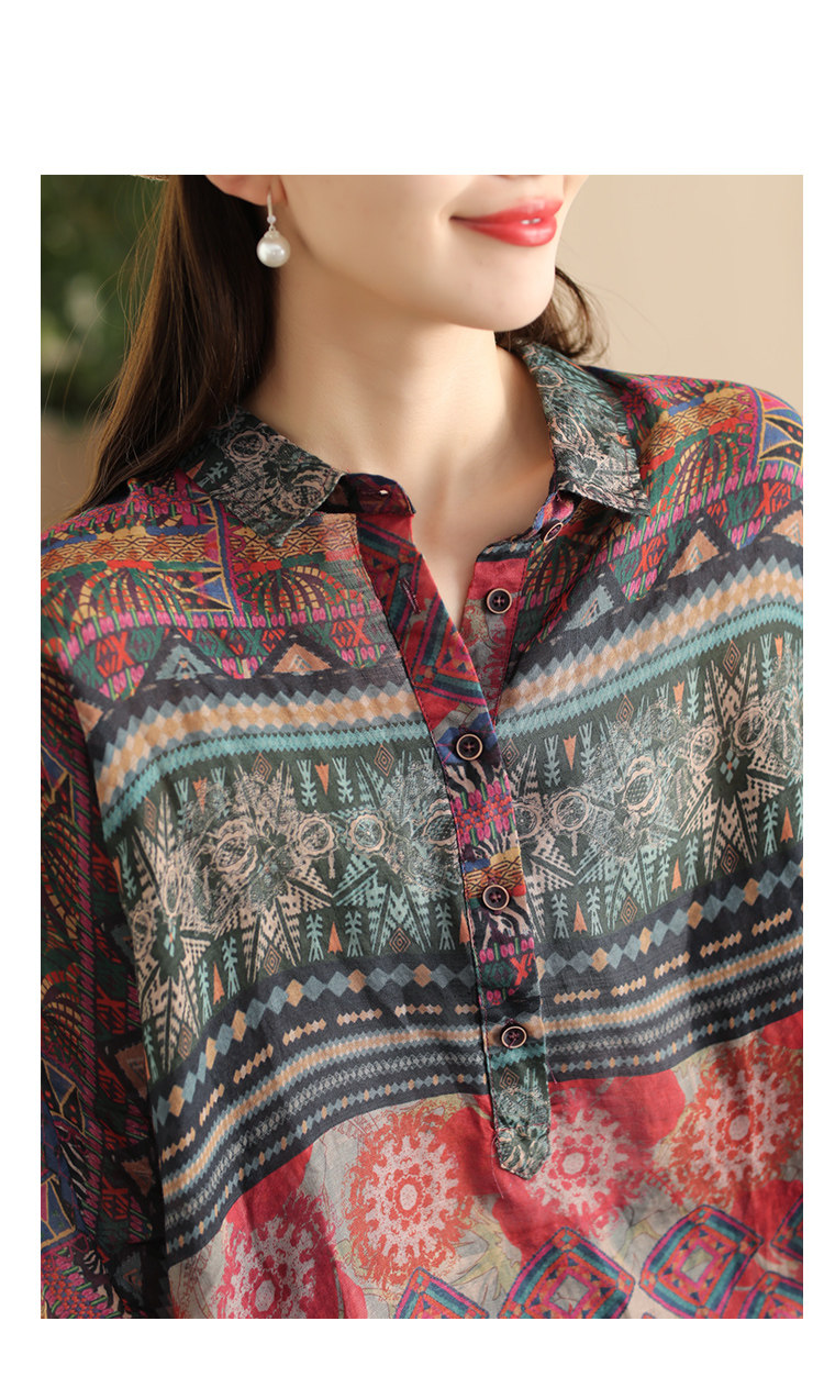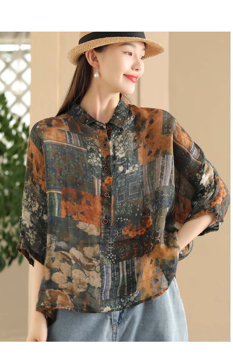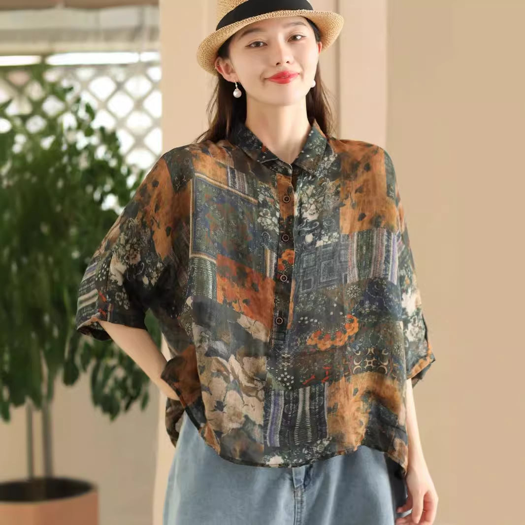 빈티지 프라이드 컬러 인쇄 라미 셔츠 여성의 우아한 옷깃 느슨한 풀오버 셔츠 캐주얼 탑 여름