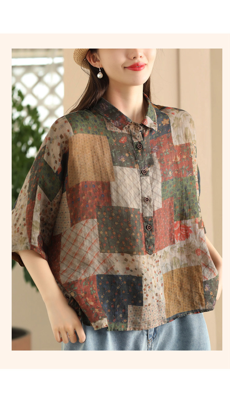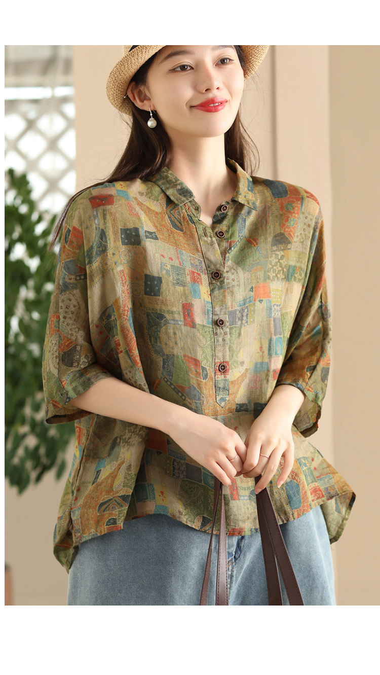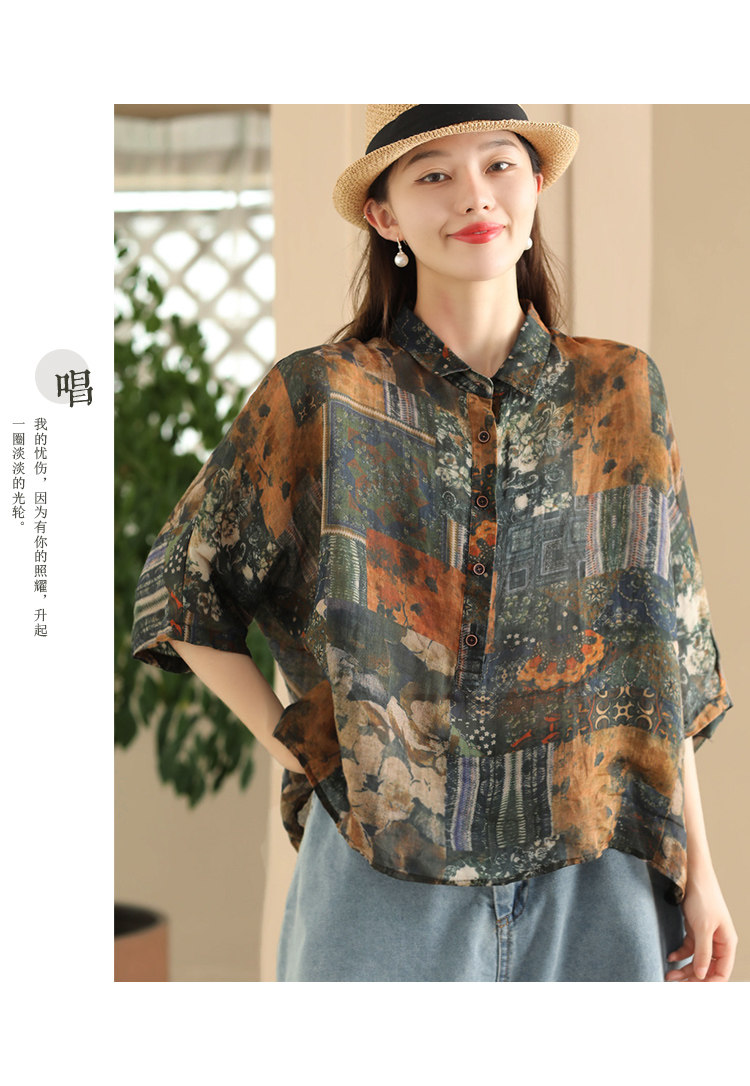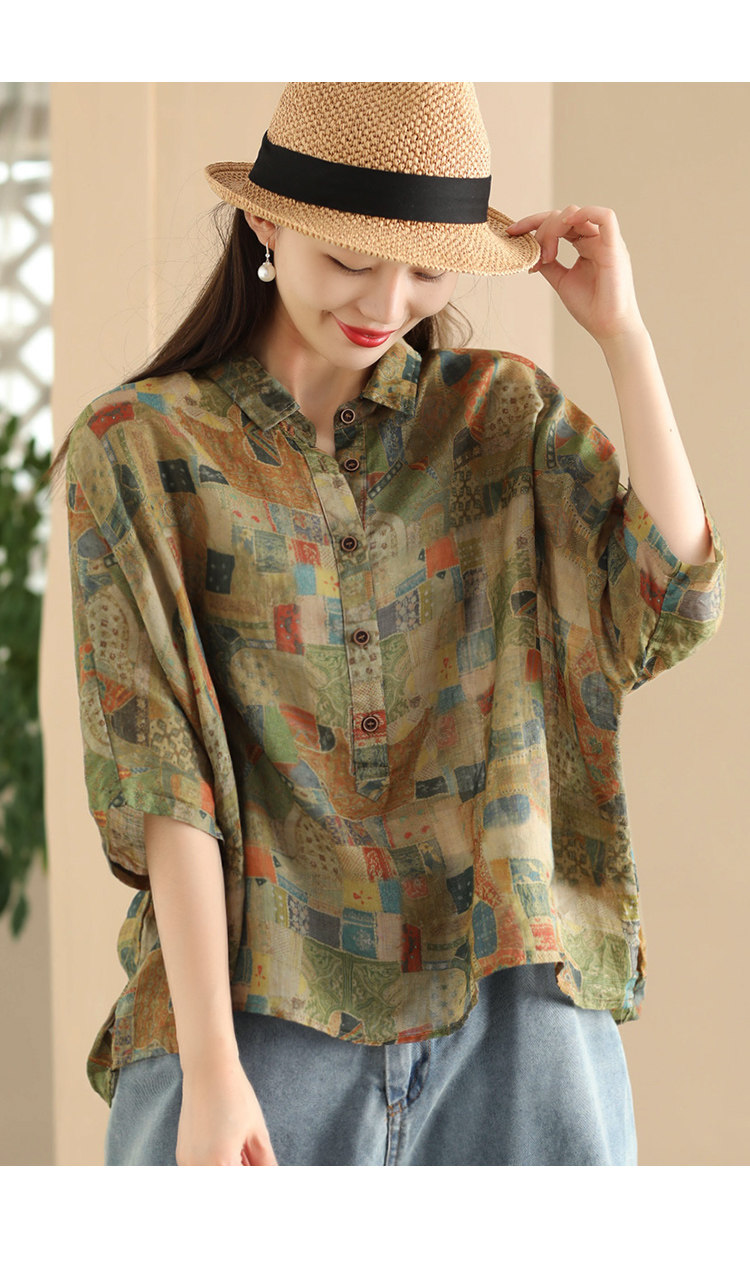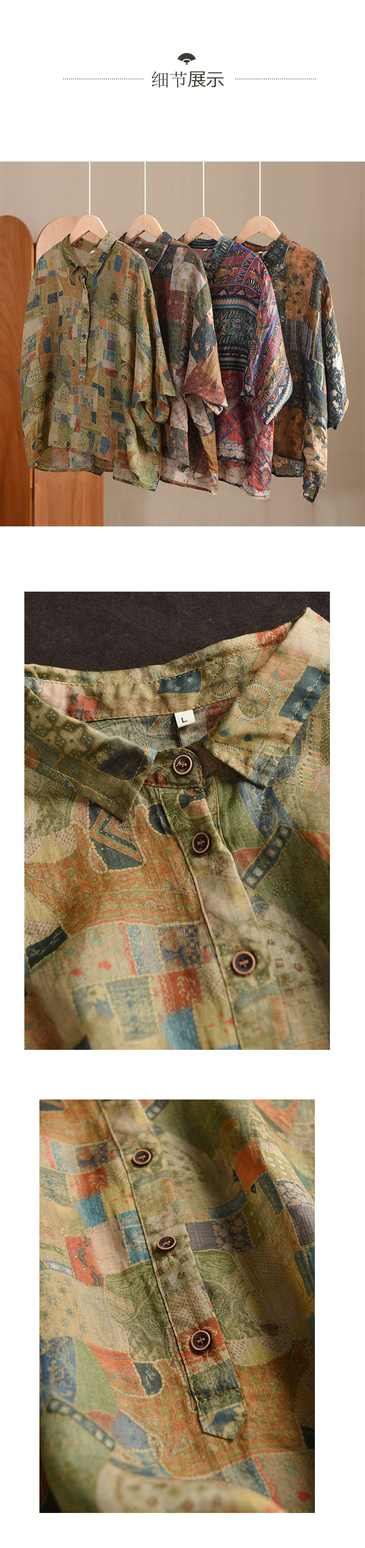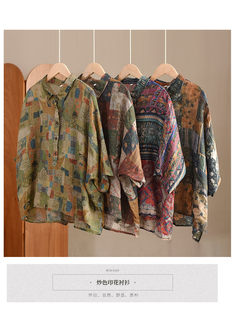 빈티지 프라이드 컬러 인쇄 라미 셔츠 여성의 우아한 옷깃 느슨한 풀오버 셔츠 캐주얼 탑 여름스토어 가기