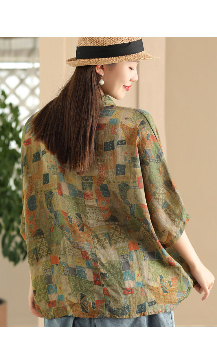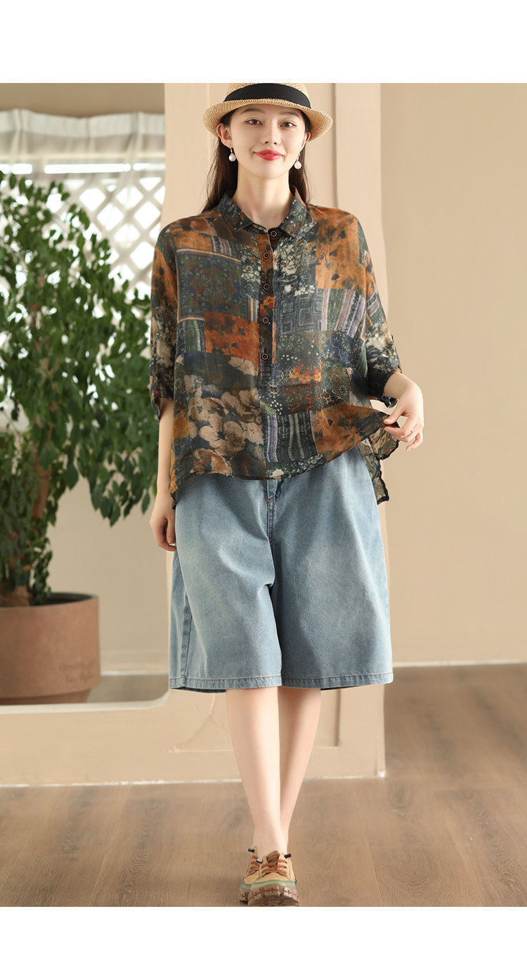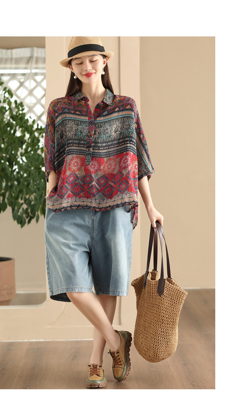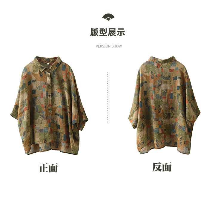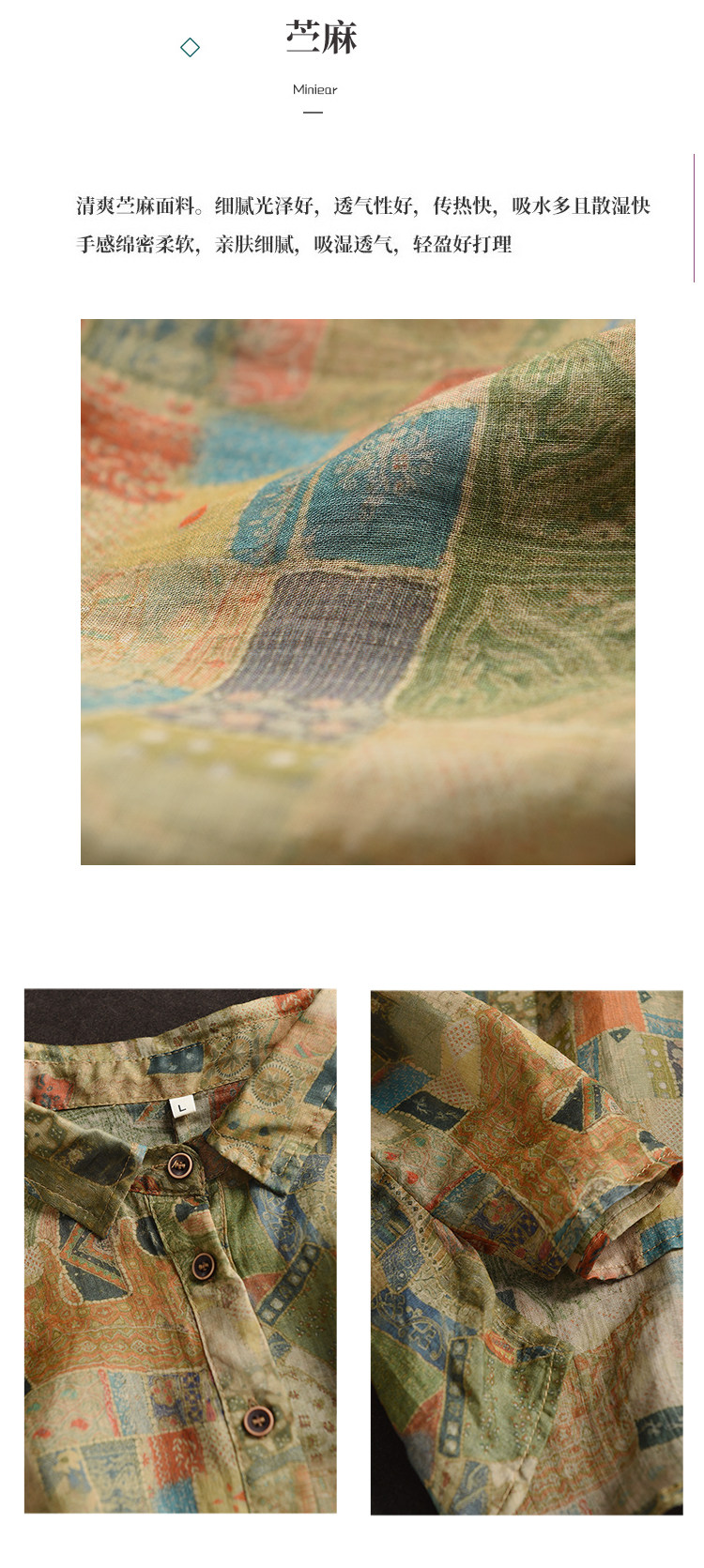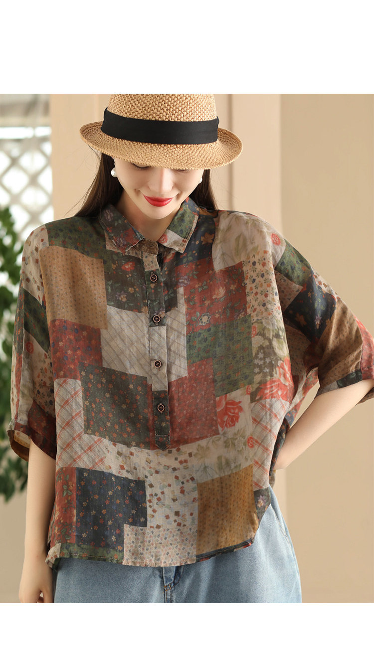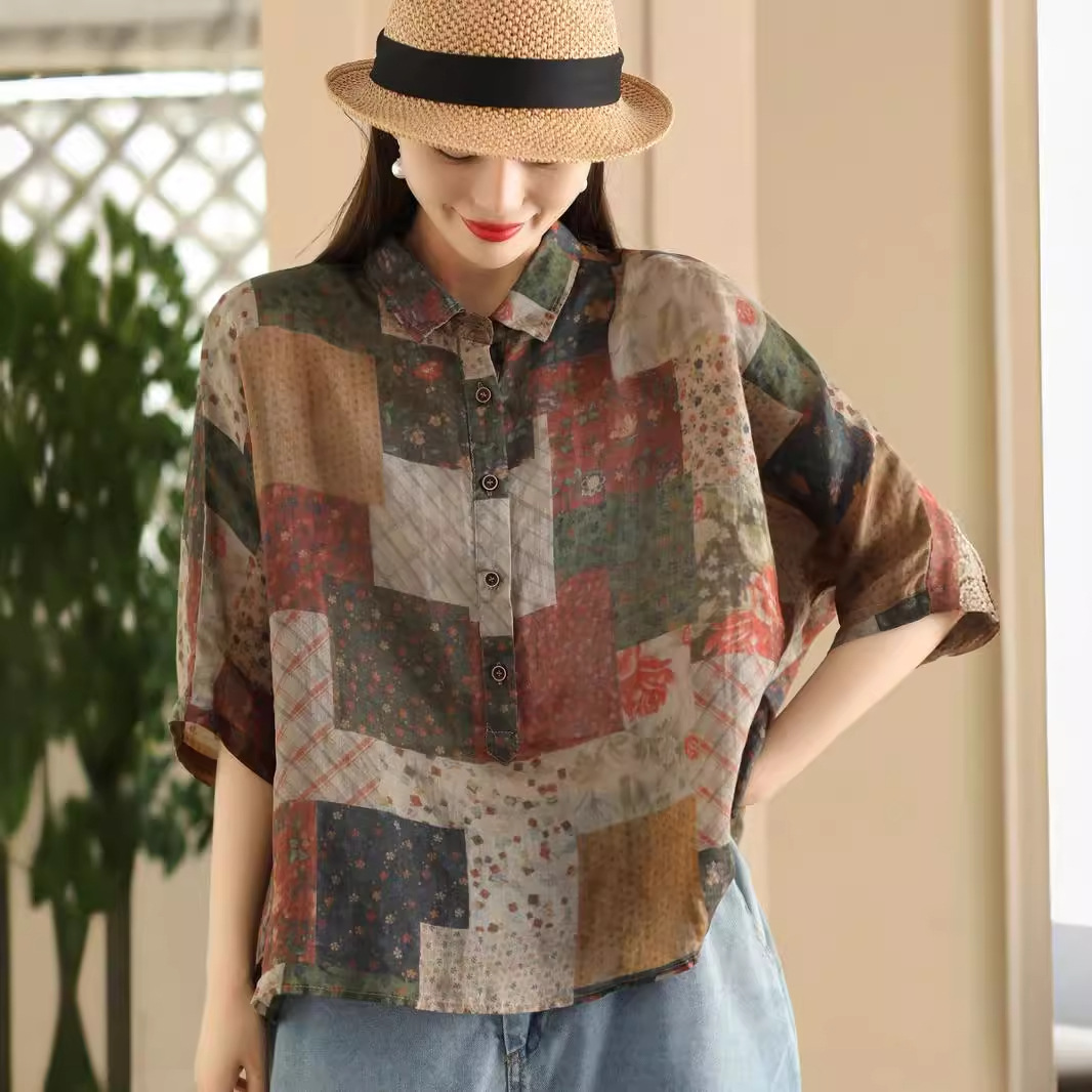 빈티지 프라이드 컬러 인쇄 라미 셔츠 여성의 우아한 옷깃 느슨한 풀오버 셔츠 캐주얼 탑 여름스토어 가기