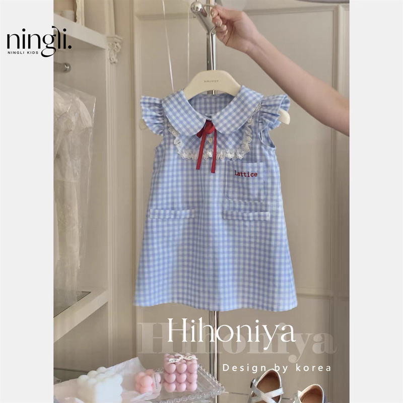 라임 한국 아동복 2024 여름 새 아기 레이스 블루 체크 플라잉 소매 원피스 한국 스커트스토어 가기