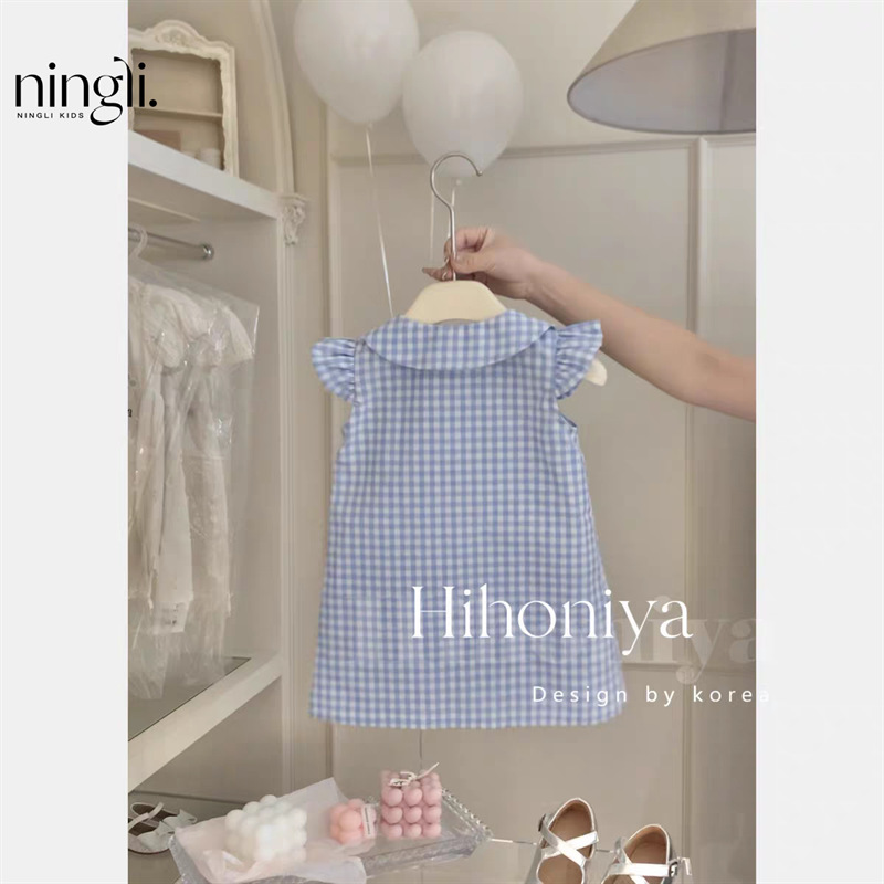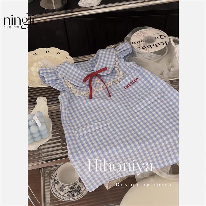라임 한국 아동복 2024 여름 새 아기 레이스 블루 체크 플라잉 소매 원피스 한국 스커트