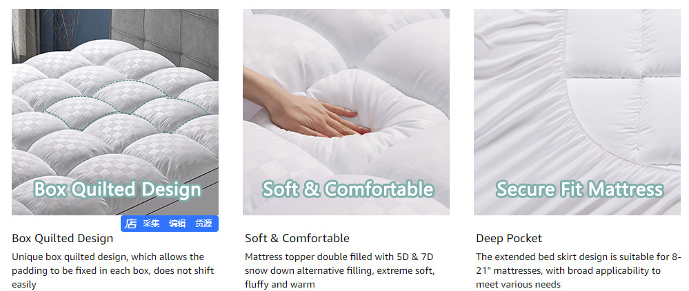 工艺:上层面料+绵+底层棉面料,立高设计,20×20CM方格绗缝,绗缝后与床裙五线拷边,床裙底部一圈0.9CM宽橡筋拷边,长边距角20CM缝洗标,菊花标等。