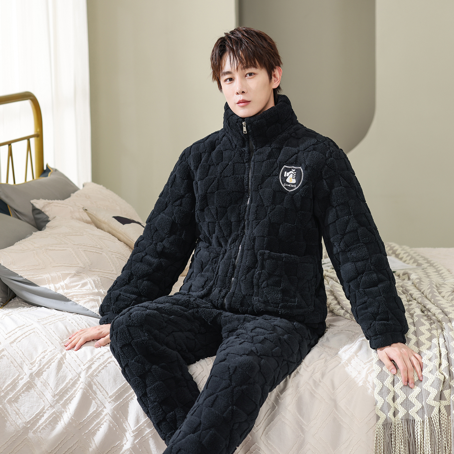 • 부를 마스터하는 자카드 벨벳 스퀘어 블랙 지퍼 스탠드 칼라