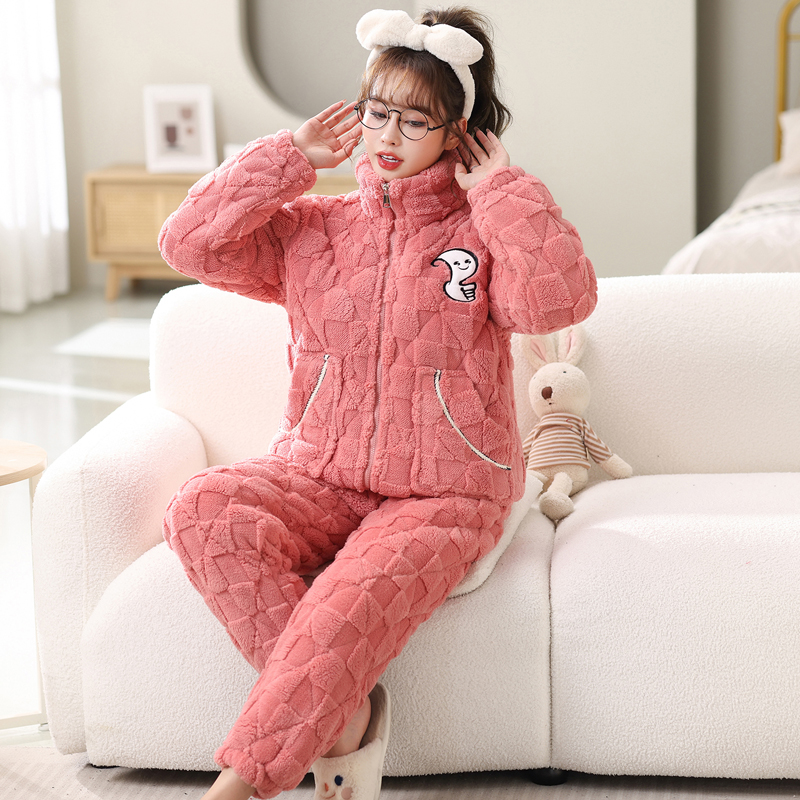 파자마 겨울 3 층 두꺼운 퀼트 기모 따뜻한 플란넬 플러스 사이즈 둥근 목 겉옷 커플 세트스토어 가기