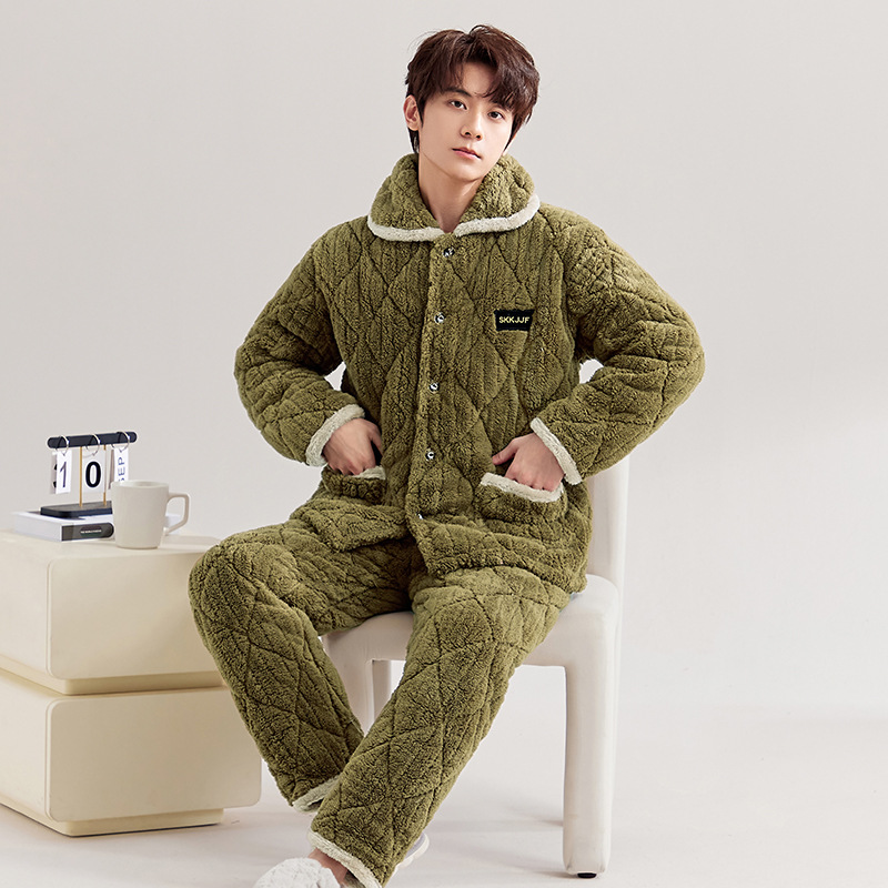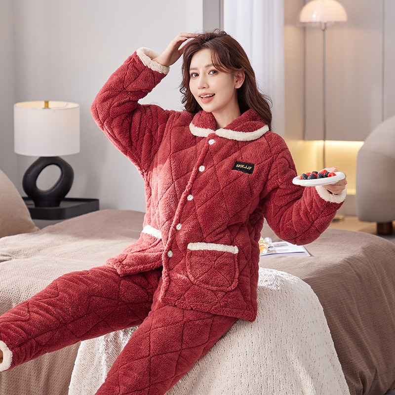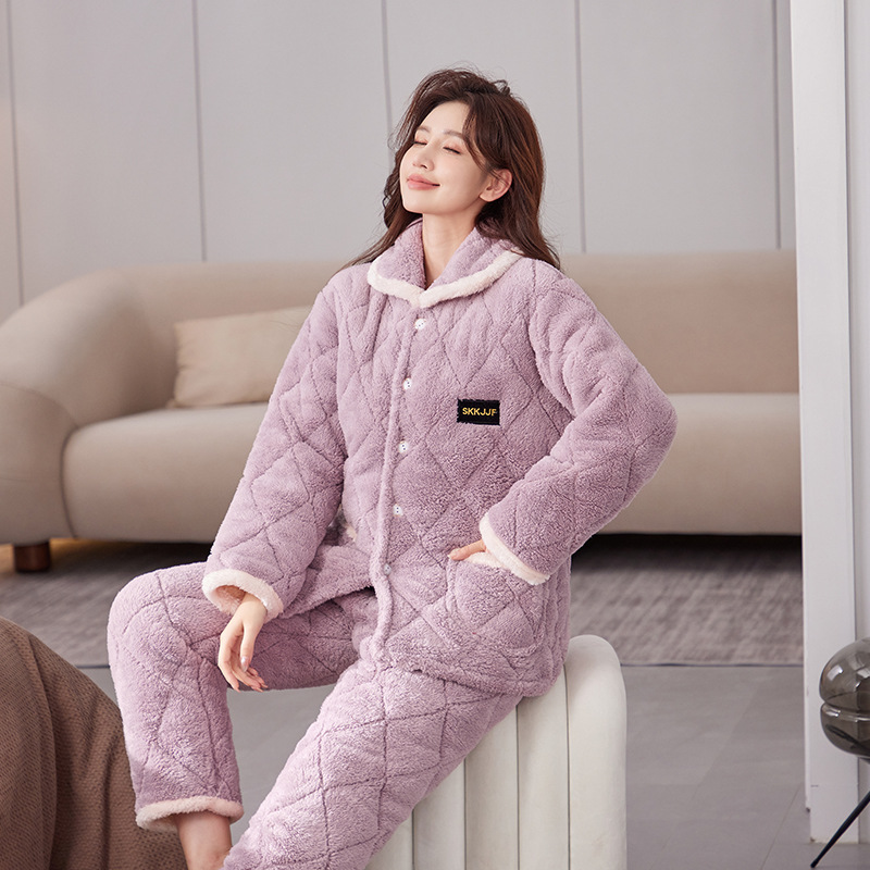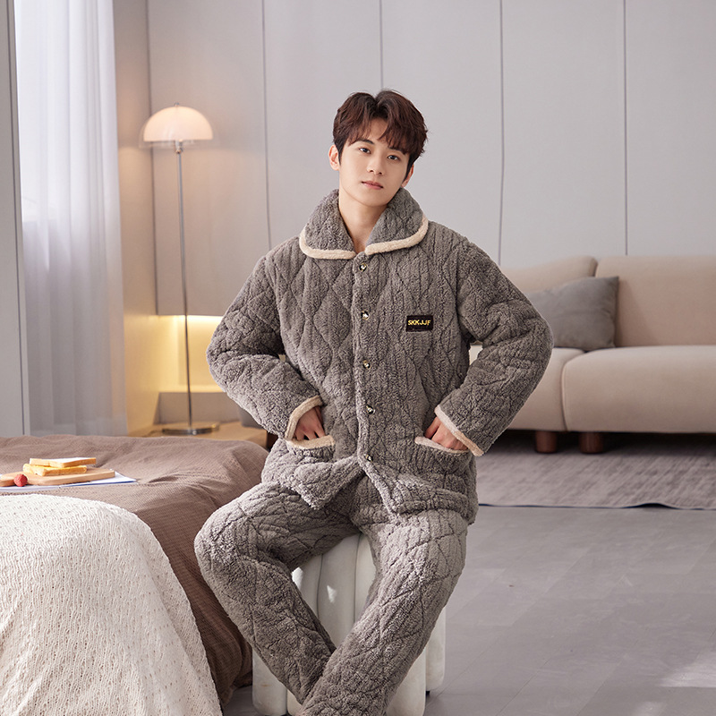 파자마 겨울 3 층 두꺼운 퀼트 기모 따뜻한 플란넬 플러스 사이즈 둥근 목 겉옷 커플 세트