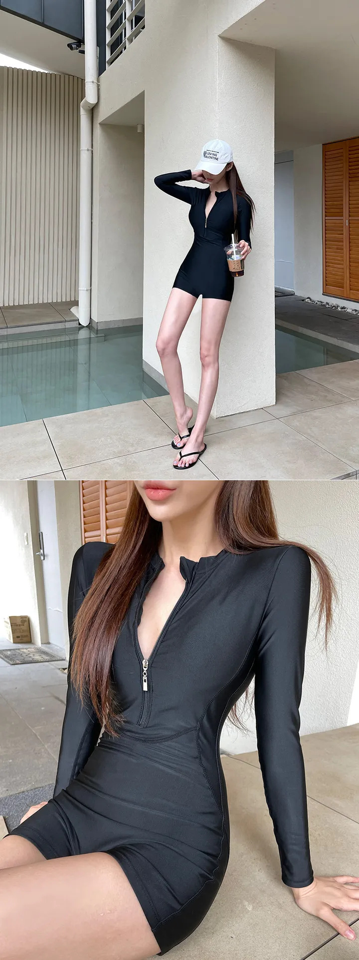 소스 공장 새로운 한국 보수 지퍼 블랙 긴팔 복서 수영복 여성 온천 선 스크린 수영복스토어 가기