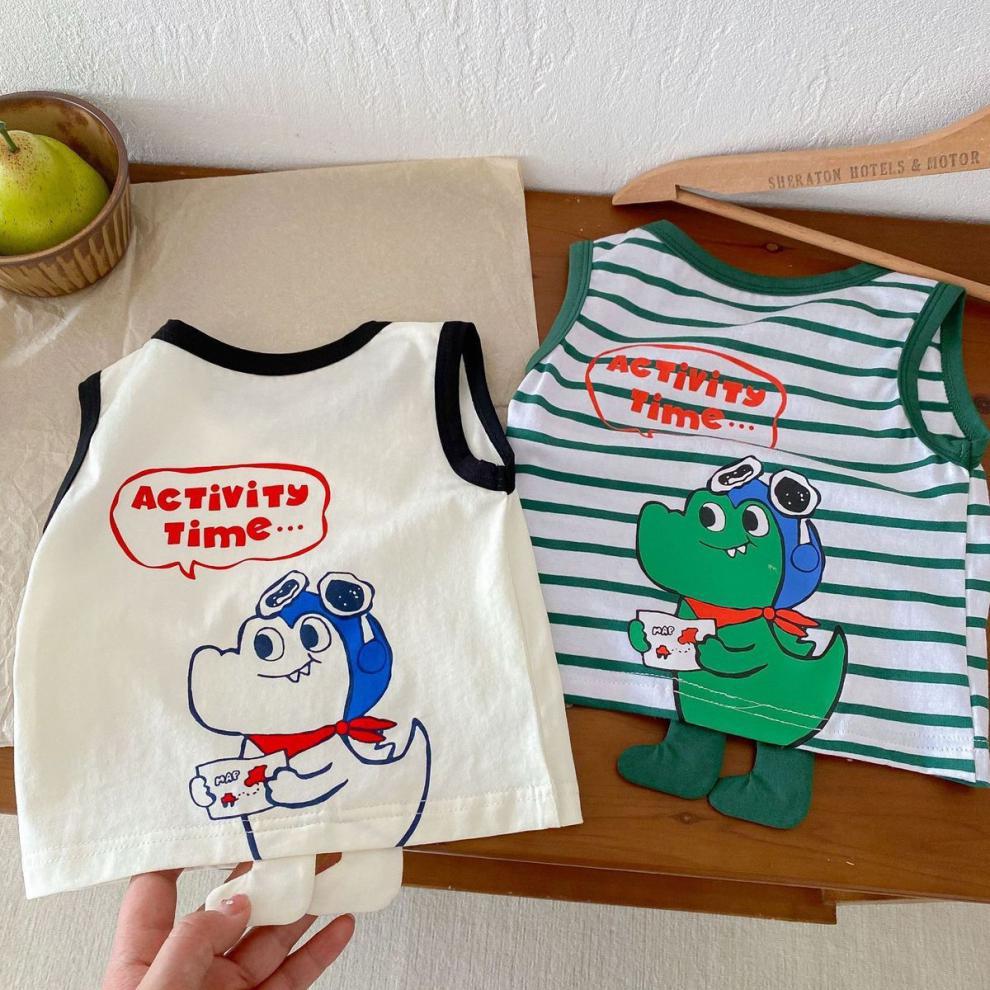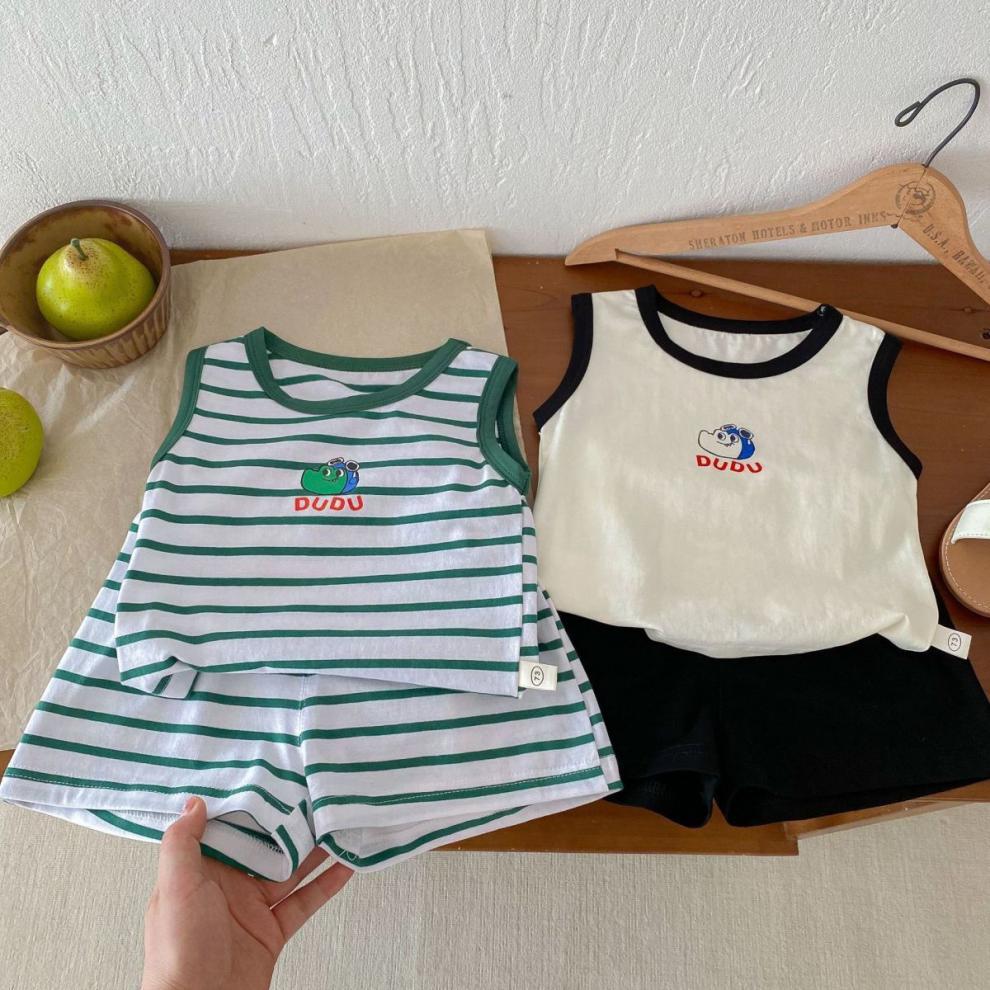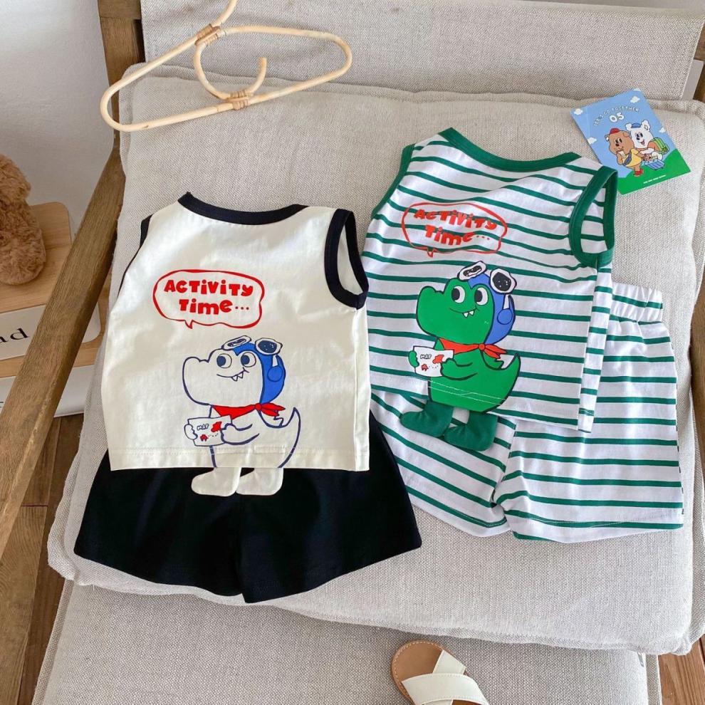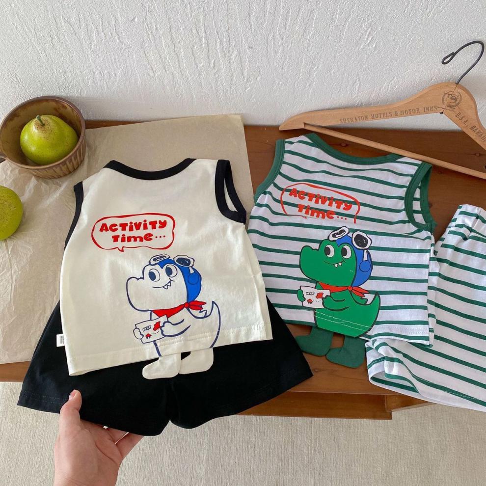 어린이 여름 민소매 조끼 세트 소년 소녀 만화 공룡 얇은 탑 아기 줄무늬 반바지 투피스 세트스토어 가기
