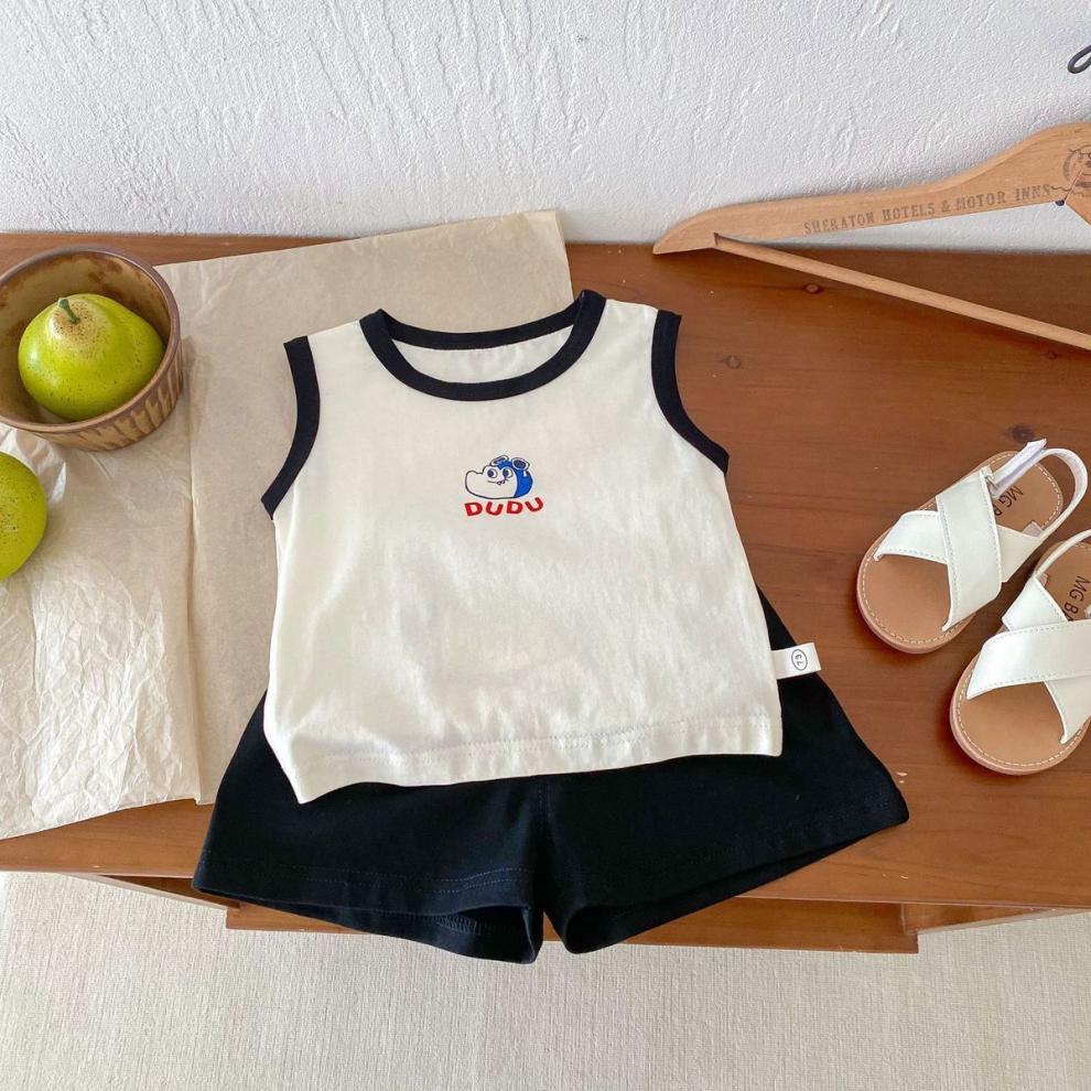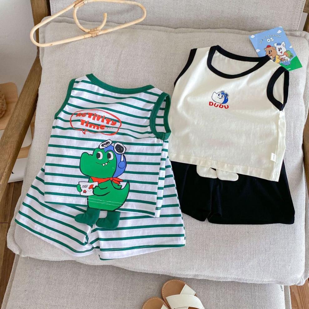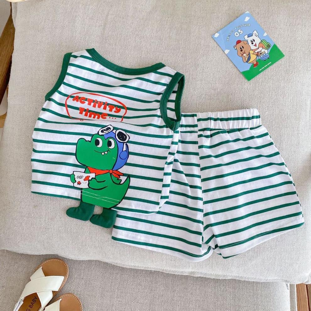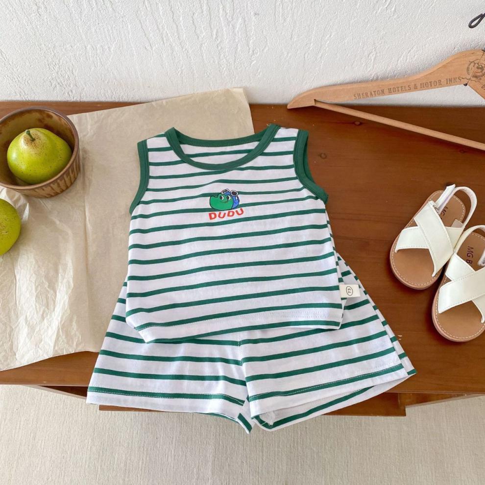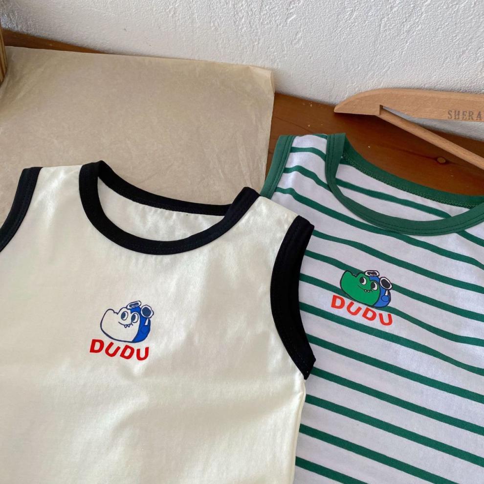 어린이 여름 민소매 조끼 세트 소년 소녀 만화 공룡 얇은 탑 아기 줄무늬 반바지 투피스 세트스토어 가기