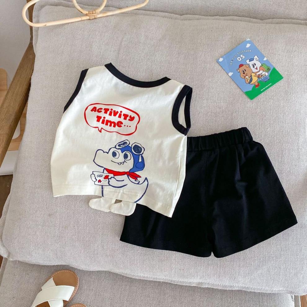 어린이 여름 민소매 조끼 세트 소년 소녀 만화 공룡 얇은 탑 아기 줄무늬 반바지 투피스 세트