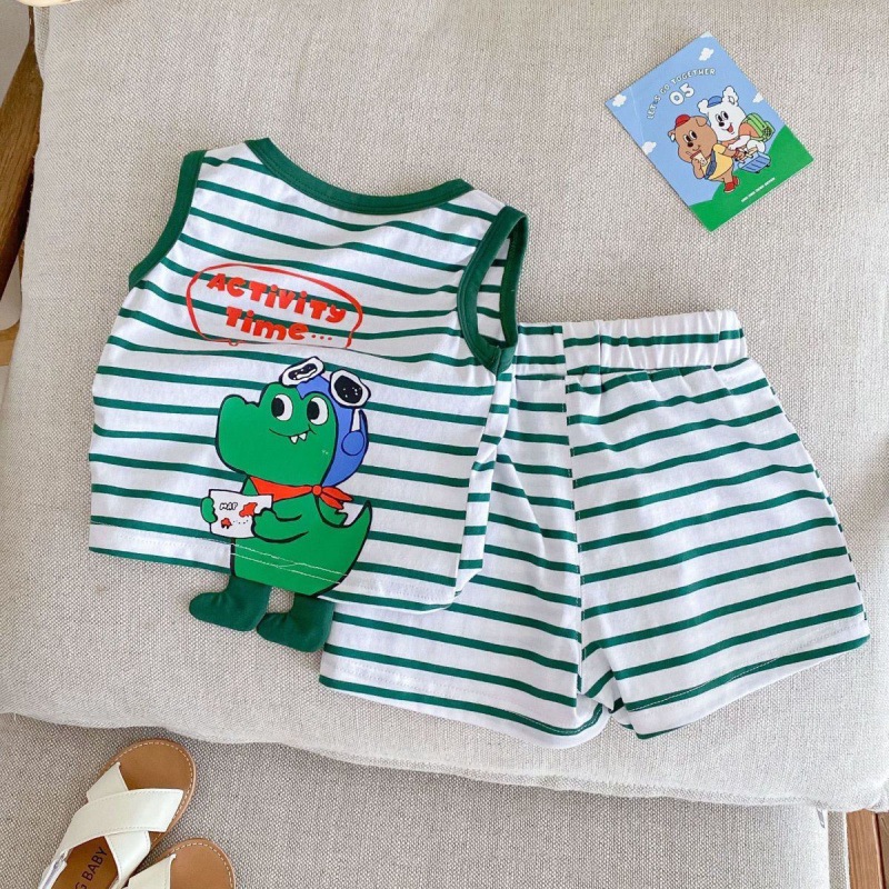 儿童夏季无袖背心套装男女童卡通恐龙薄款上衣宝宝条纹短裤两件套