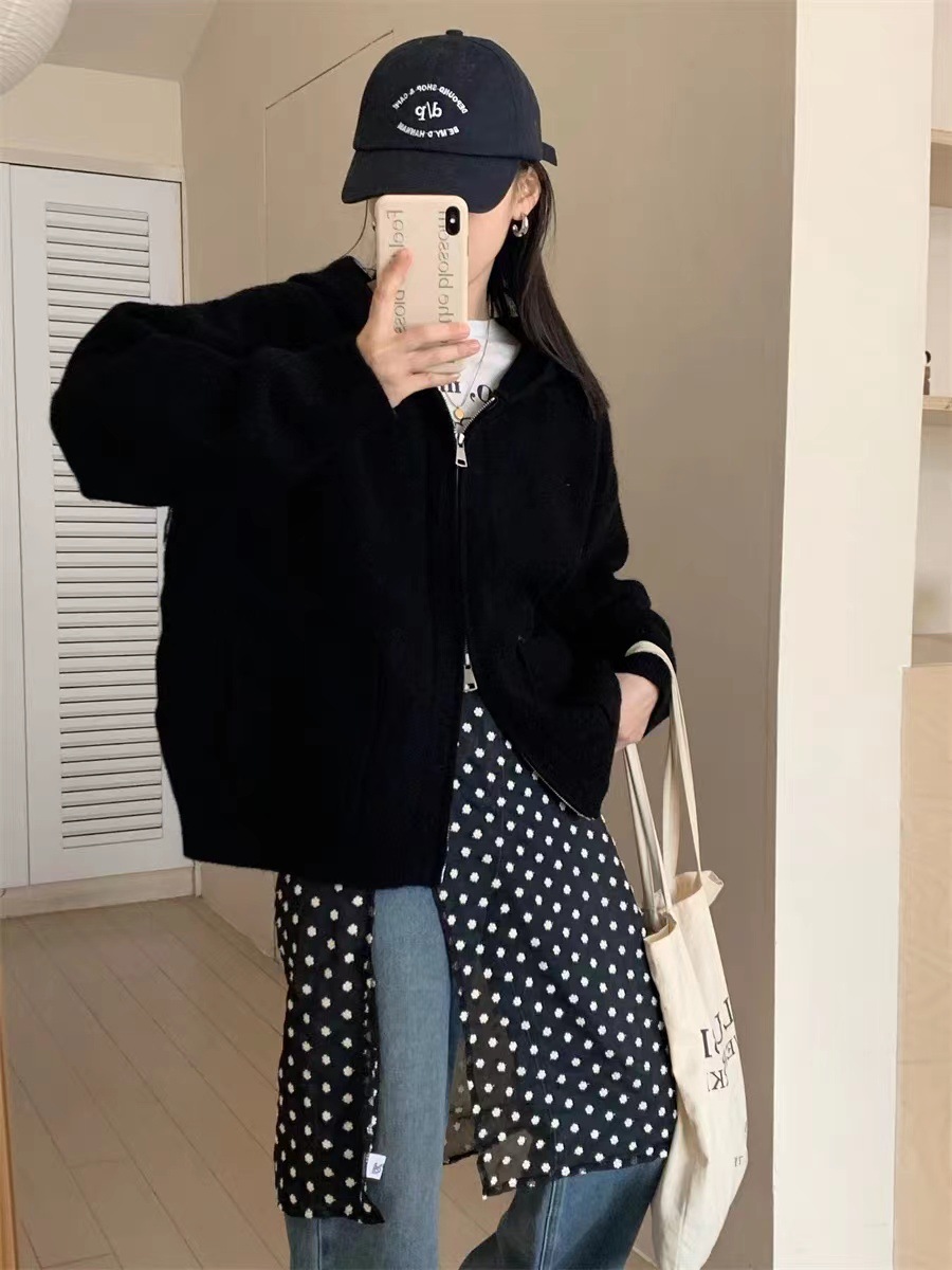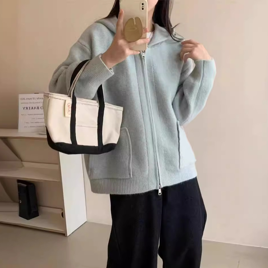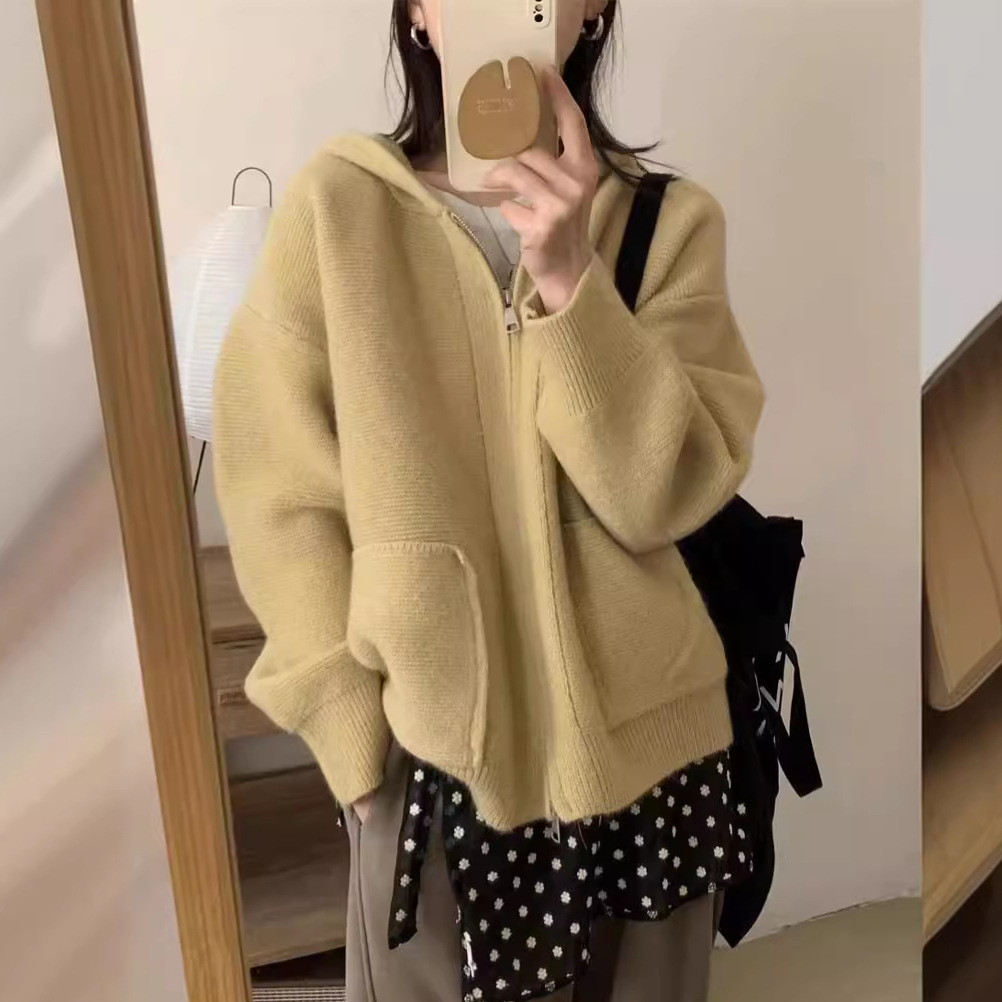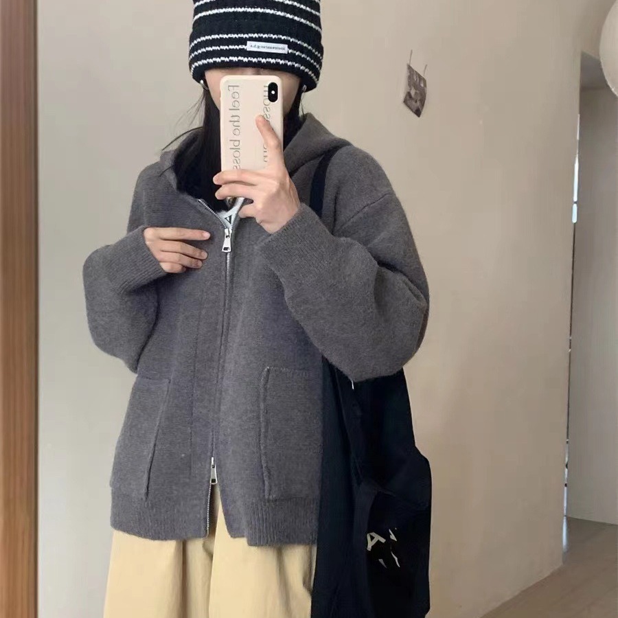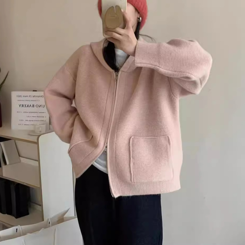한국 스타일 캐주얼 느슨한 후드 스웨터 코트 여성의 가을과 겨울 새로운 더블 포켓 연령 감소 디자인 센스 니트 카디건