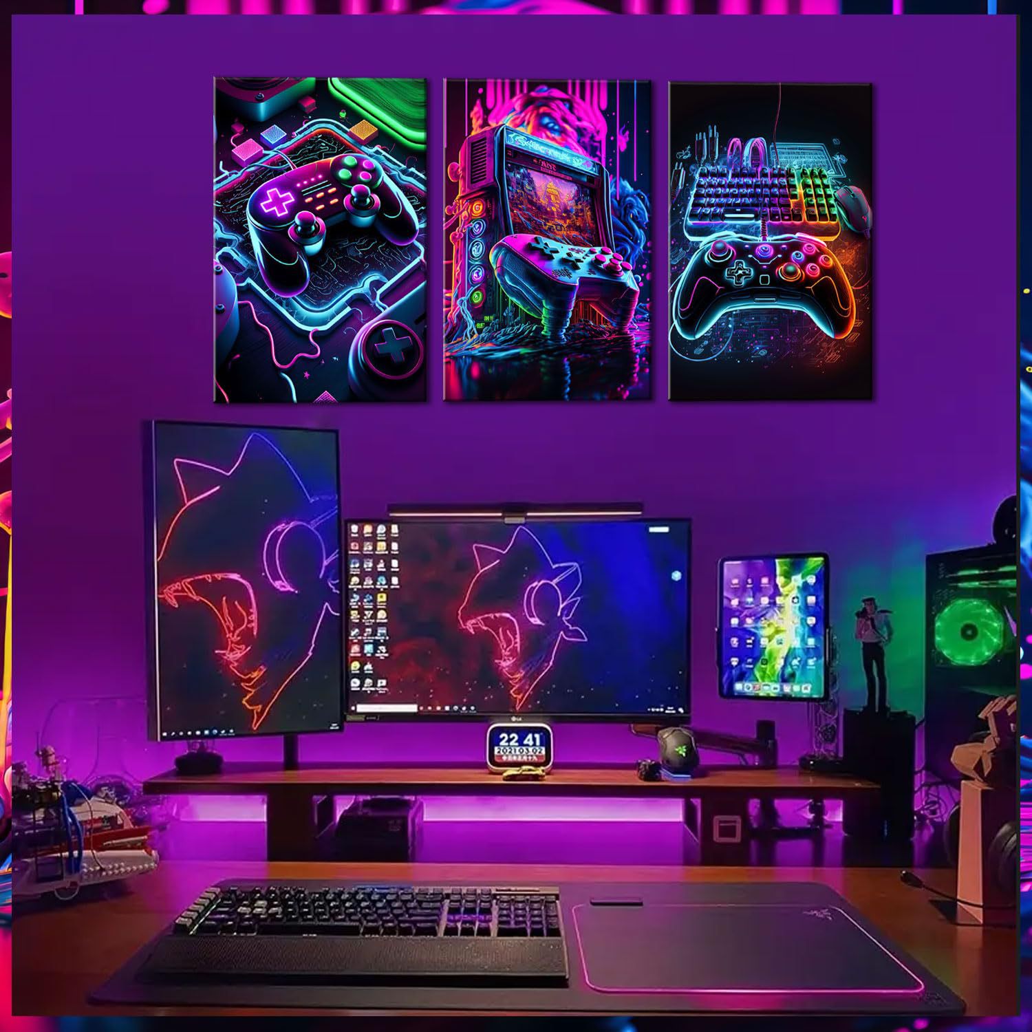 솔리드 우드 내부 프레임 게임 룸 장식 네온 라이트 게임 벽 아트 플레이어 테마 캔버스 인쇄 게임 기계 그림