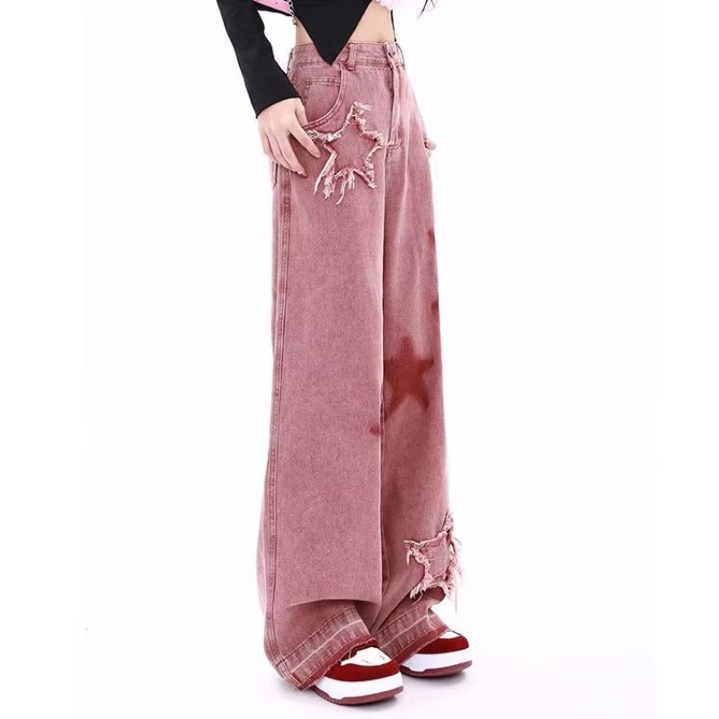 아메리칸 스타일 레트로 스타 자수 청바지 여성의 이른 가을 새 스타일 도파민 착용 높은 허리 느슨한 넓은 다리 바지스토어 가기
