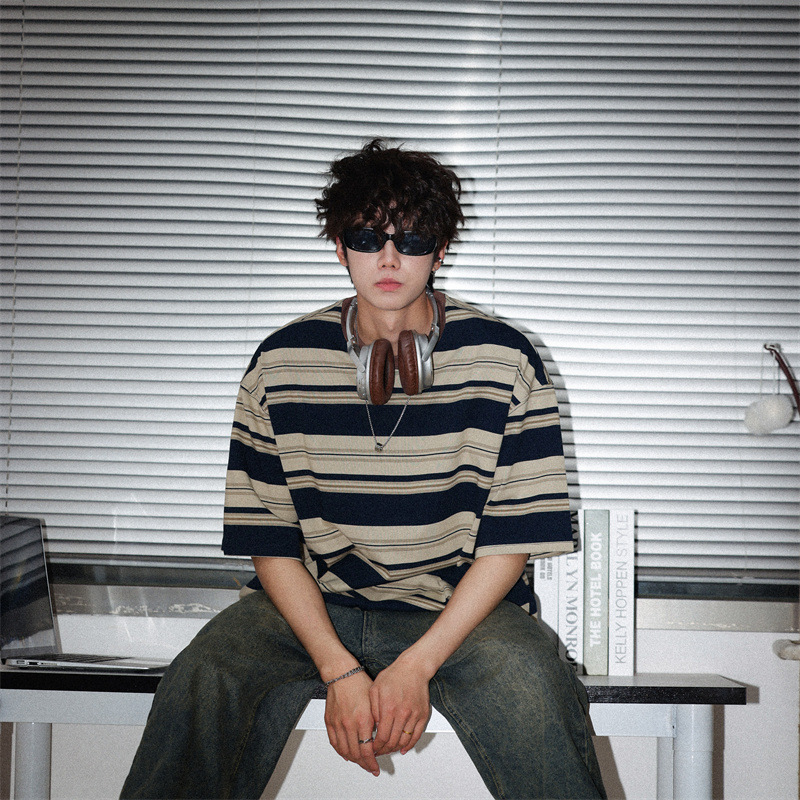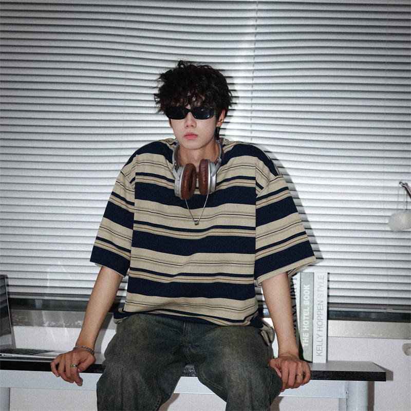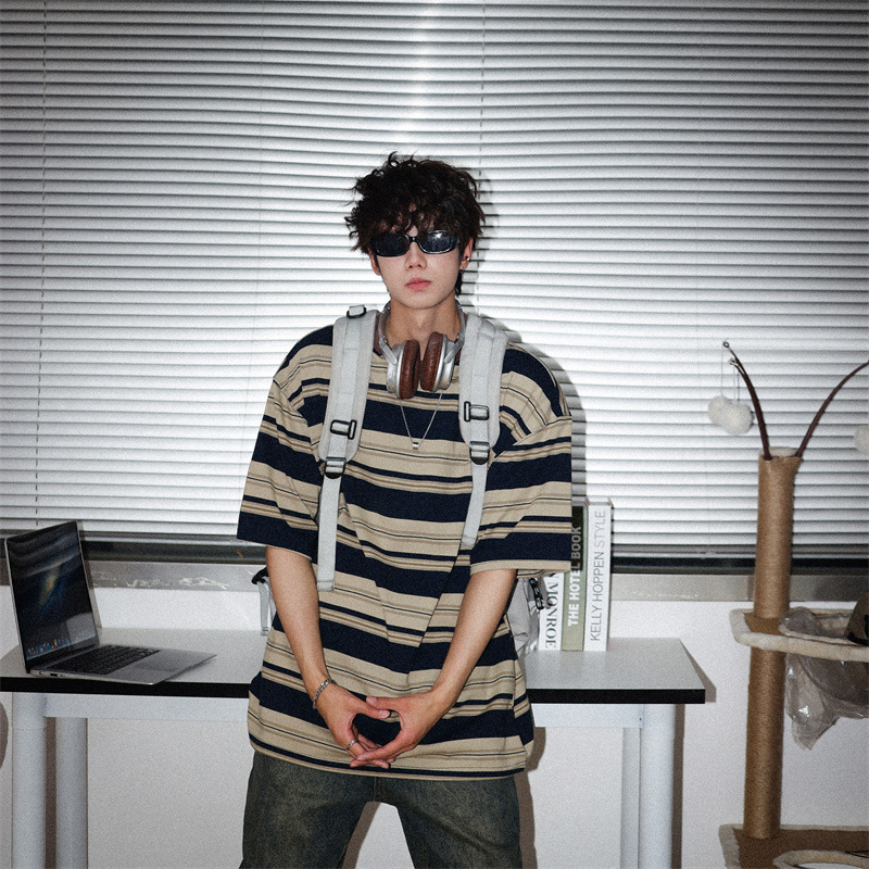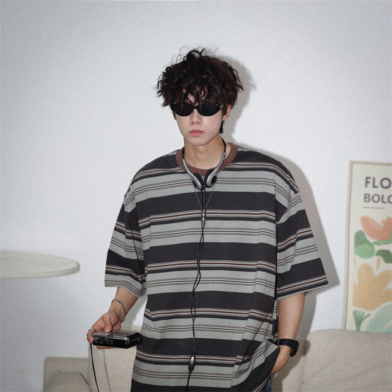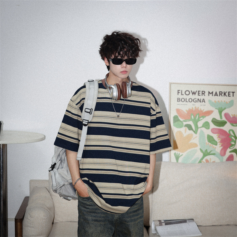 여름 컬러 매칭 스트라이프 반팔 티셔츠 남성용 트렌디 브랜드 패셔너블 아메리칸 커플 올 매치 루즈베이스 셔츠 반소매 티스토어 가기