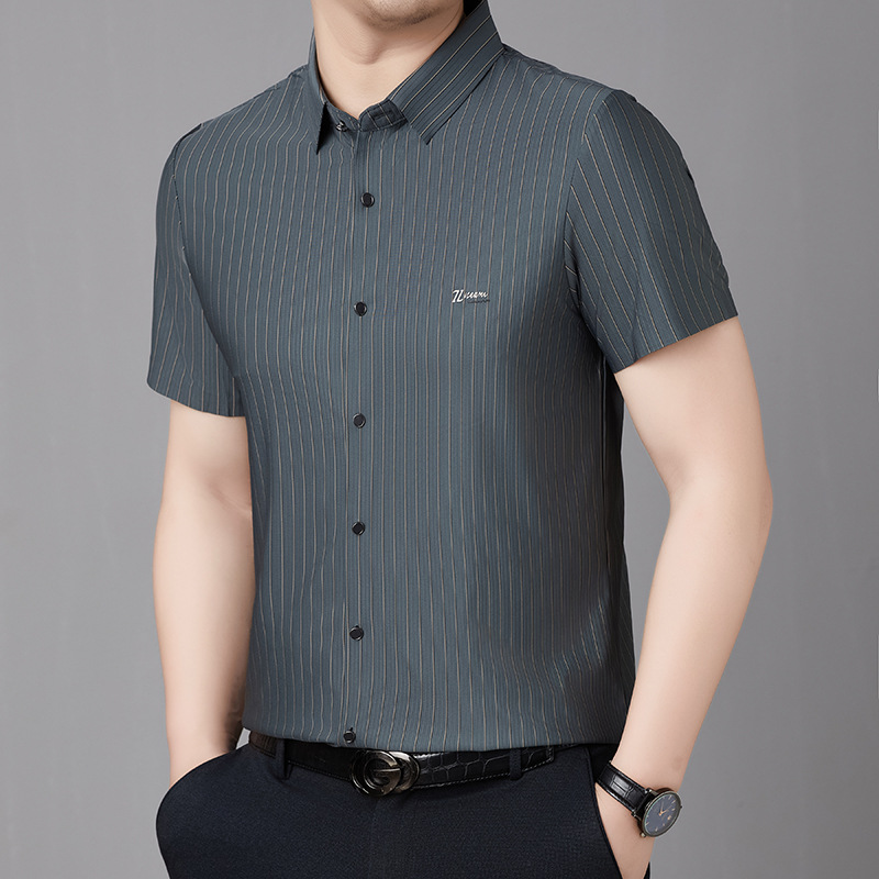 하이 엔드 젊은 남성의 새로운 원활한 핫 드릴링 스트라이프 셔츠 옷깃 짧은 소매 여름 비즈니스 캐주얼 패션 셔츠 조수