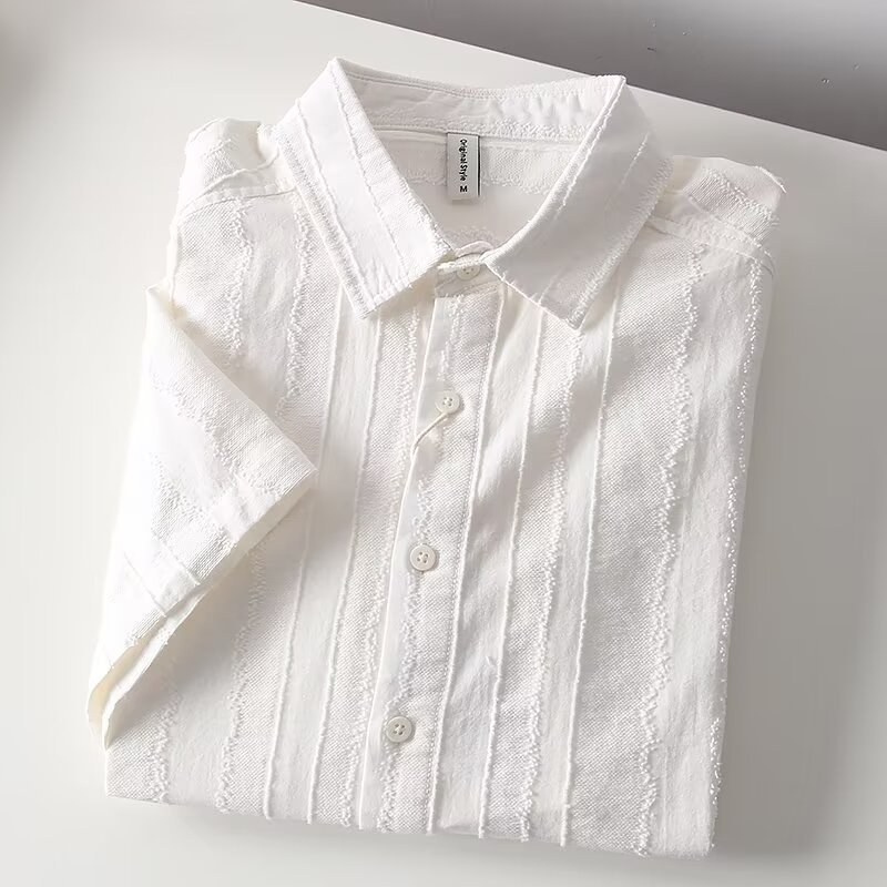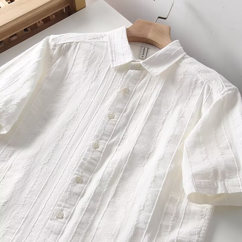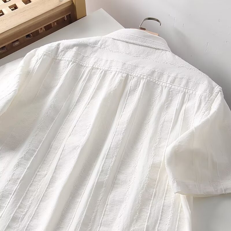 옷깃 수직 패턴 레트로 자카드 청소년 대외 무역 남자 여름 간단한 올 매치 화이트 셔츠 코튼 리넨 반팔 셔츠 트렌디스토어 가기