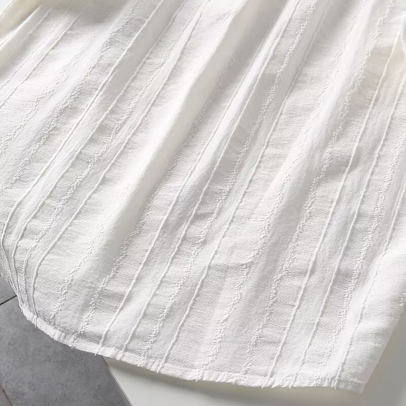 옷깃 수직 패턴 레트로 자카드 청소년 대외 무역 남자 여름 간단한 올 매치 화이트 셔츠 코튼 리넨 반팔 셔츠 트렌디
