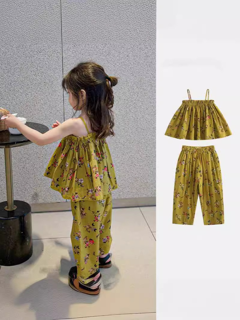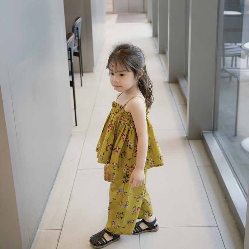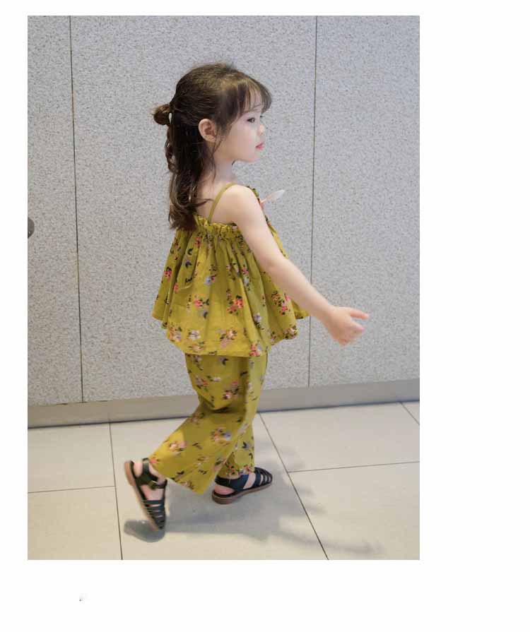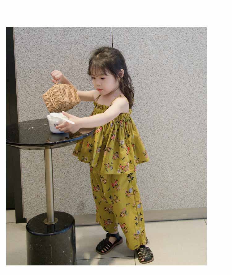 소녀 세트 여름 새로운 복고풍 컬러 꽃 캐미솔 바지 2 피스 세트 어린이를위한 머리카락 세대스토어 가기