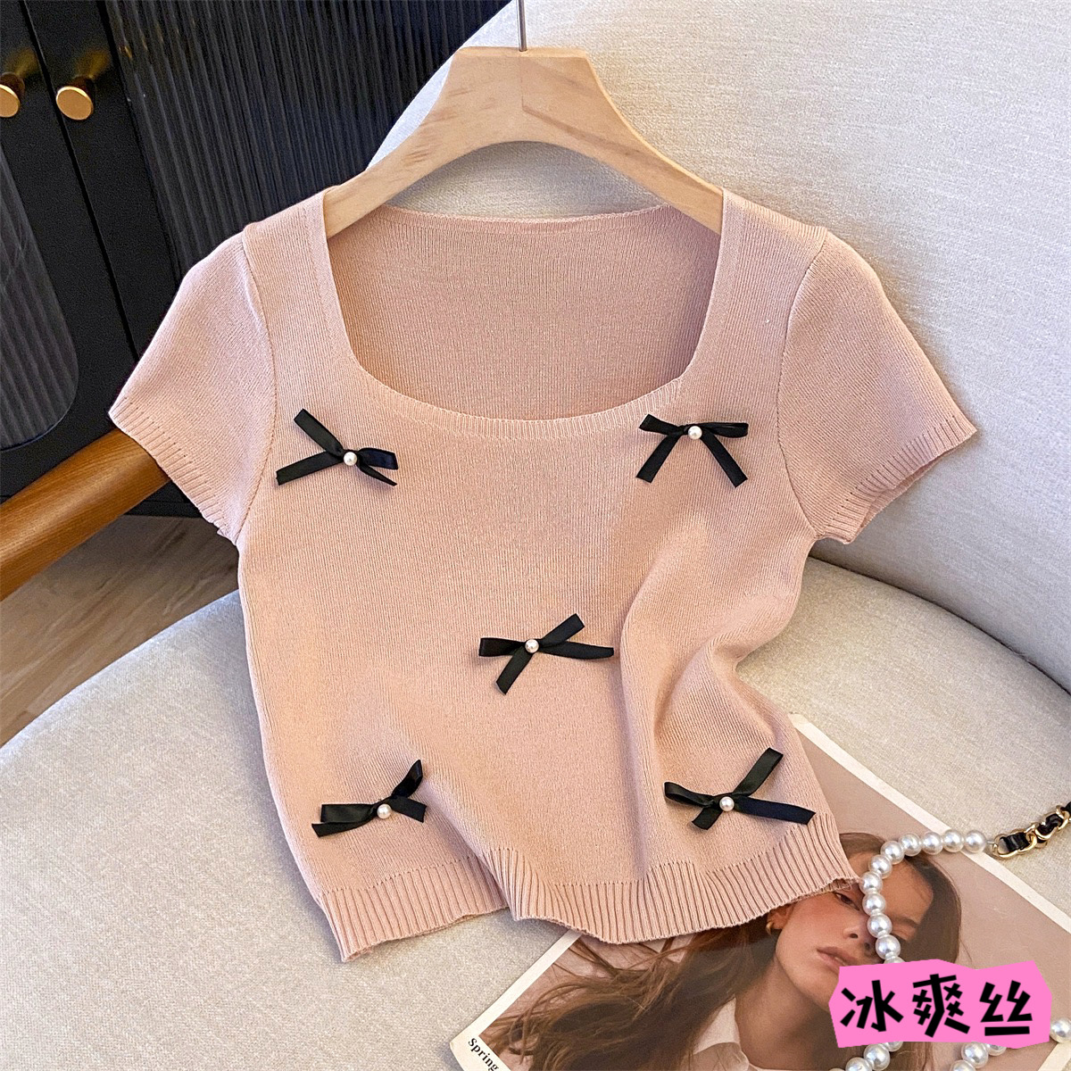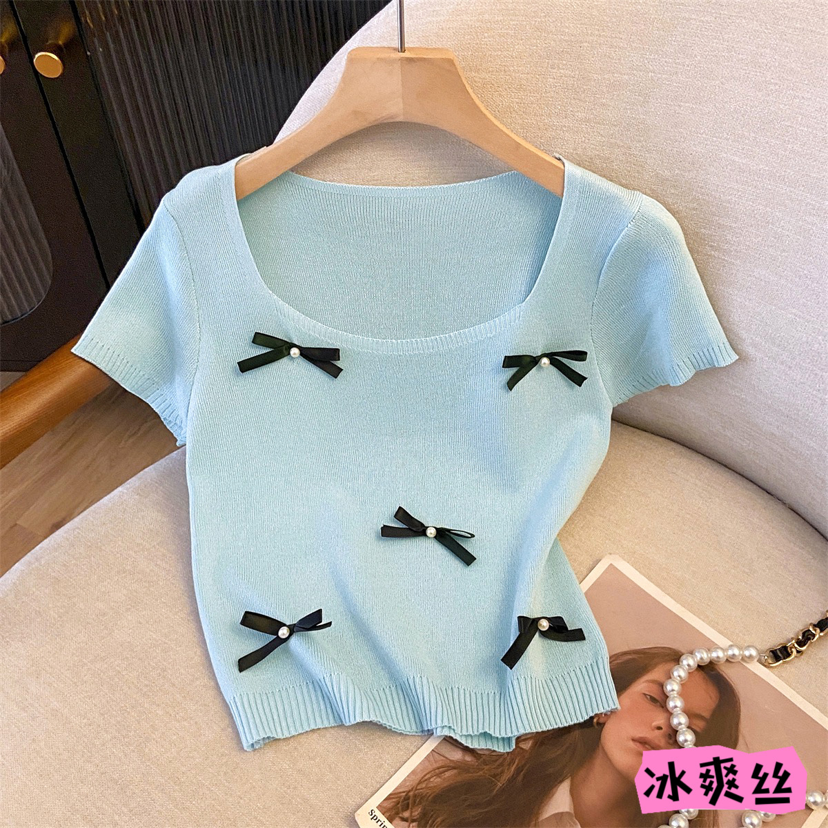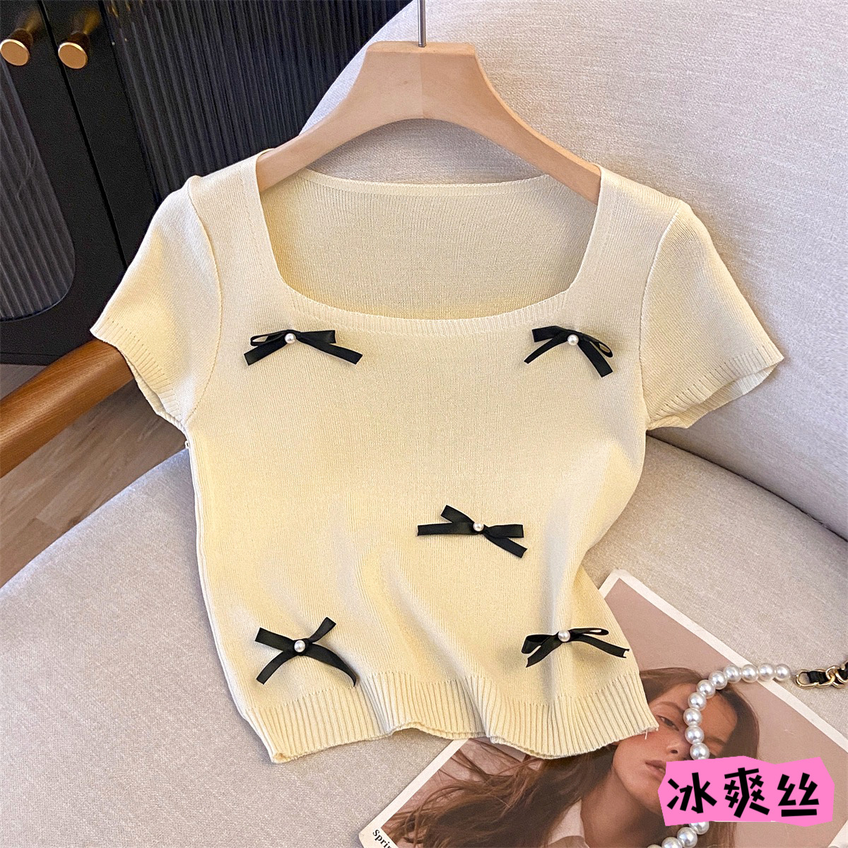 카운터, 빅 브랜드 컷 라벨 프랑스 스퀘어 칼라 반팔 니트 스웨터 탈퇴 여성 여름 활 연령 감소 쇼트 탑