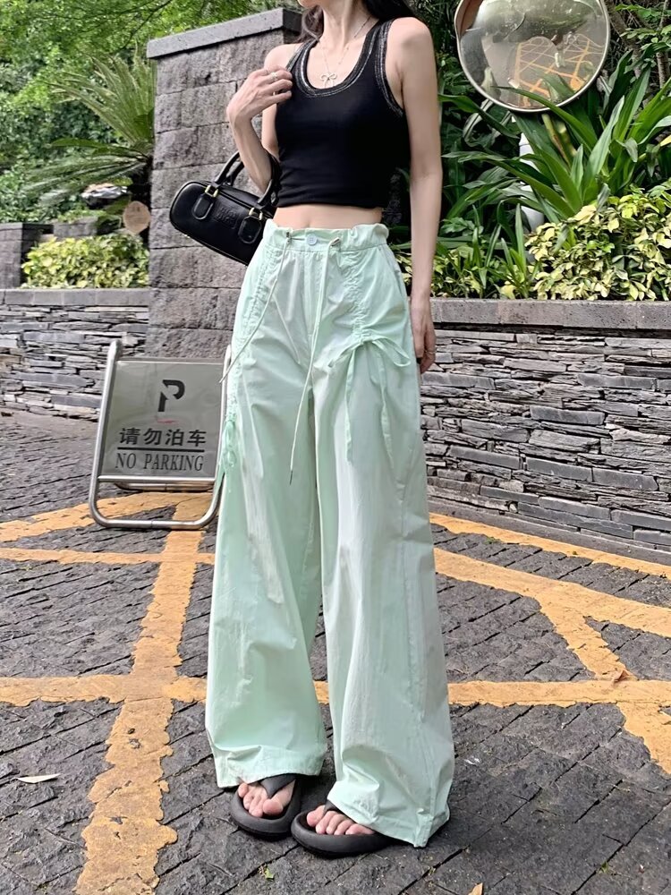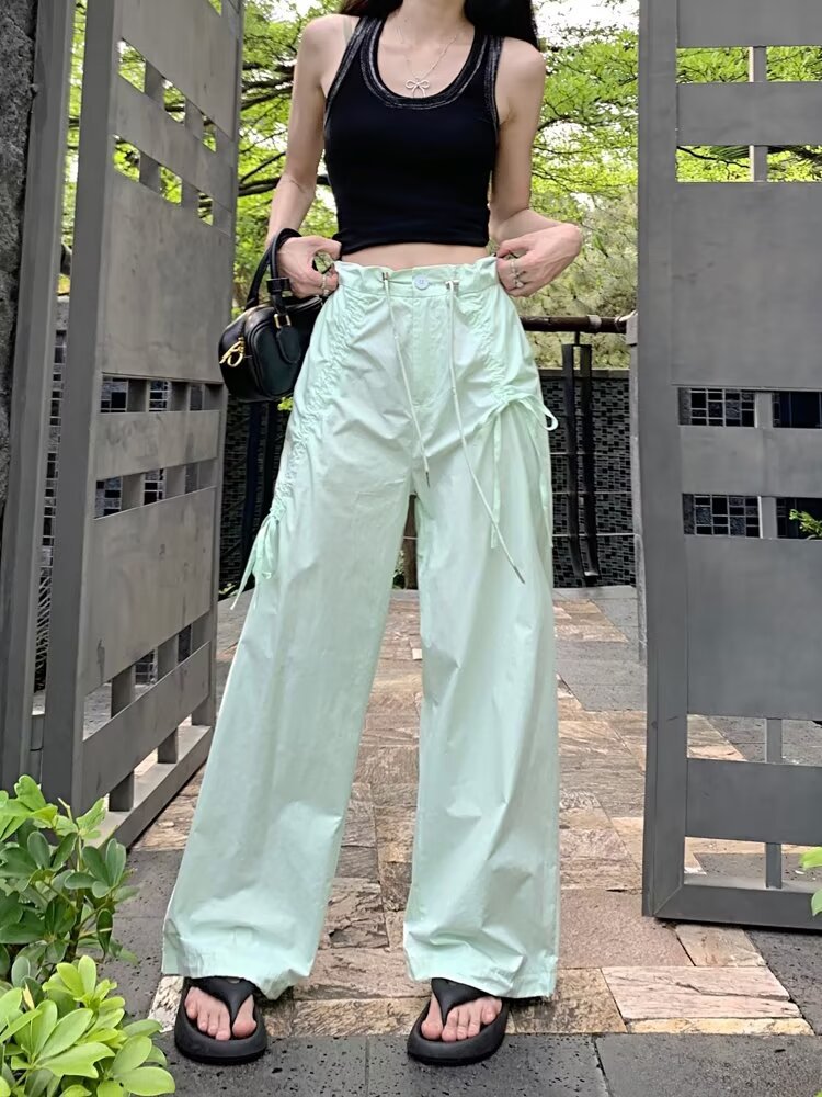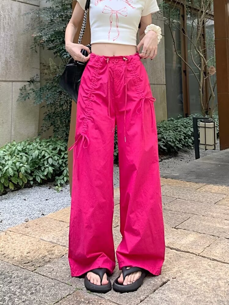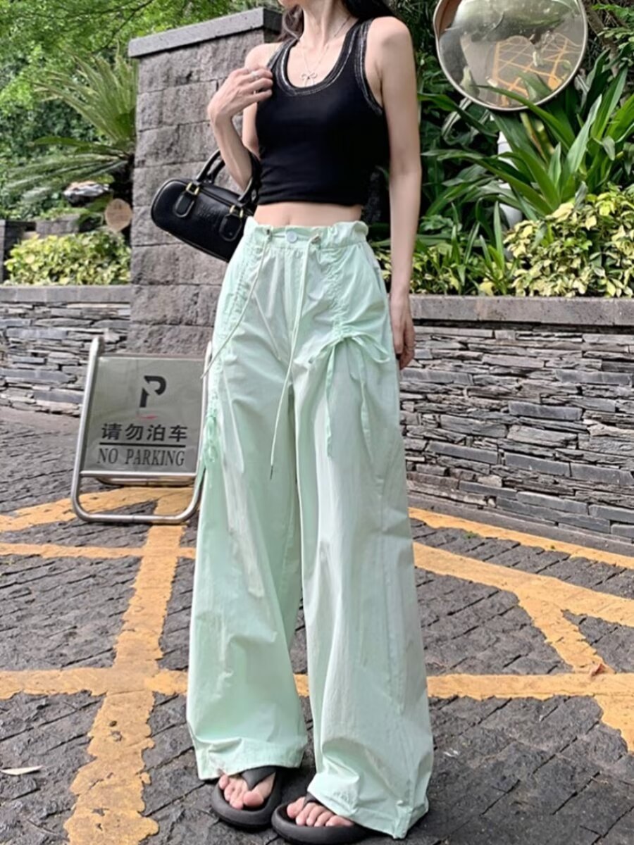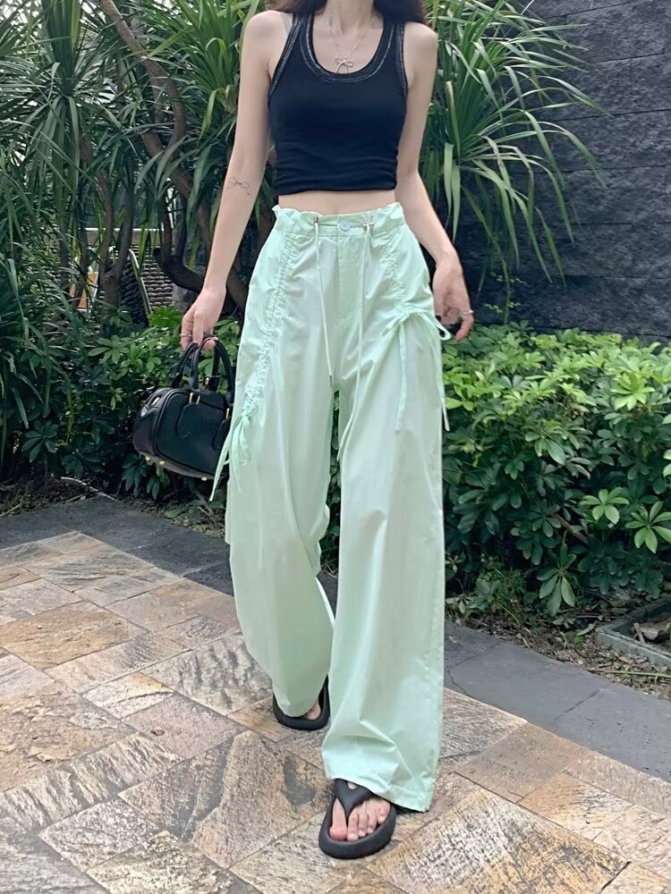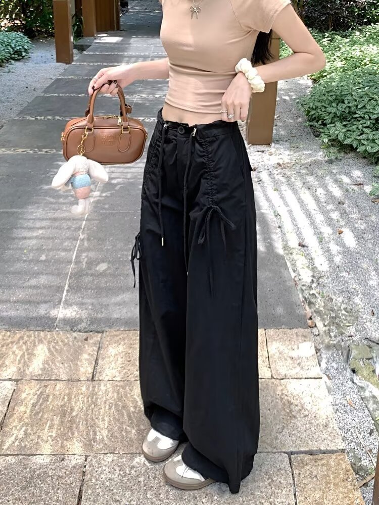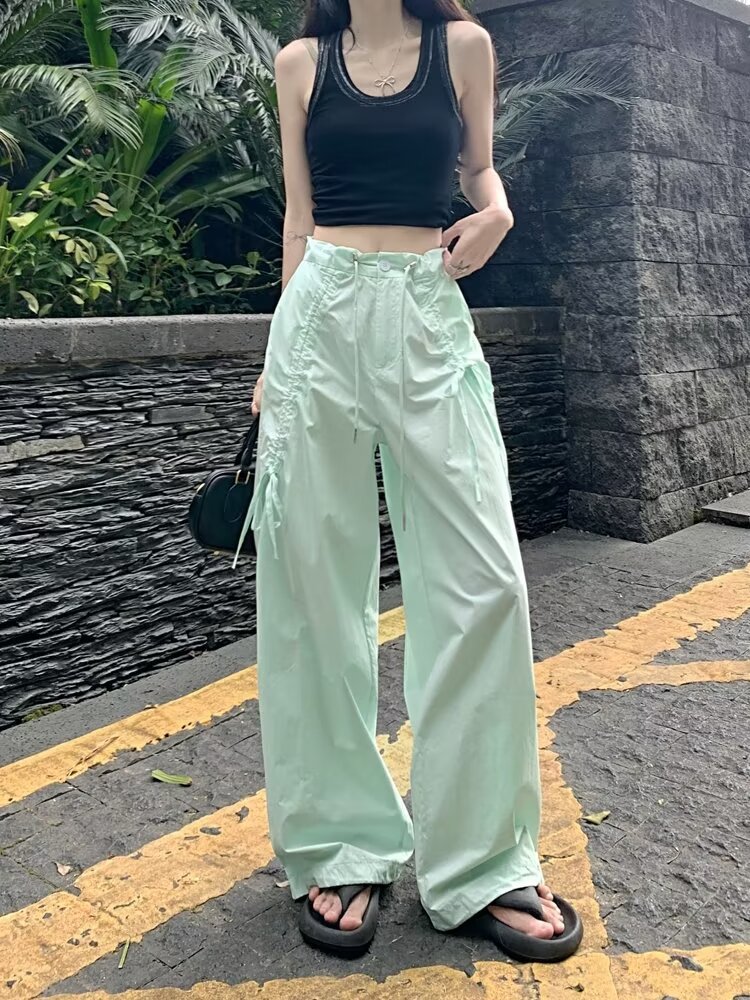 미국 스타일의 뜨거운 소녀 디자인 스트랩 오버롤 여성의 높은 허리 끈 캐주얼 바지 여름 느슨한 슬리밍 넓은 다리 긴 바지스토어 가기
