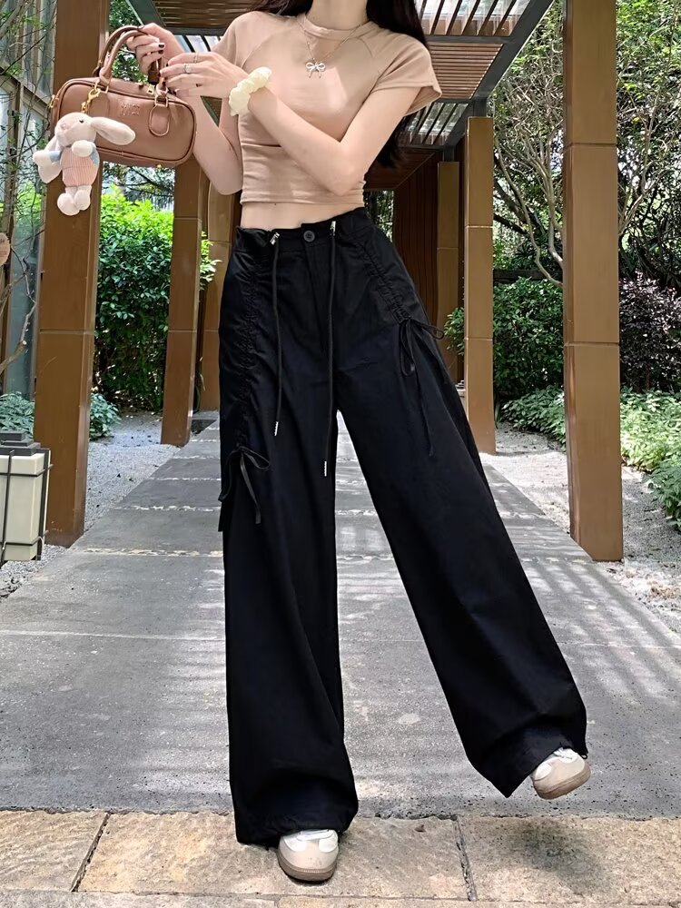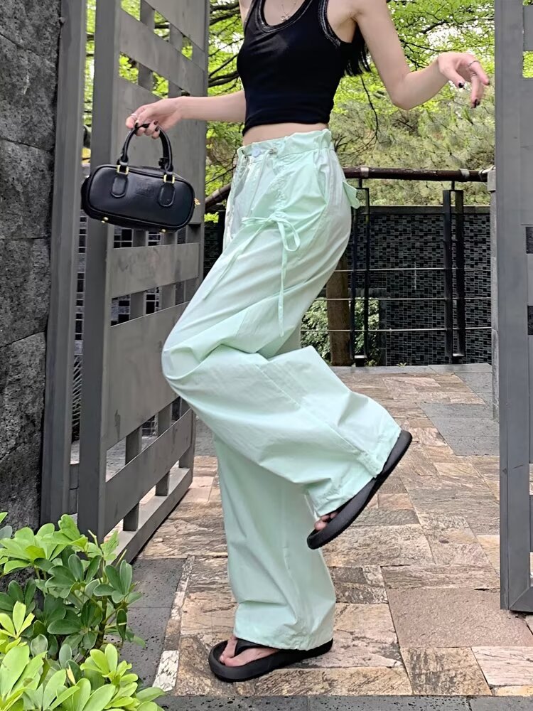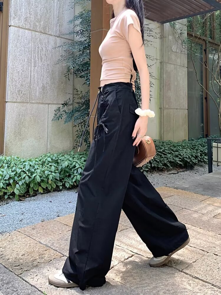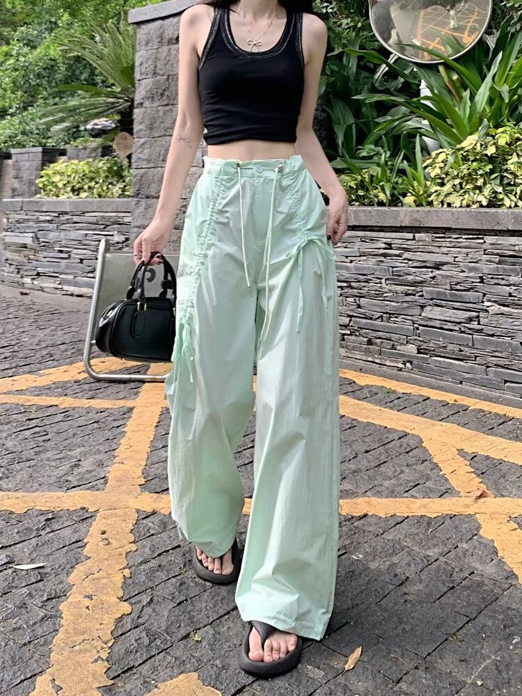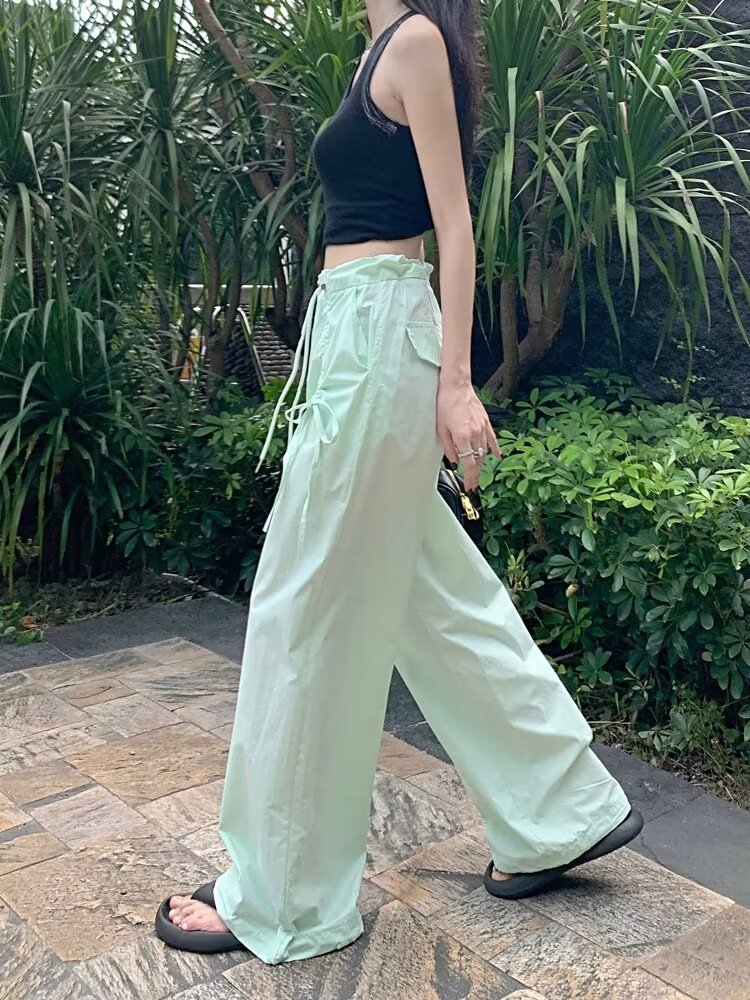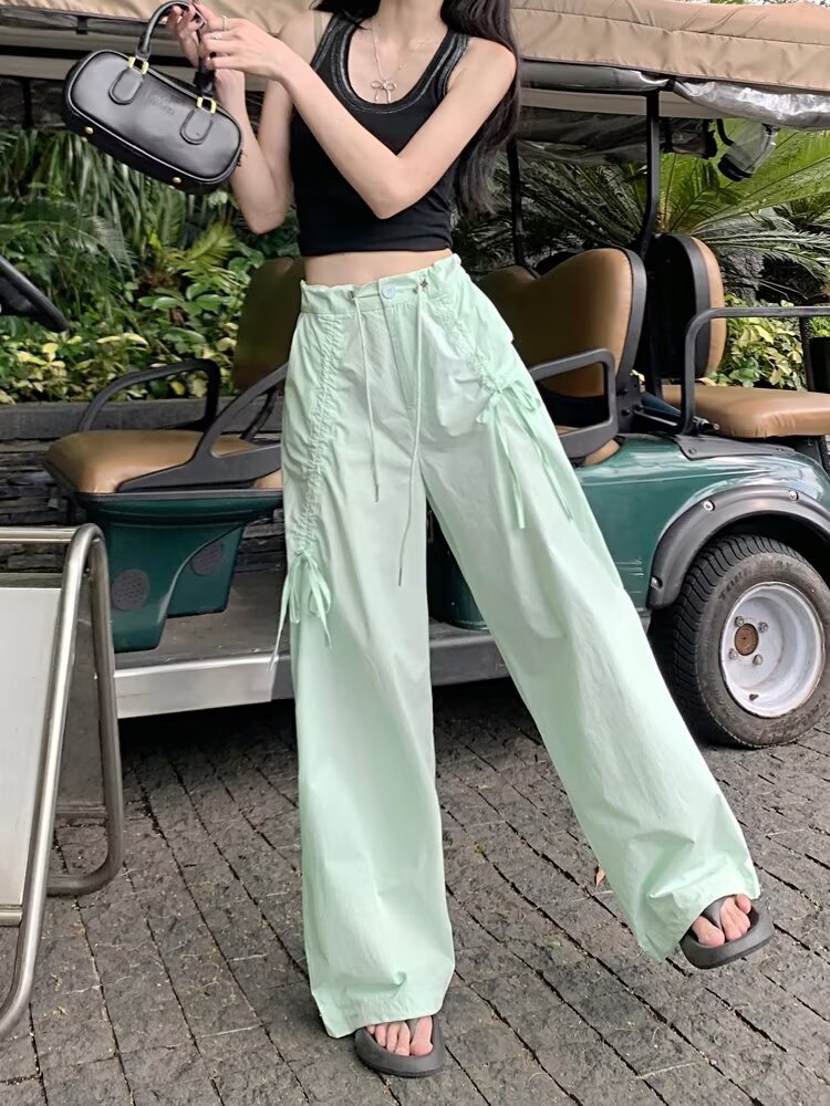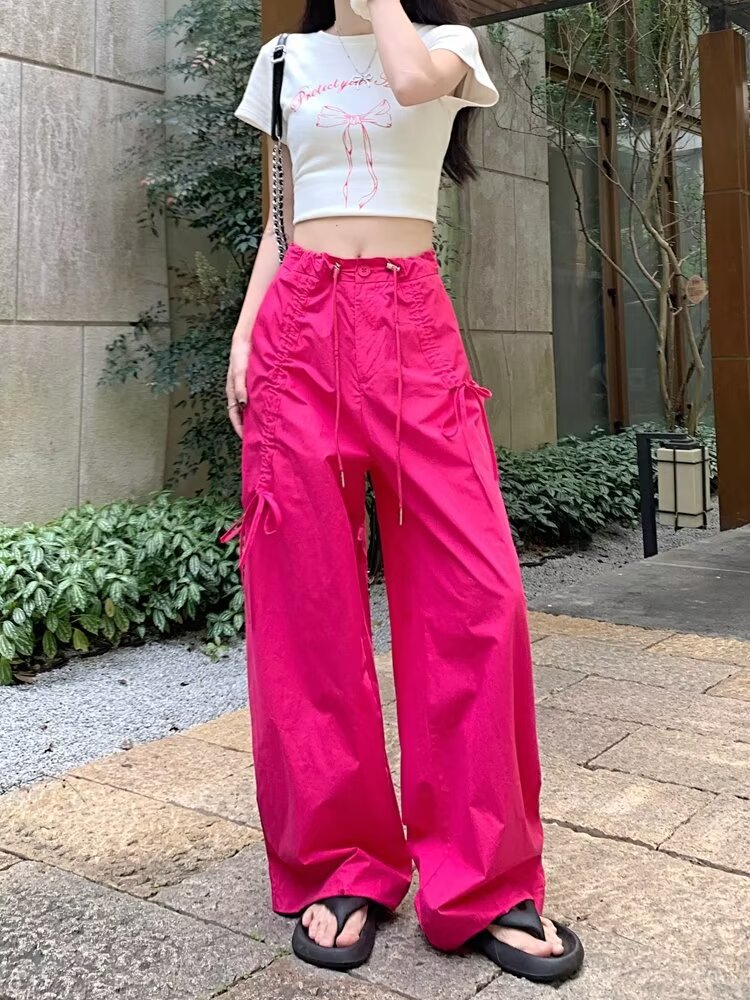 미국 스타일의 뜨거운 소녀 디자인 스트랩 오버롤 여성의 높은 허리 끈 캐주얼 바지 여름 느슨한 슬리밍 넓은 다리 긴 바지스토어 가기