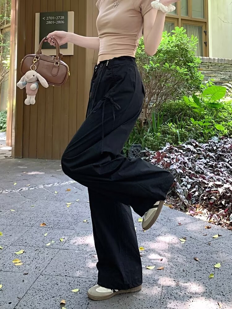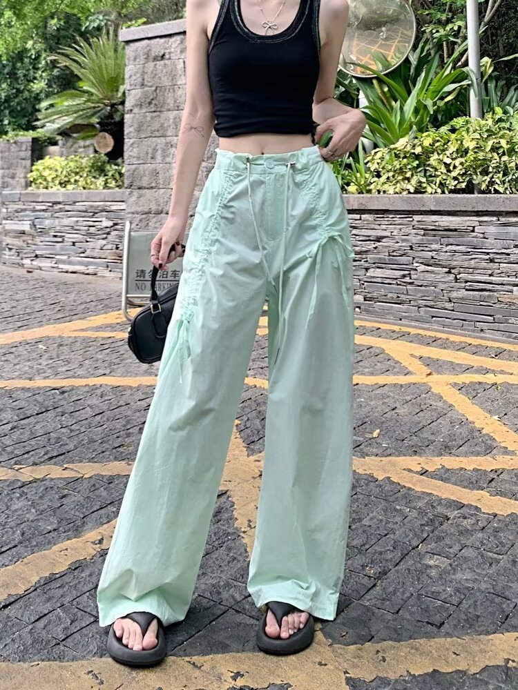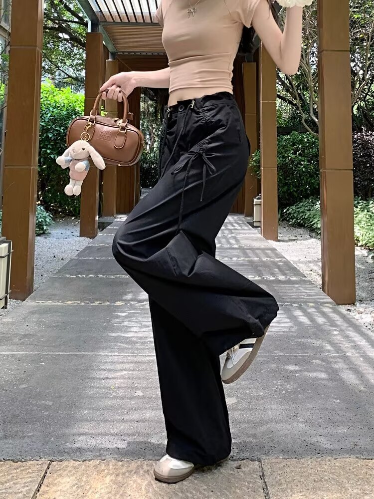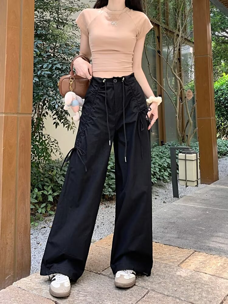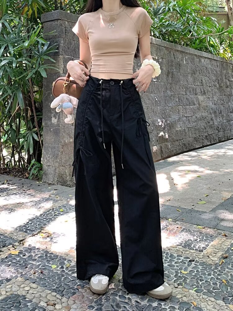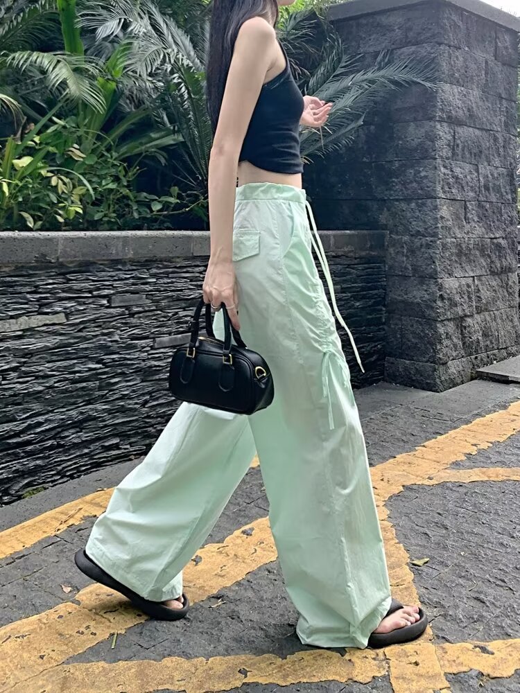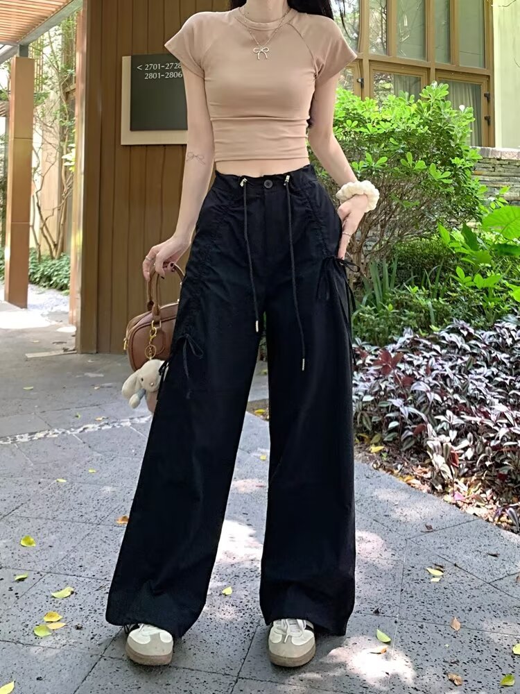 미국 스타일의 뜨거운 소녀 디자인 스트랩 오버롤 여성의 높은 허리 끈 캐주얼 바지 여름 느슨한 슬리밍 넓은 다리 긴 바지스토어 가기