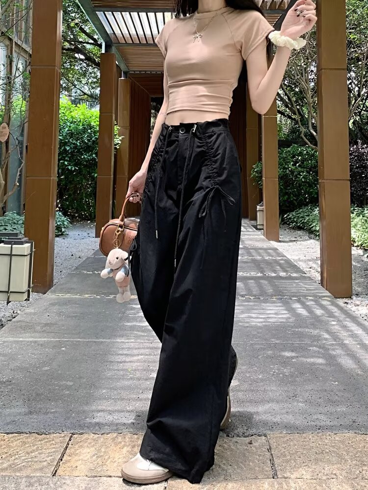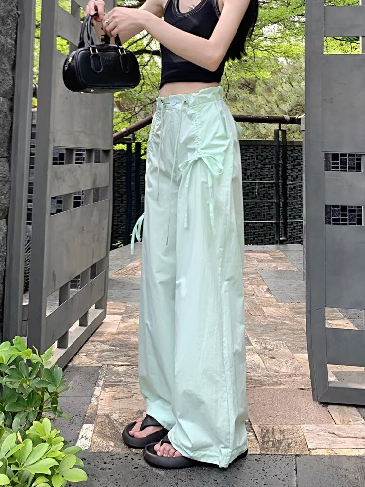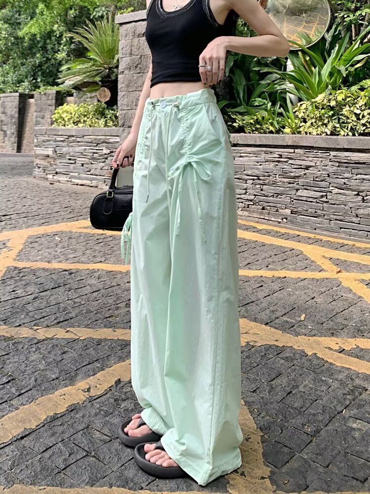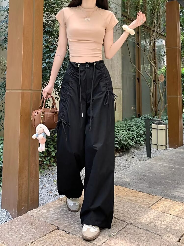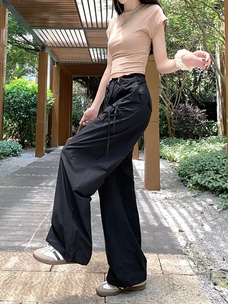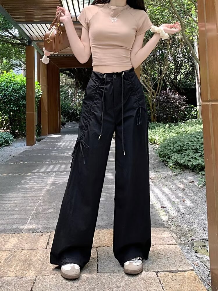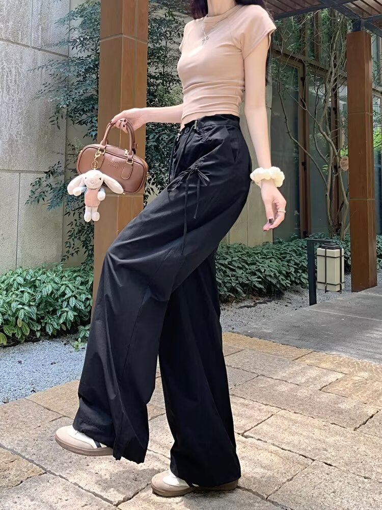 미국 스타일의 뜨거운 소녀 디자인 스트랩 오버롤 여성의 높은 허리 끈 캐주얼 바지 여름 느슨한 슬리밍 넓은 다리 긴 바지스토어 가기