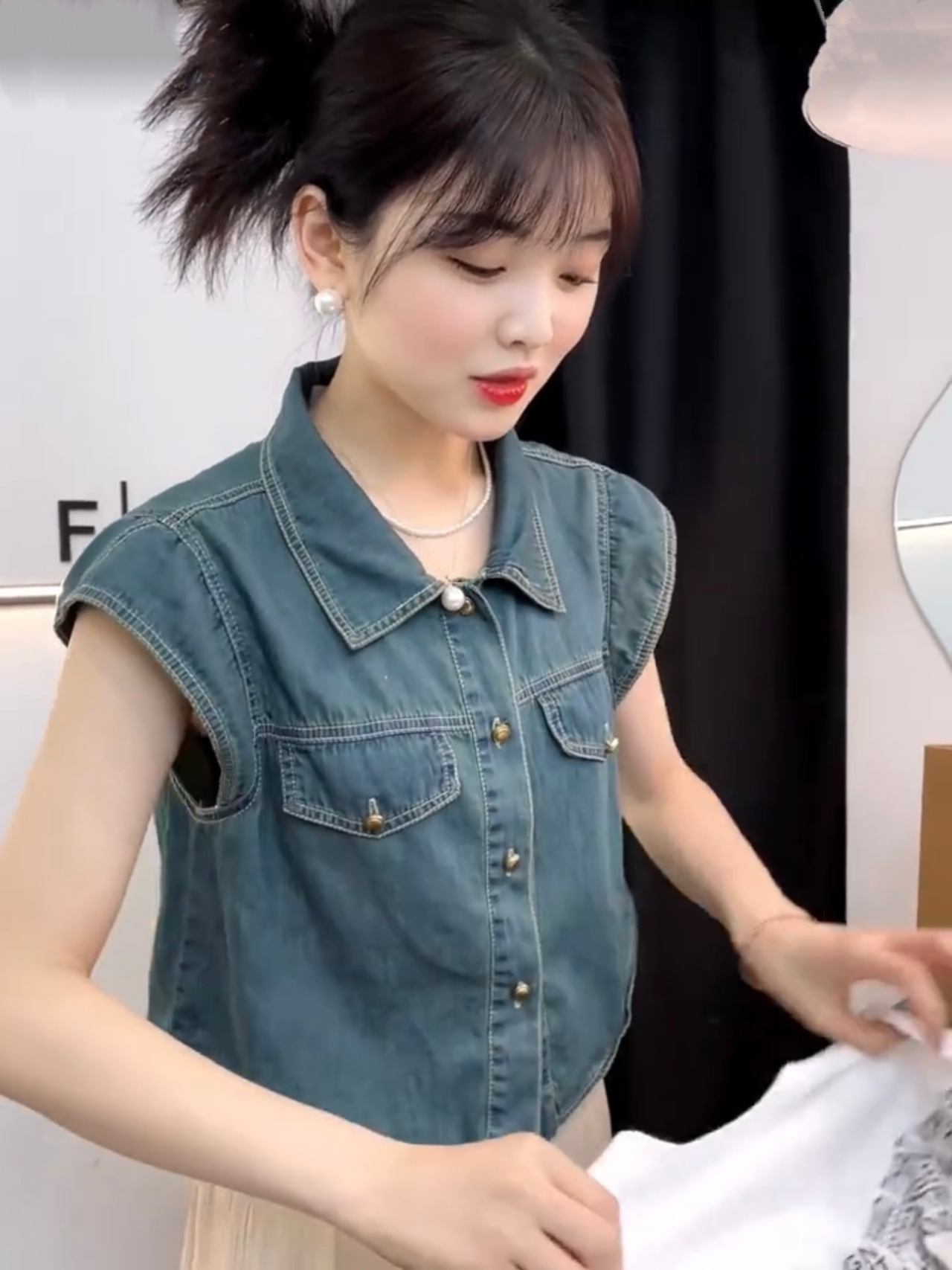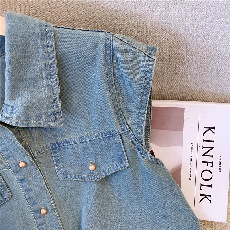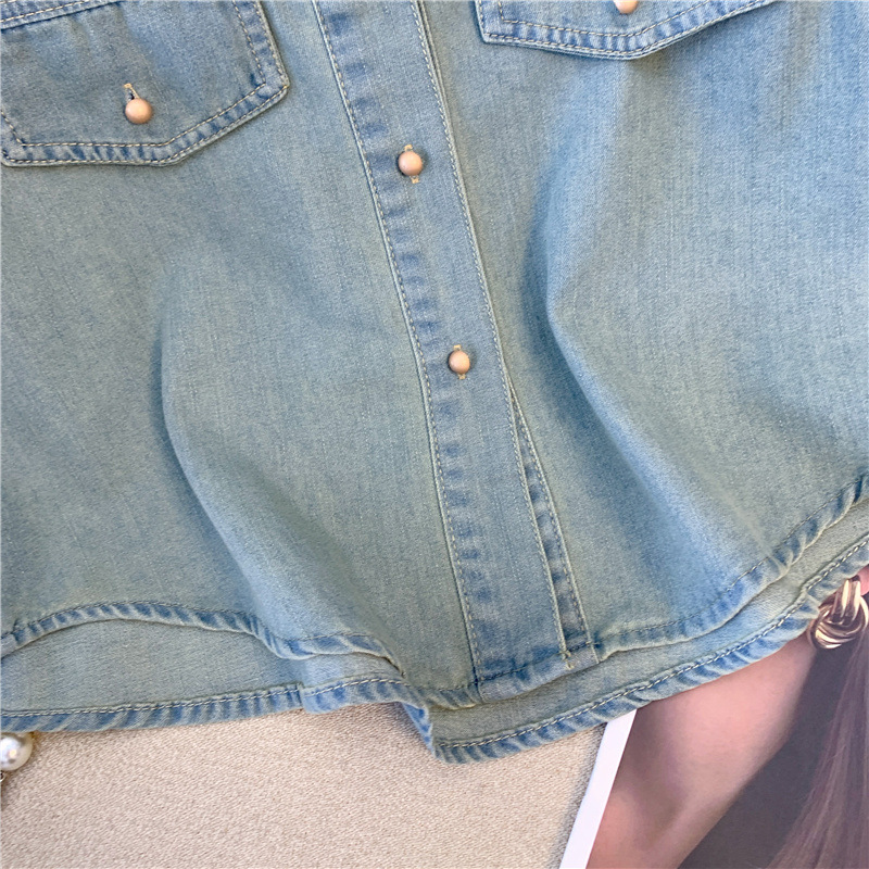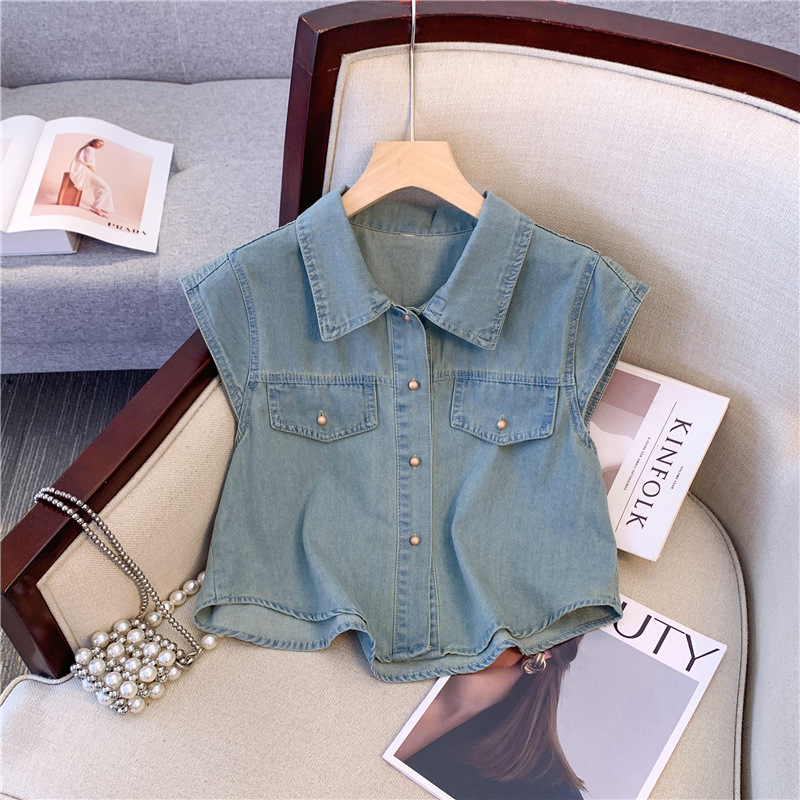 작은 데님 셔츠 여성의 여름 폴로 칼라 셔츠 재킷 디자인 센스 작은 비행 소매 불규칙한 짧은 탑스토어 가기