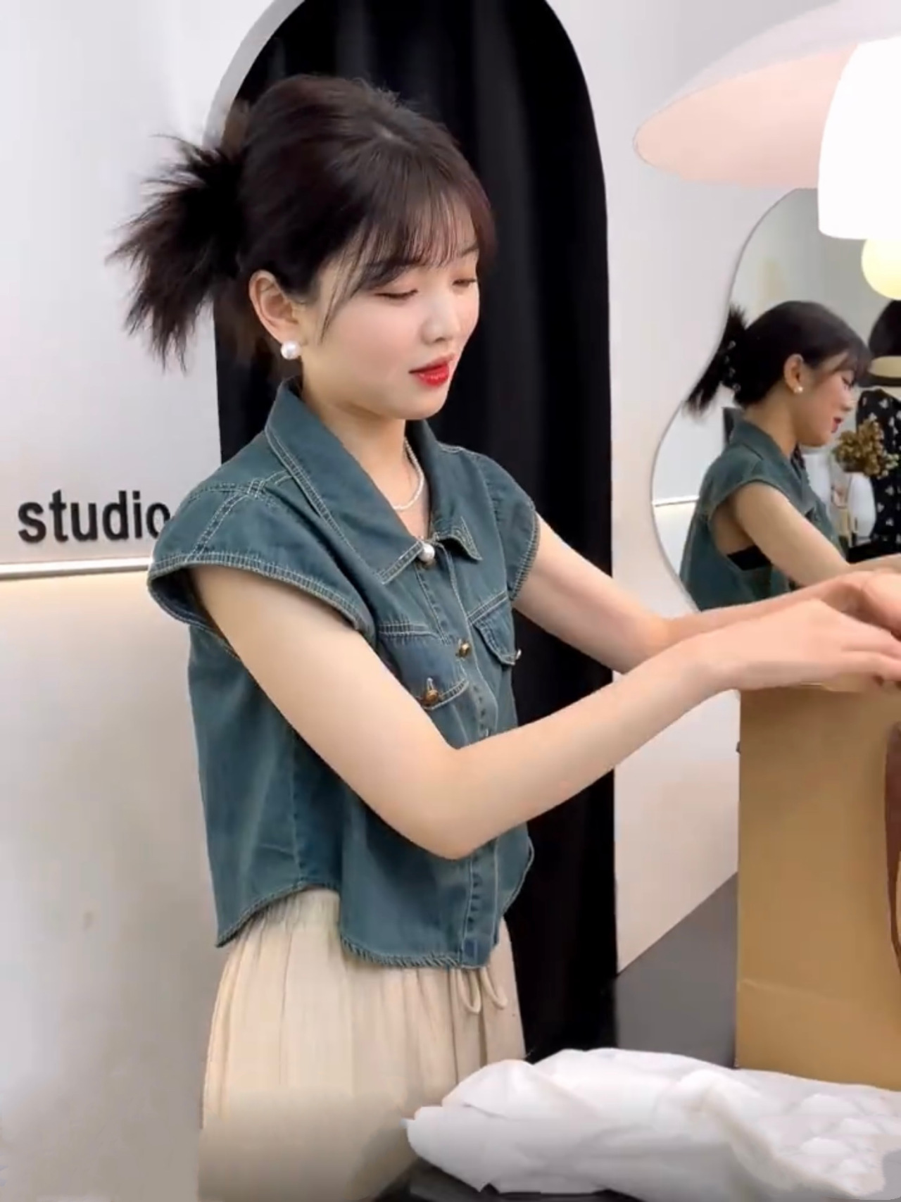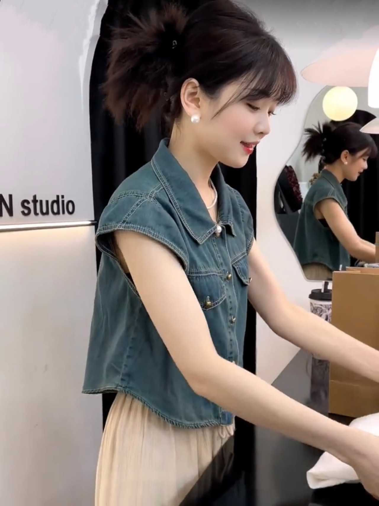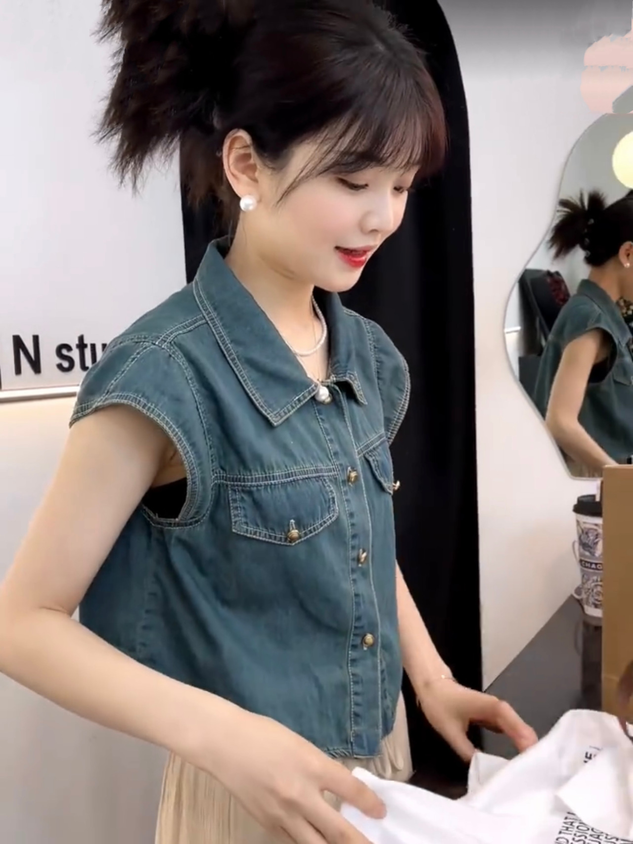 작은 데님 셔츠 여성의 여름 폴로 칼라 셔츠 재킷 디자인 센스 작은 비행 소매 불규칙한 짧은 탑스토어 가기