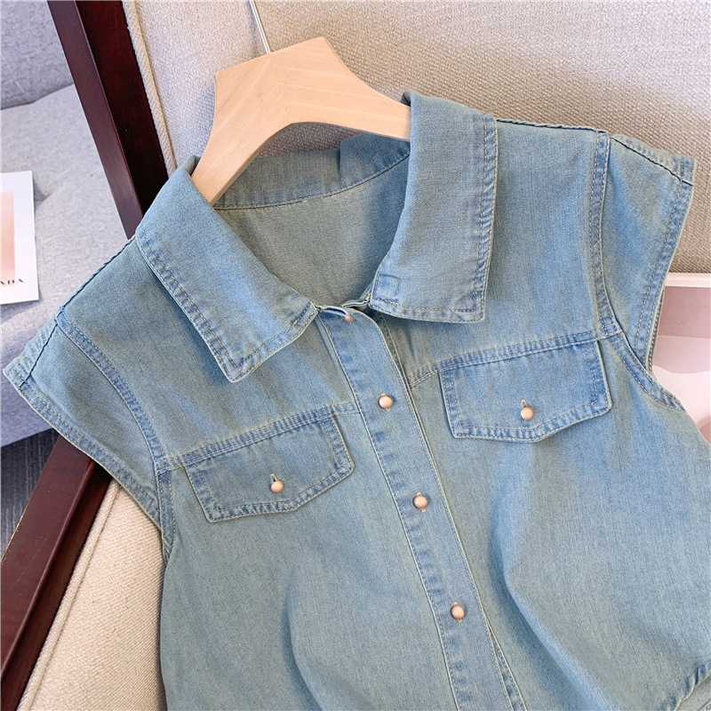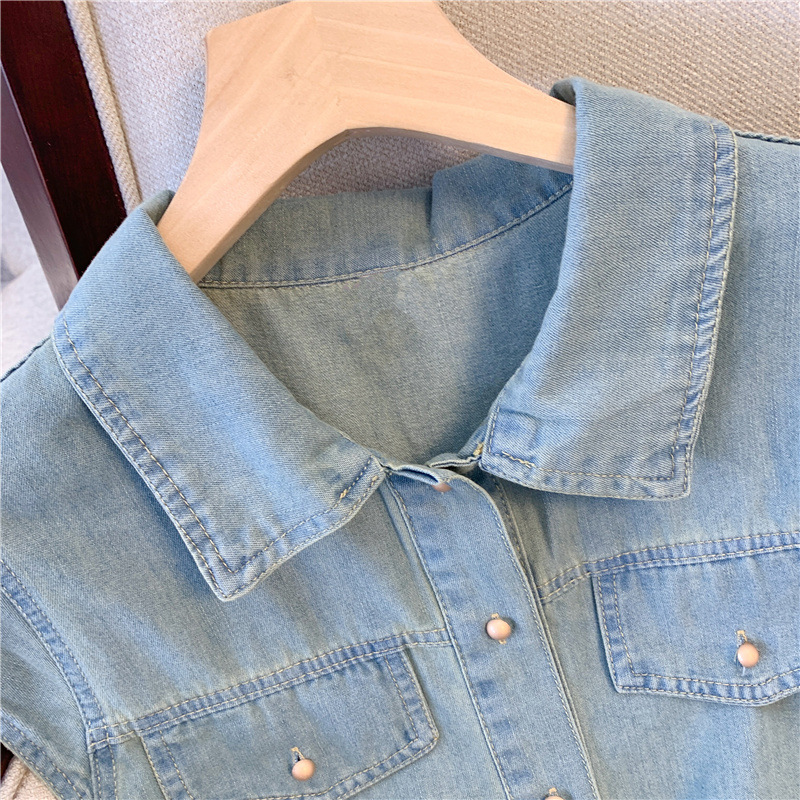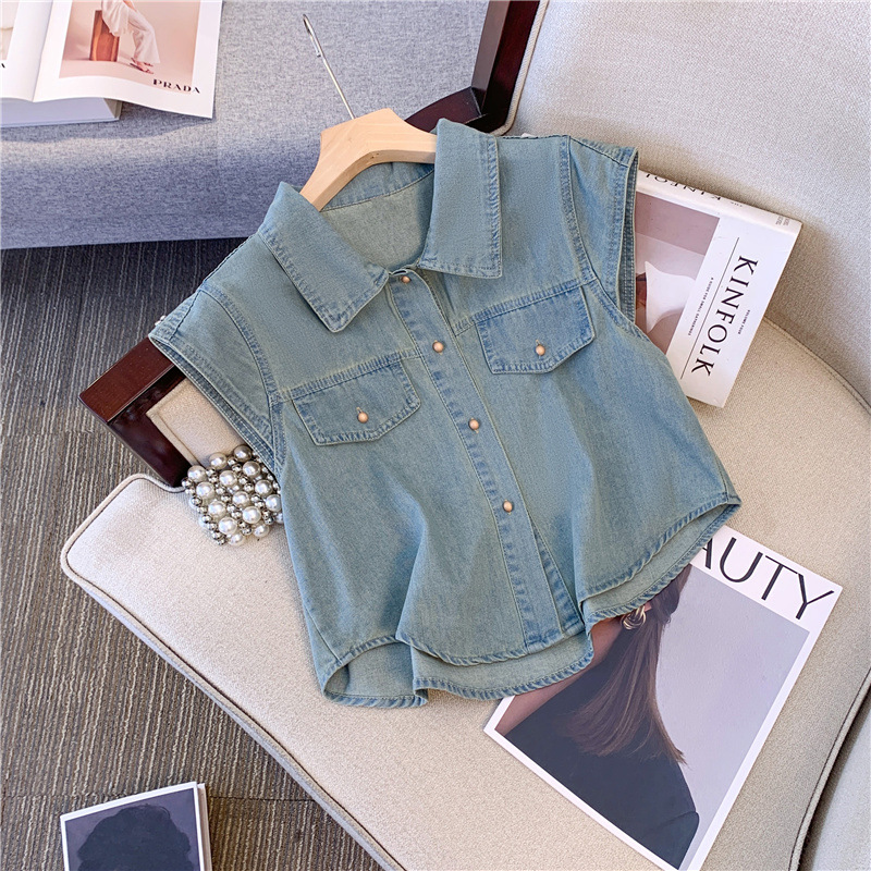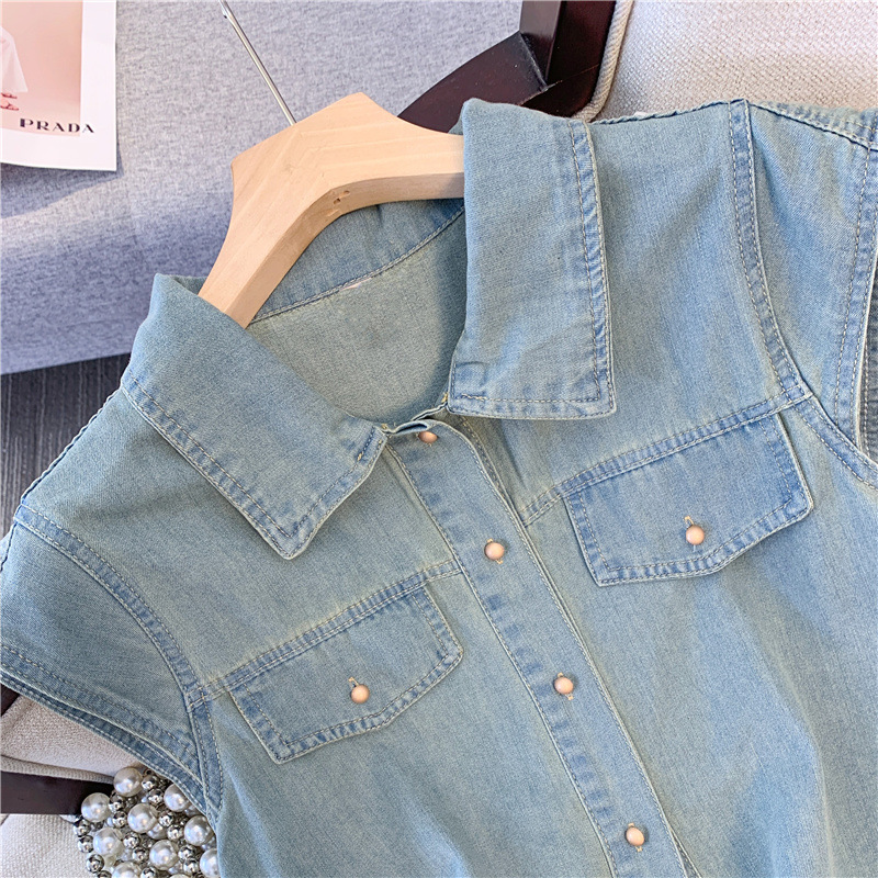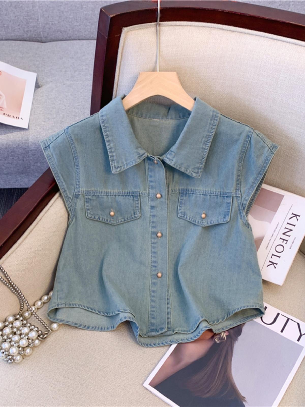 작은 데님 셔츠 여성의 여름 폴로 칼라 셔츠 재킷 디자인 센스 작은 비행 소매 불규칙한 짧은 탑