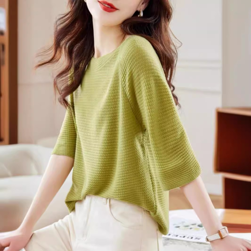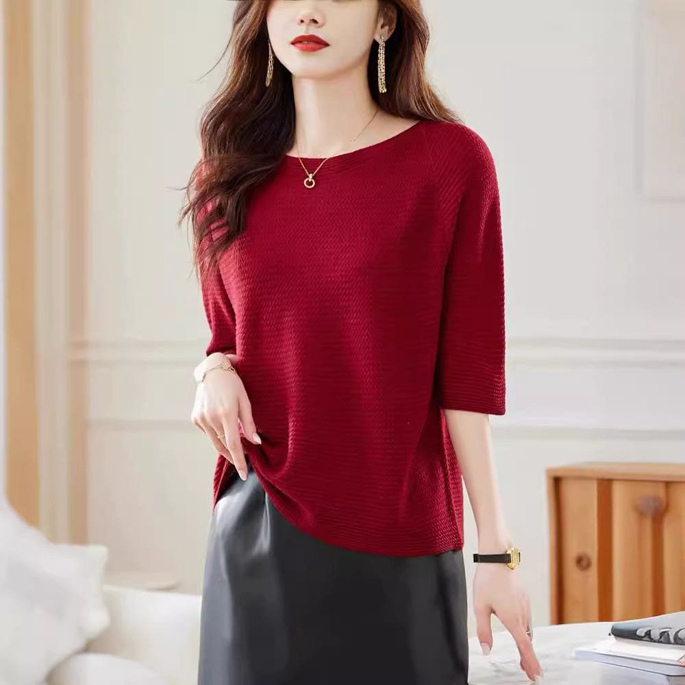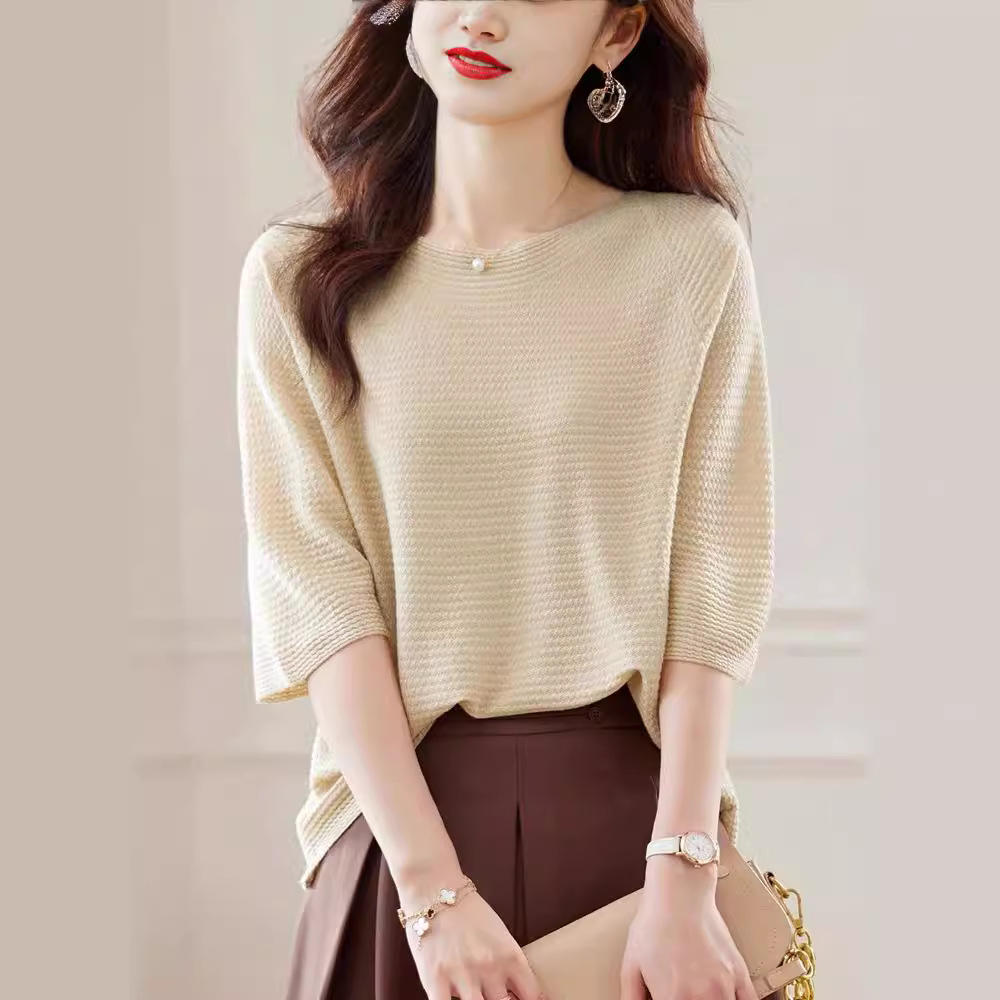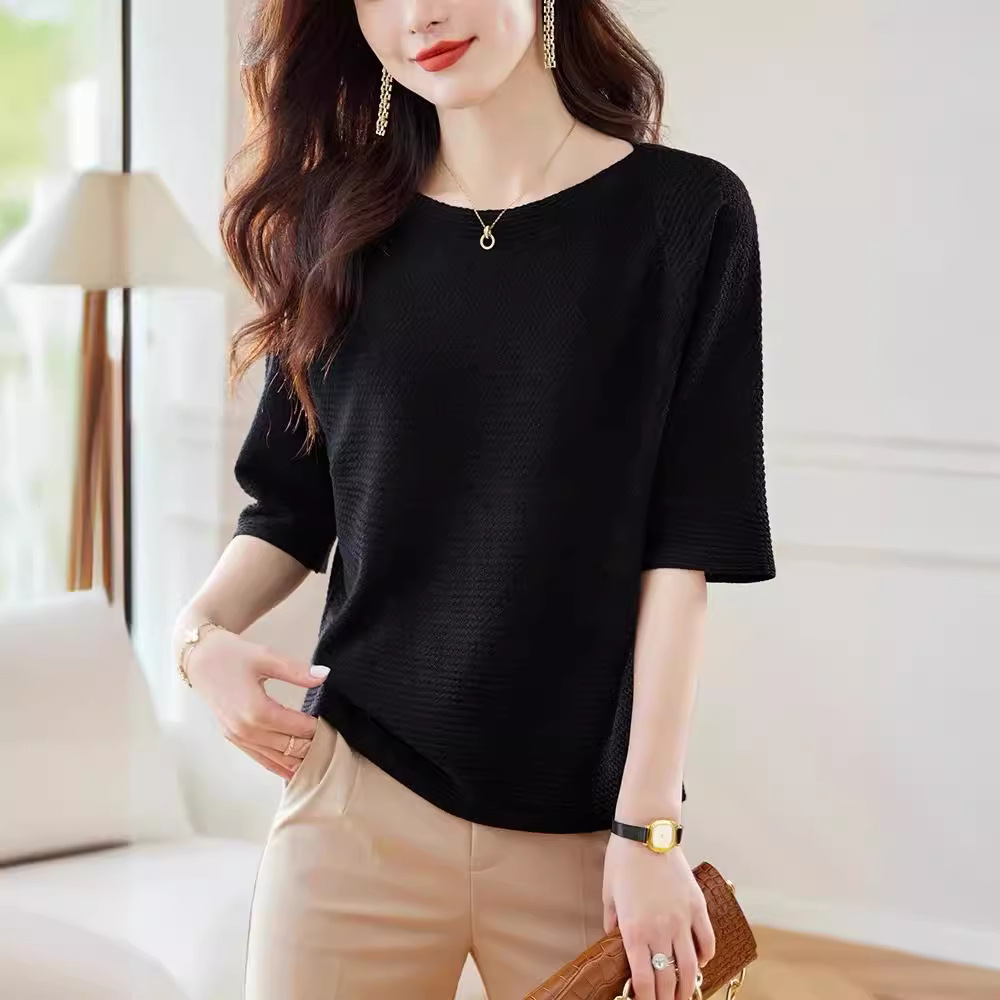 한 캐릭터 칼라 미드 슬리브 스웨터 탑 여성 초가을 2024 새로운 도착 세븐 슬리브 티셔츠 세련된 스타일리시한베이스 레이어 셔츠