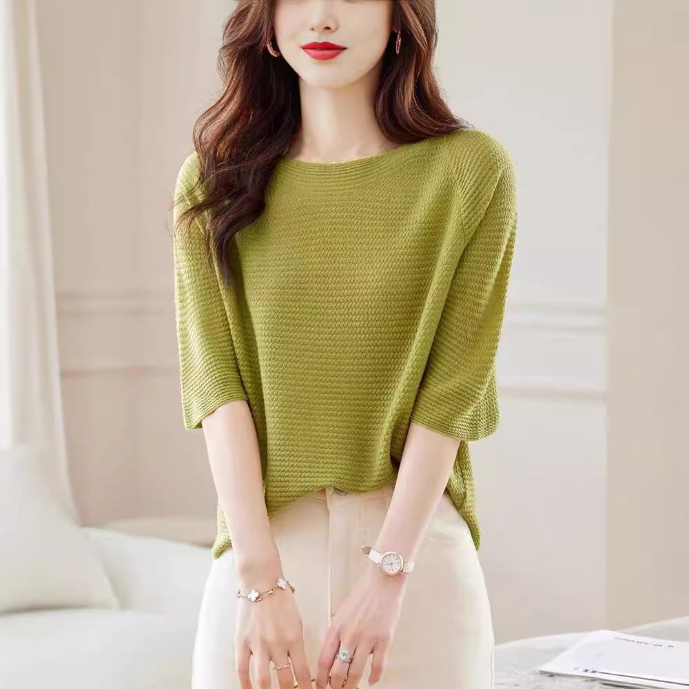 한 캐릭터 칼라 미드 슬리브 스웨터 탑 여성 초가을 2024 새로운 도착 세븐 슬리브 티셔츠 세련된 스타일리시한베이스 레이어 셔츠스토어 가기