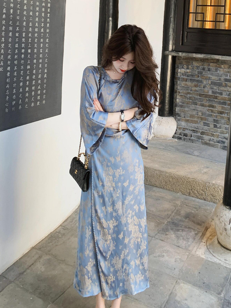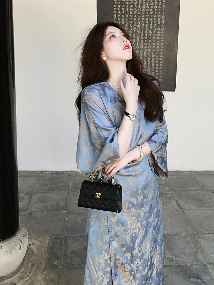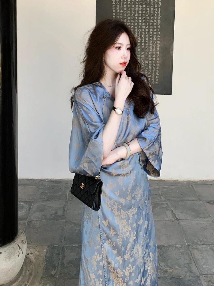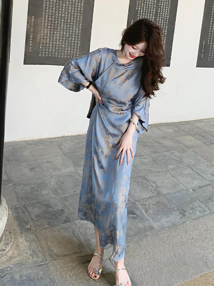 YT346197 새로운 여름 새로운 중국 스타일 빛 Guofeng Zen 스타일 여성 의류 블루 Acetic Acid Floral 수정 청삼 원피스스토어 가기