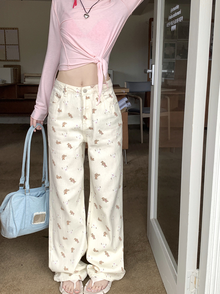 도파민 소녀 베이지 베어 프린트 청바지 여성용 여름 플러스 사이즈 높은 허리 느슨한 넓은 다리 마이크로 경적 바지