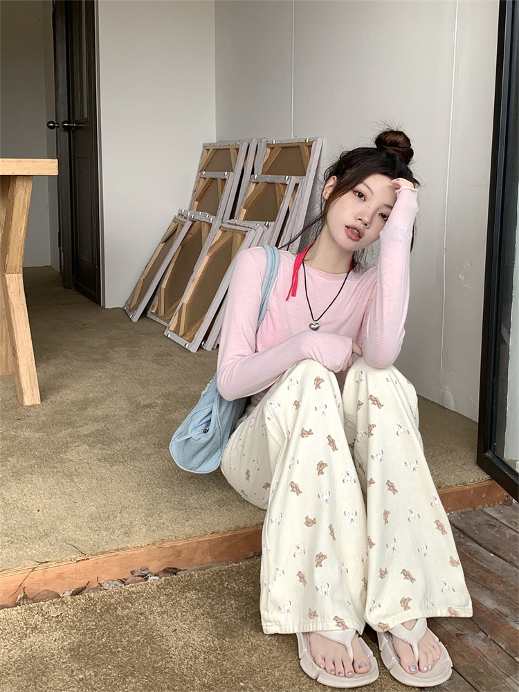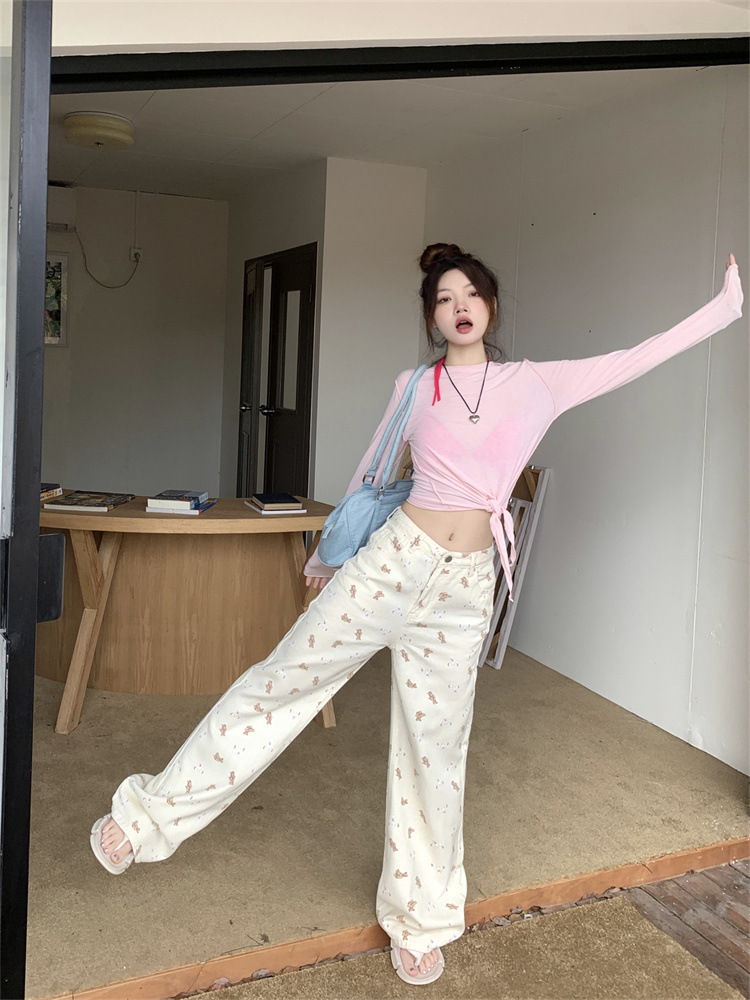 도파민 소녀 베이지 베어 프린트 청바지 여성용 여름 플러스 사이즈 높은 허리 느슨한 넓은 다리 마이크로 경적 바지스토어 가기