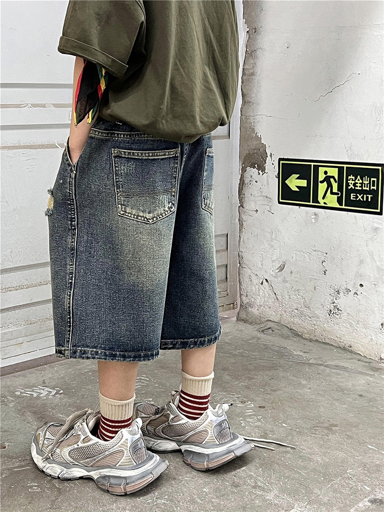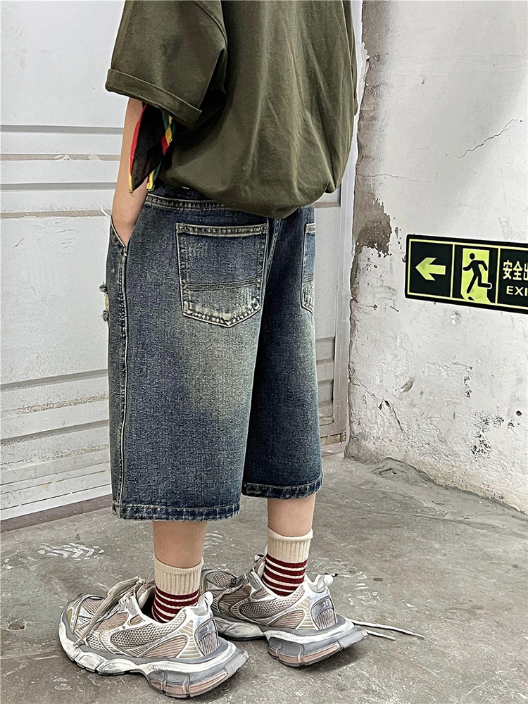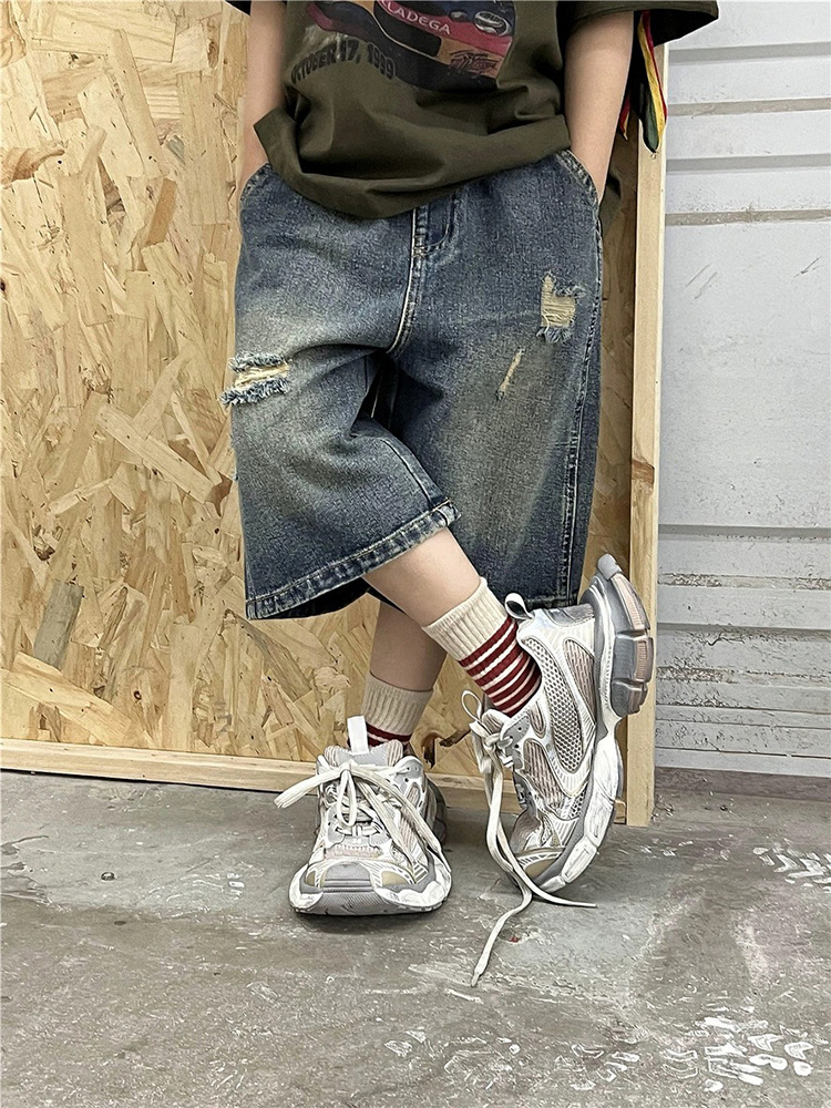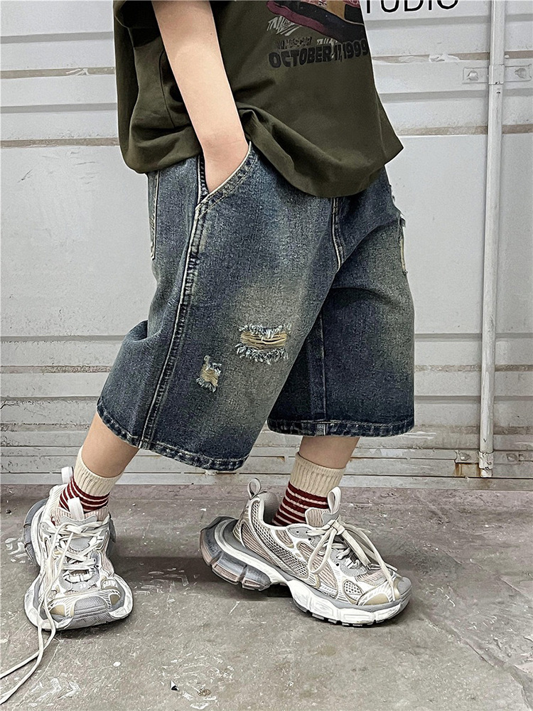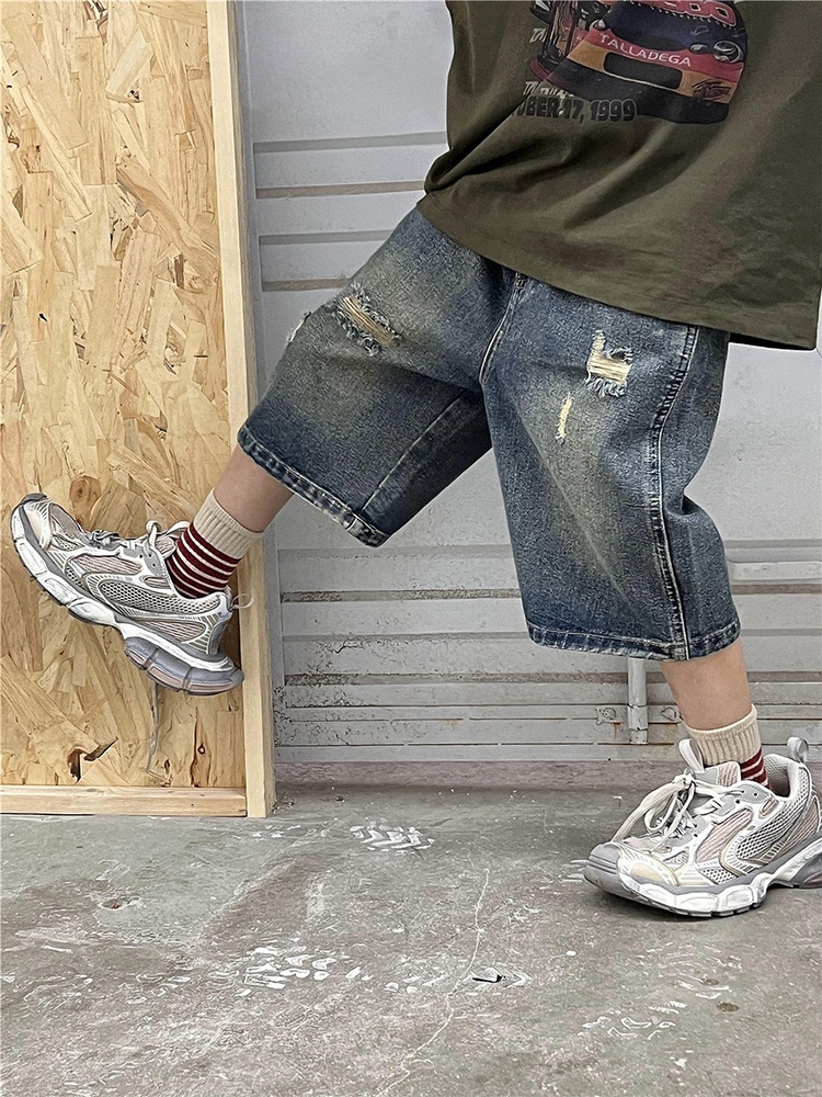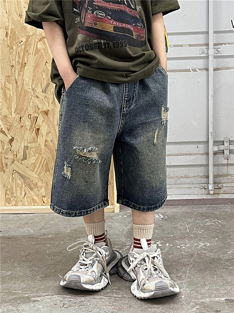 아동복 2025 여름 신작 소년 한국 스타일 복고풍 데님 반바지 중대형 소년 찢어진 오래된 바지