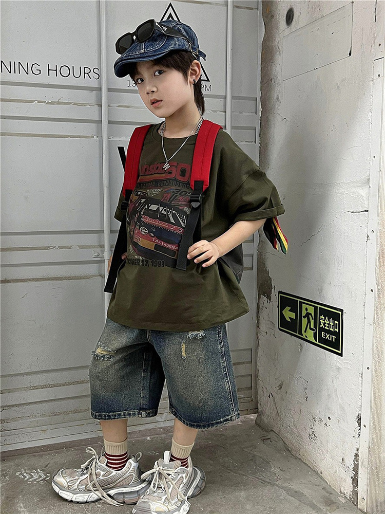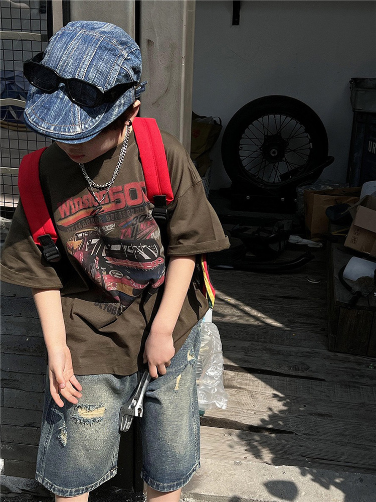 아동복 2025 여름 신작 소년 한국 스타일 복고풍 데님 반바지 중대형 소년 찢어진 오래된 바지스토어 가기