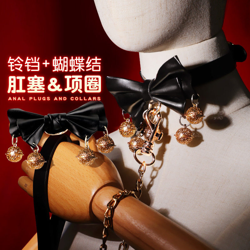 主要功能/卖点:项圈和肛塞都采用复古铃铛搭配优雅蝴蝶结的设计,项圈另外搭配金色金属牵引绳更显高级质感。