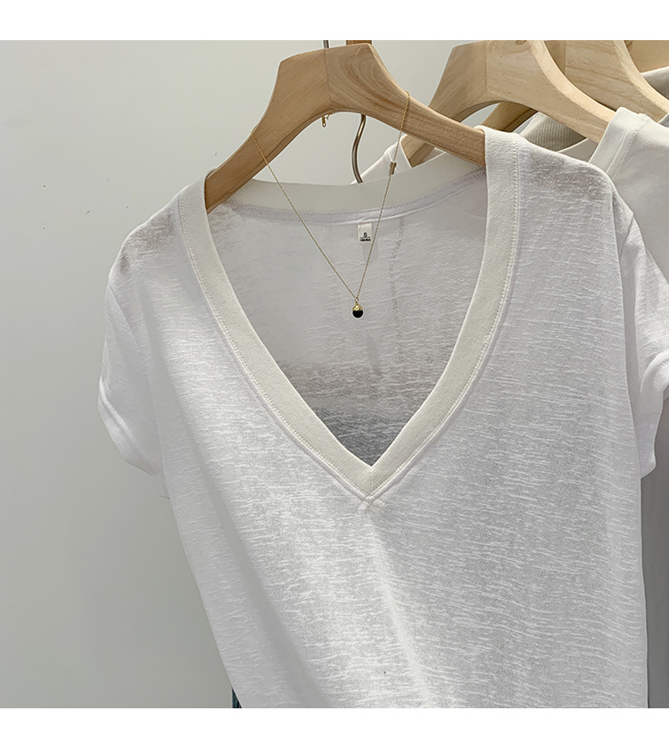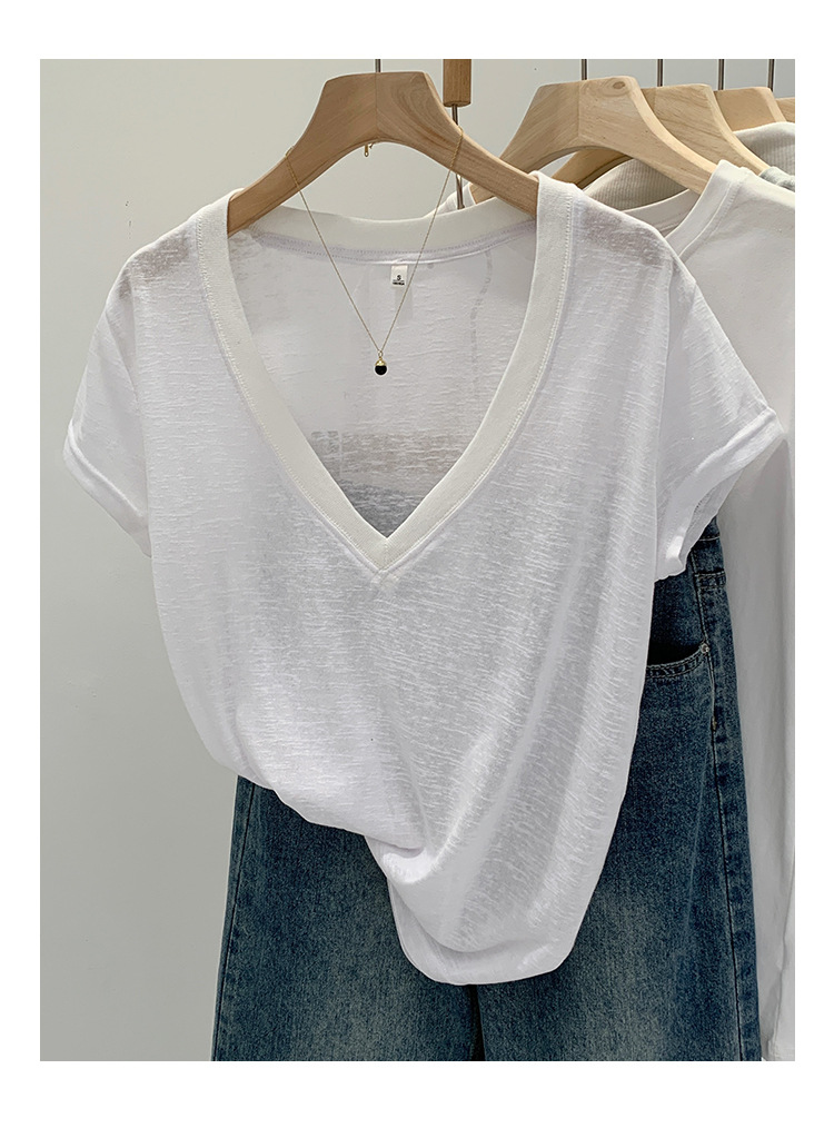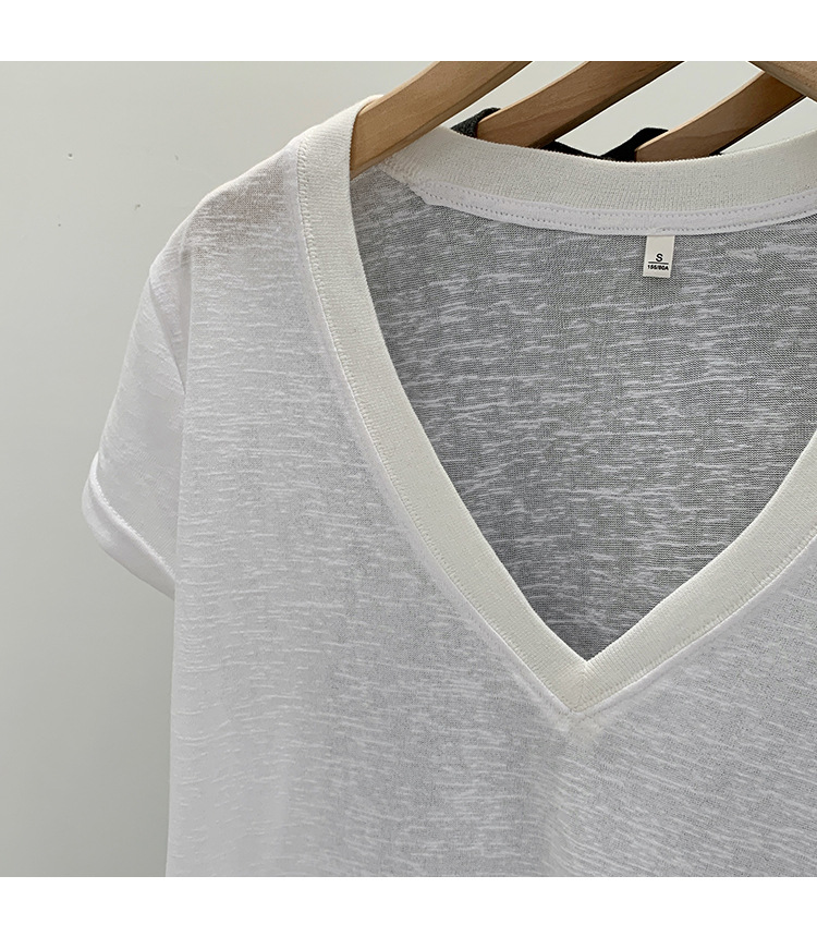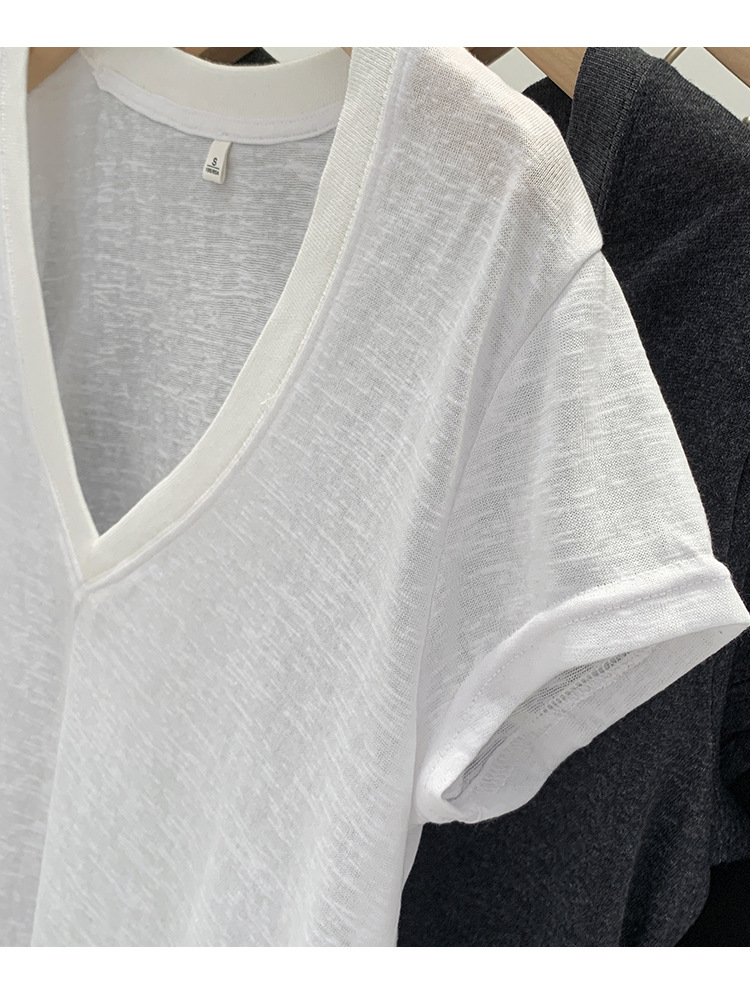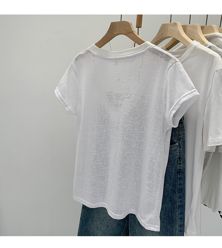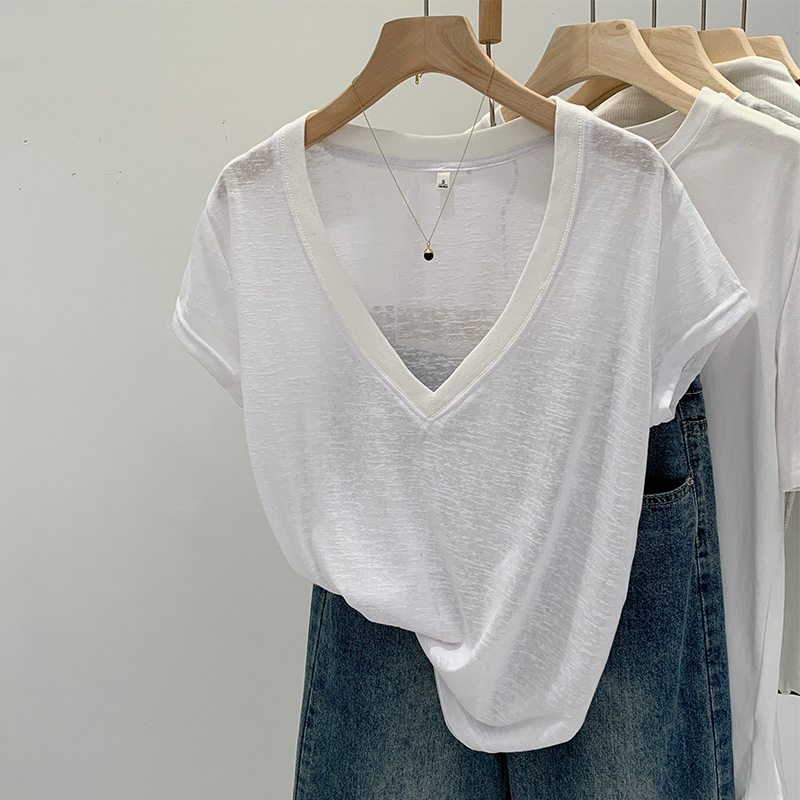 유럽 인기 흰색 V 넥 눈송이면과 린넨 반팔 티셔츠 여성용 여름 2025 새로운 약간 시스루 순수한 정욕 핫 소녀 탑스토어 가기