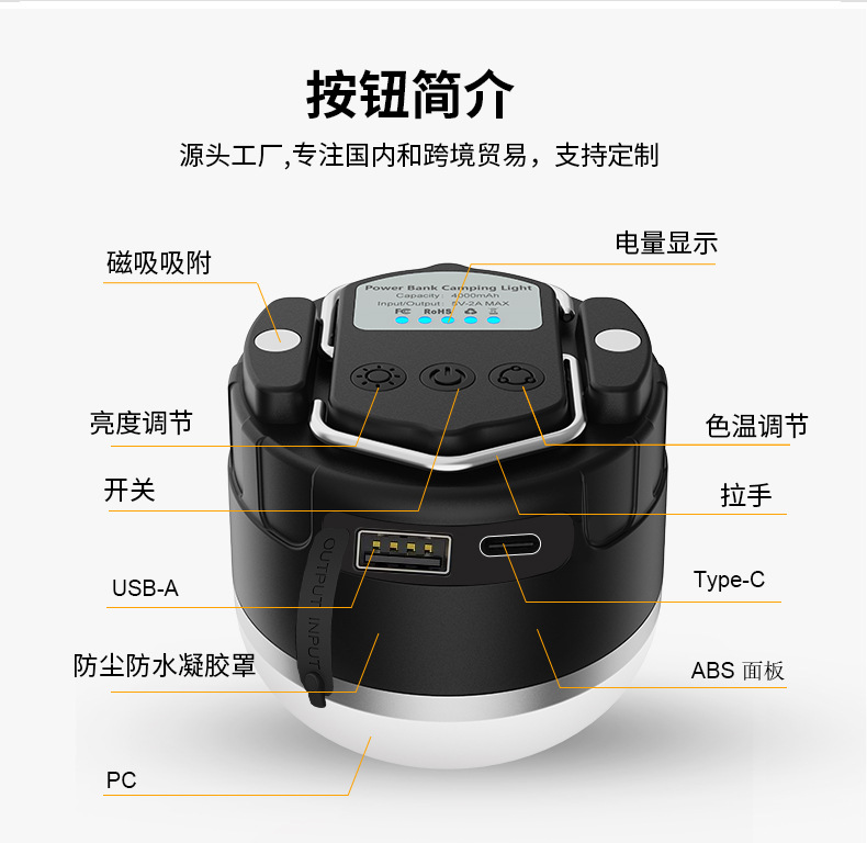 자기 매력 캠핑 조명 방수 캠프 조명 야외 캠핑 조명 다기능 USB 충전 텐트 조명 led 비상 조명스토어 가기