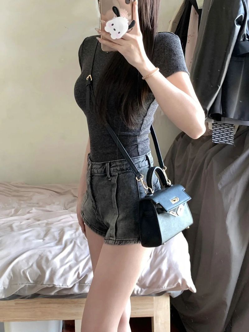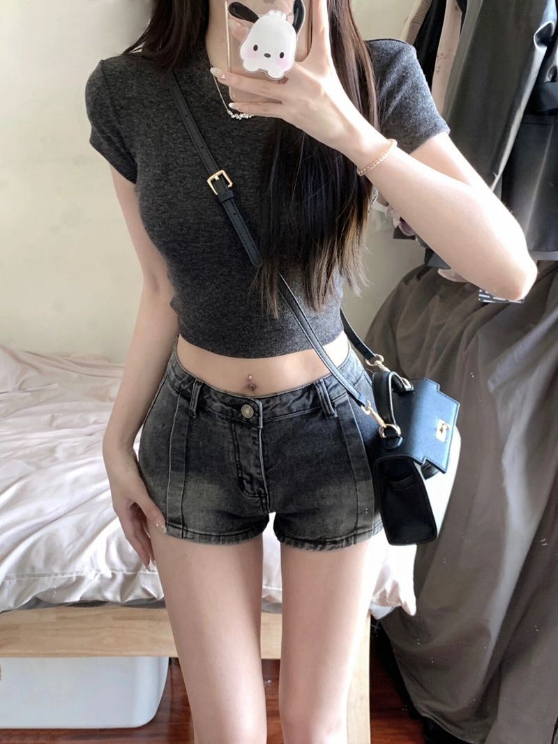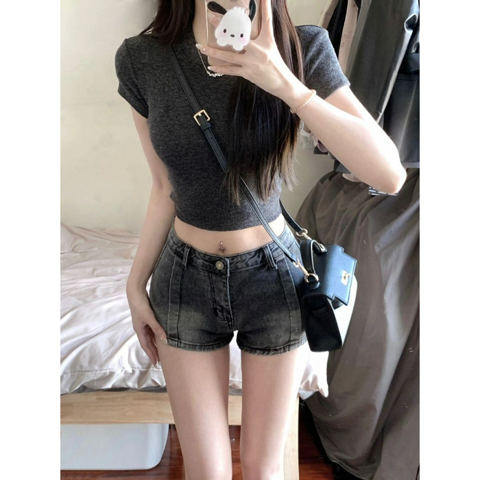다크 그레이 빈티지 반팔 티셔츠 여성용 여름 스파이스 걸의 어깨 꽉 조이는 슬리밍 짧은 자른 하이 웨이스트 탑 Ins 트렌디스토어 가기
