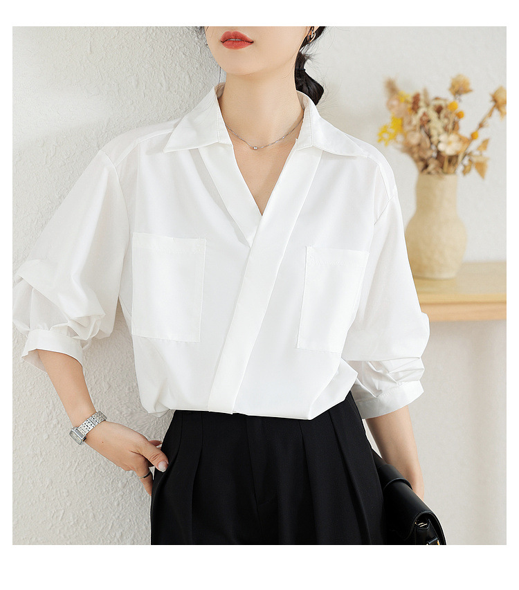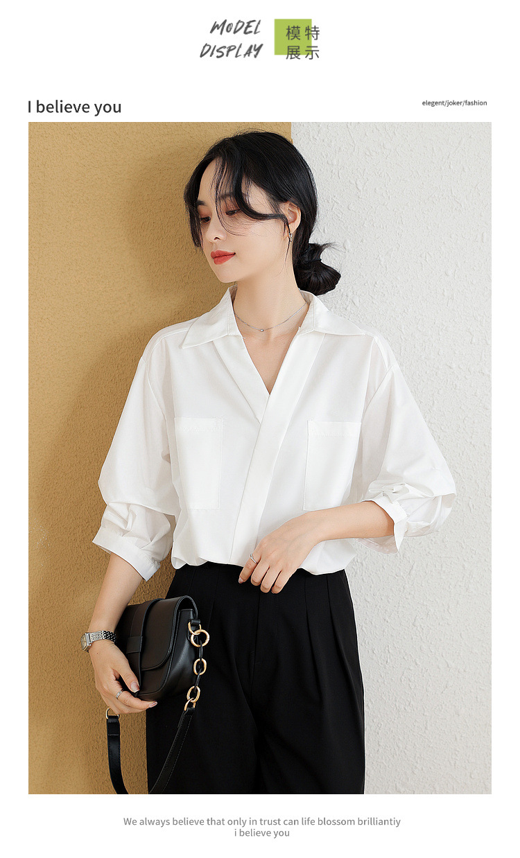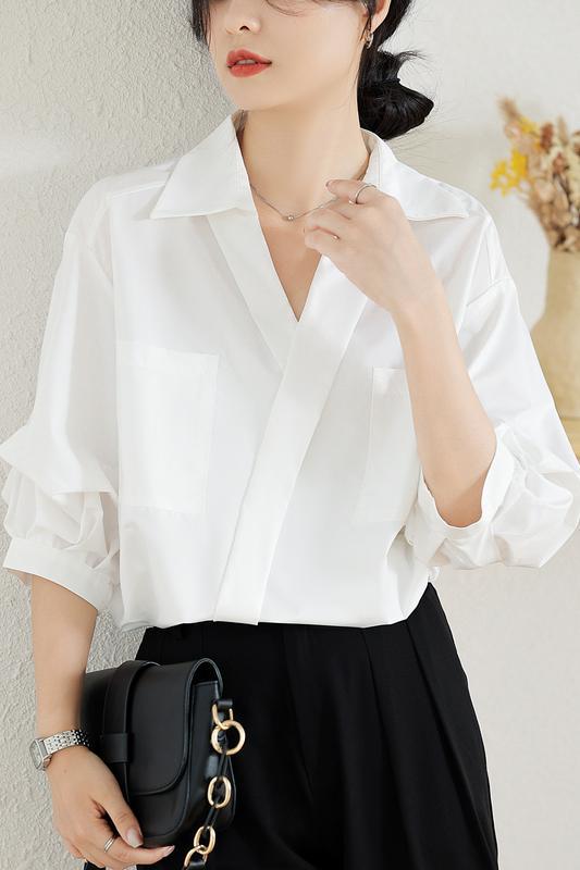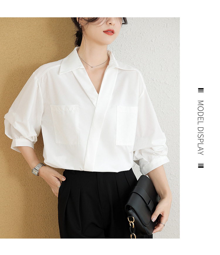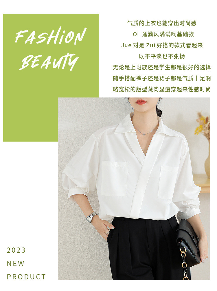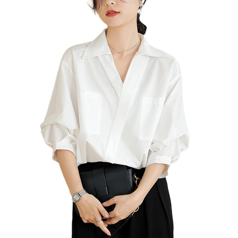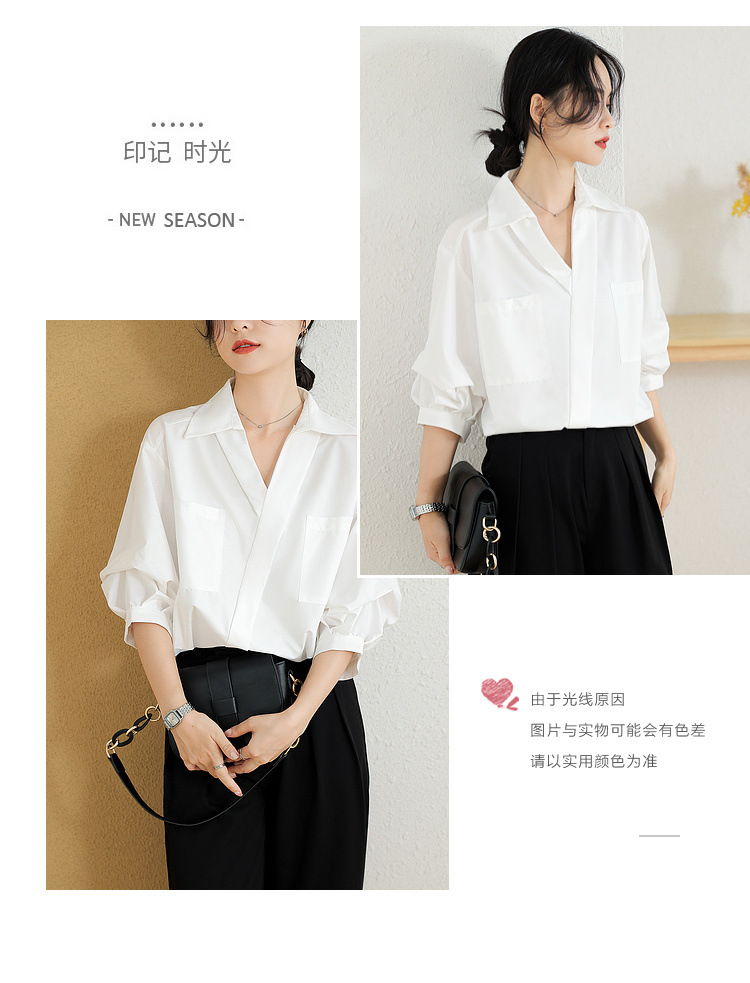 리얼 샷 화이트 세븐 포인트 슬리브 디자인 센스 셔츠 여성의 2023 여름 새로운 느슨한 슬리밍 얇은 빛 럭셔리 하이 엔드 탑