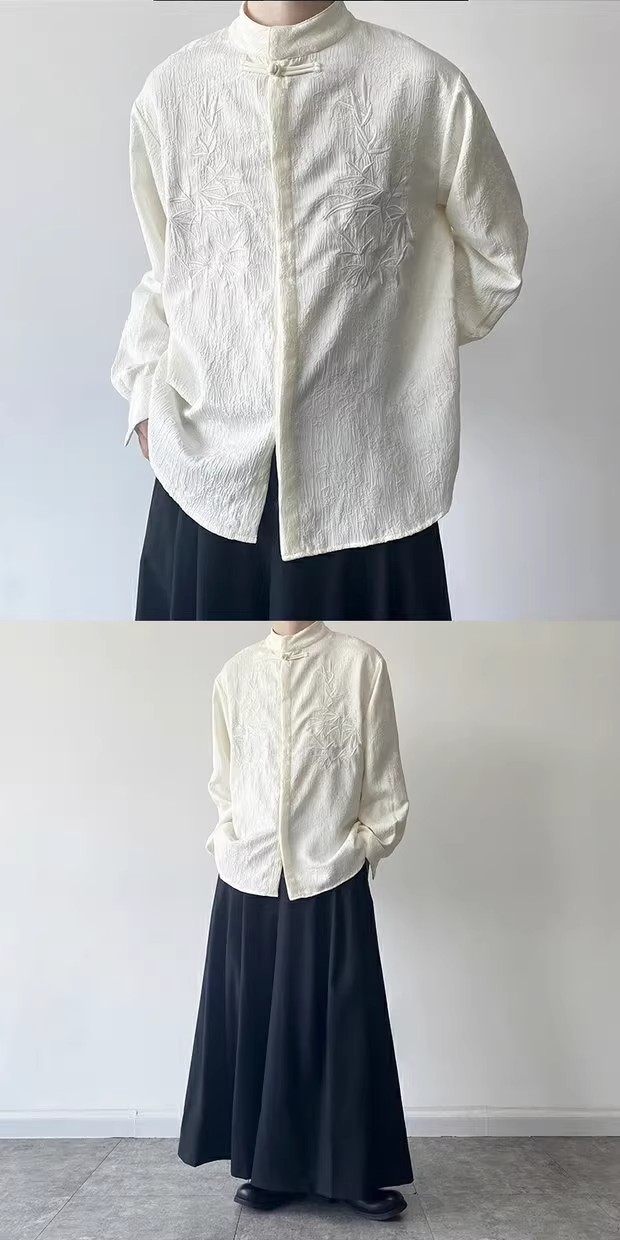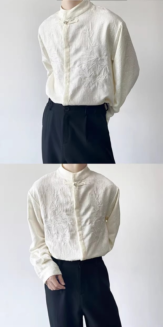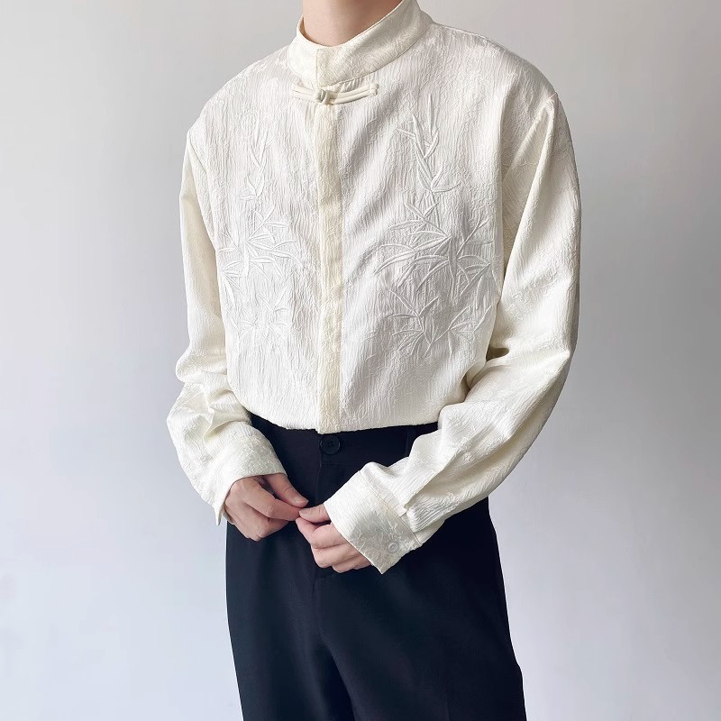 새로운 중국 스타일 Guofeng 셔츠 남자의 2024 새로운 봄과 가을 얇은 고급 수직 칼라 버클 자수 새로운 스타일 잘 생긴 긴 소매