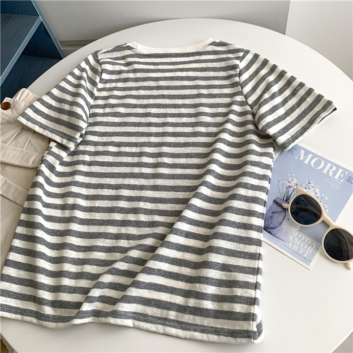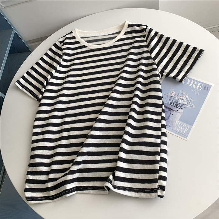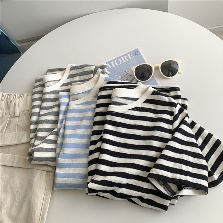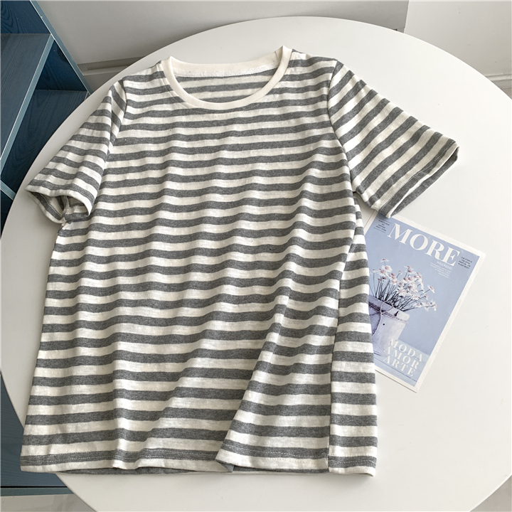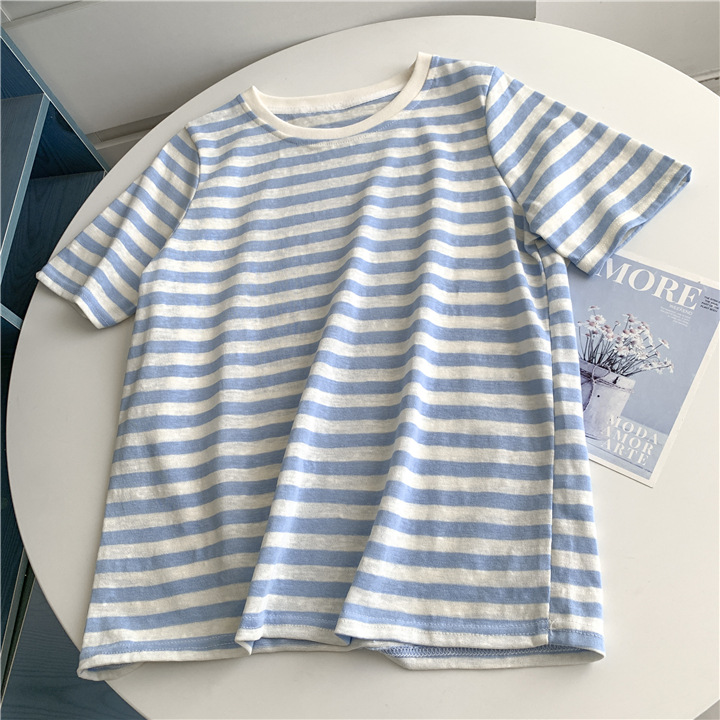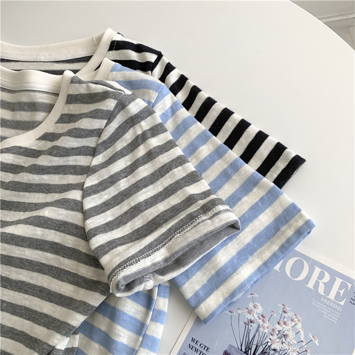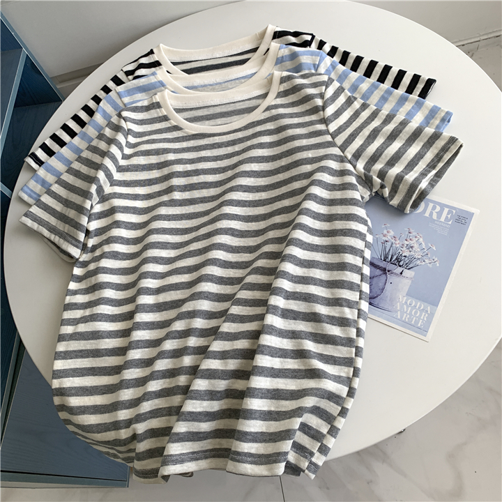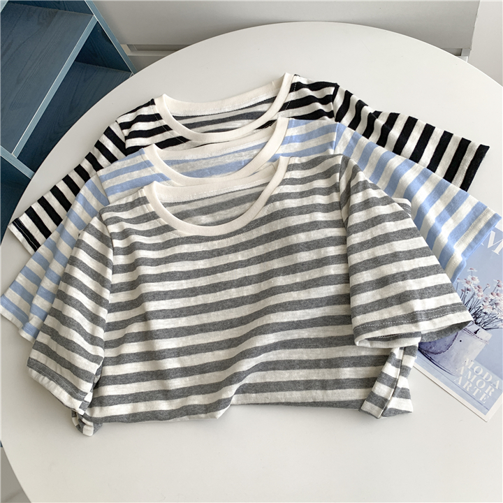 스트라이프 코튼 린넨 질감의 여성용 반팔 티셔츠 2026년 신상 여름 다용도 반팔 라운드넥 한국 스타일 얇은 상의스토어 가기