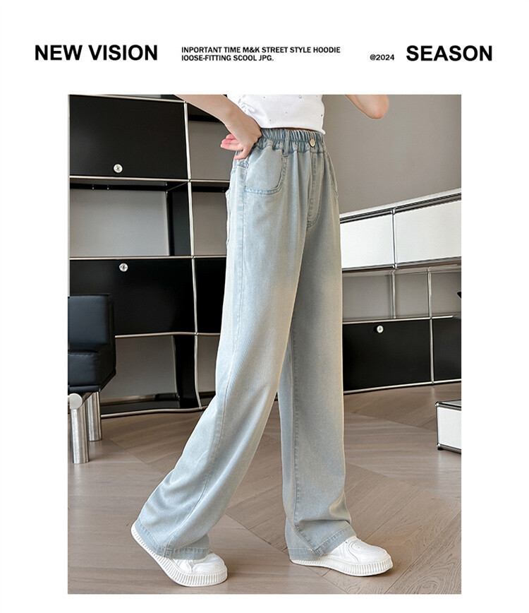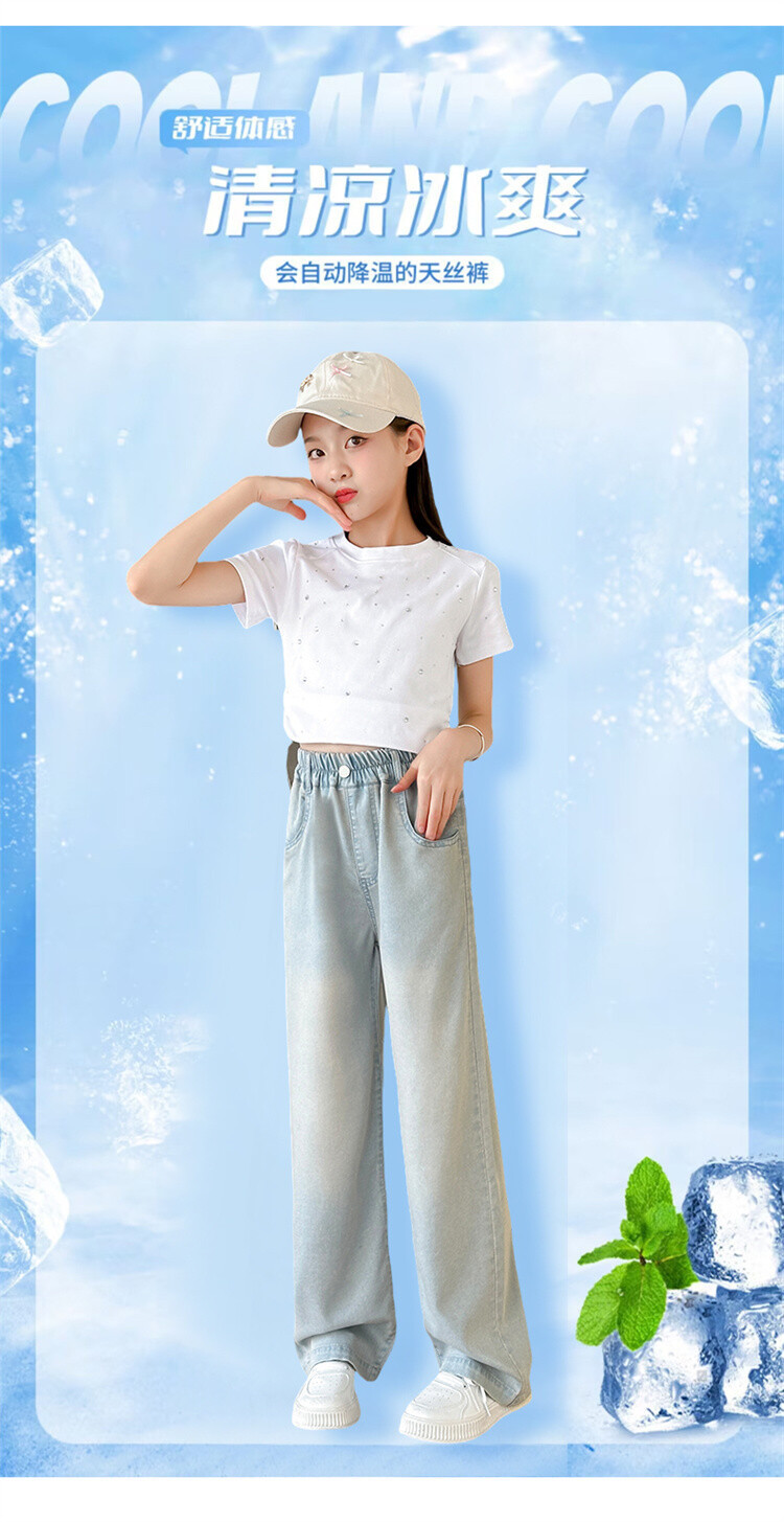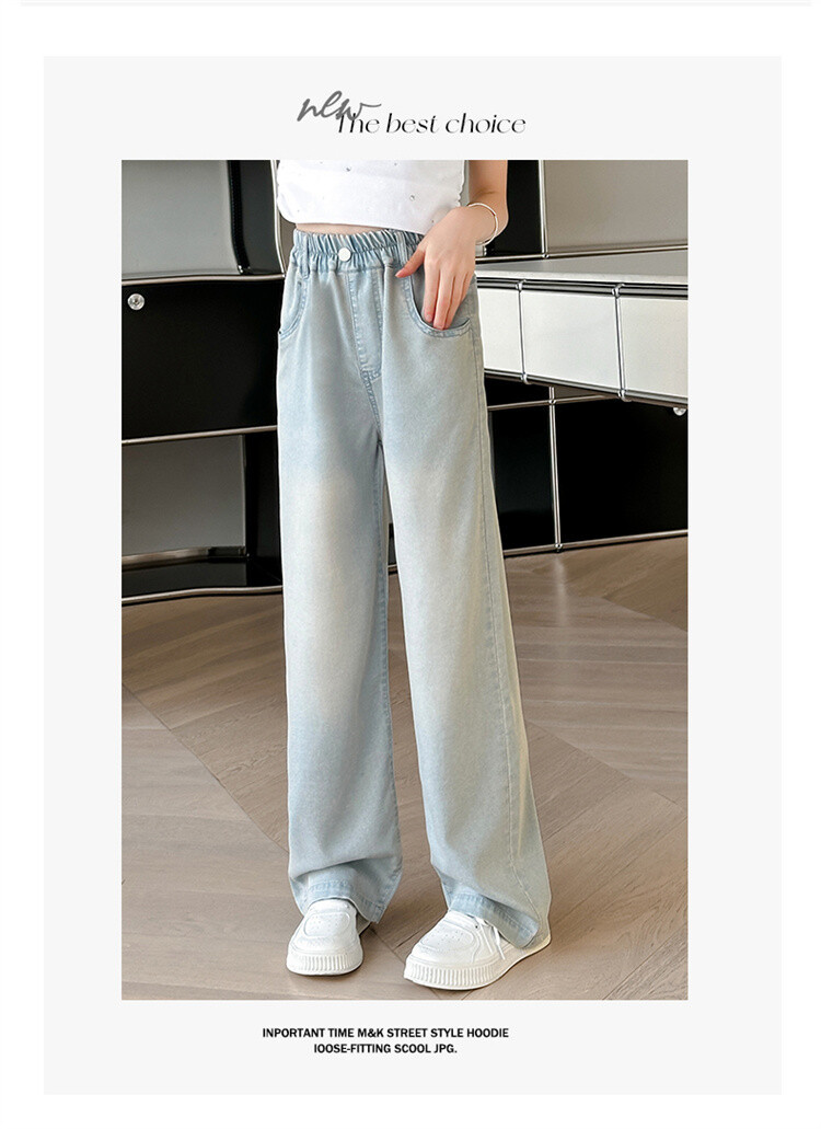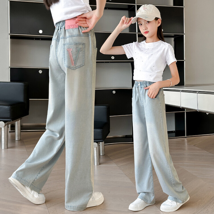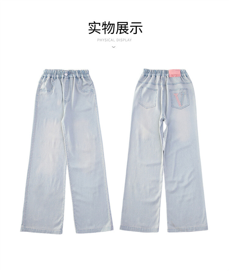 소녀의 바지 여름 얇은 2024 새로운 어린이 스트레이트 와이드 다리 바지 여름 소녀의 큰 어린이 텐셀 청바지스토어 가기