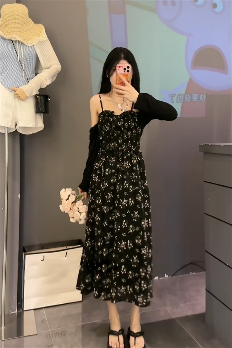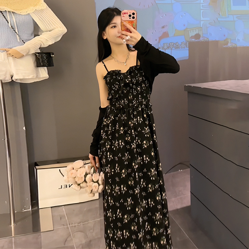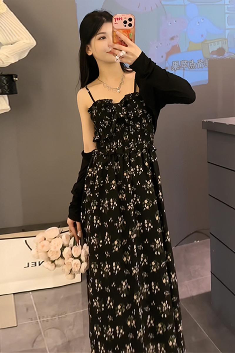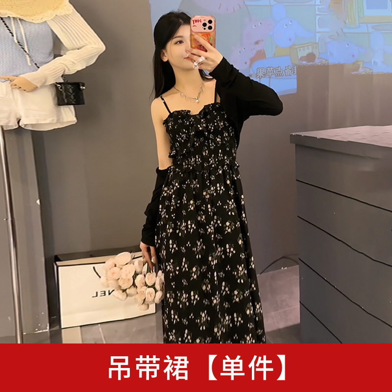블랙 플로럴 스트랩 원피스 이른 봄 차 원피스 원피스 전체 세트 여름 여성의 2024 새로운