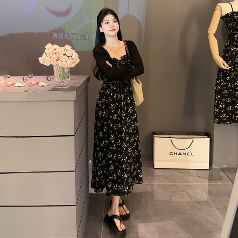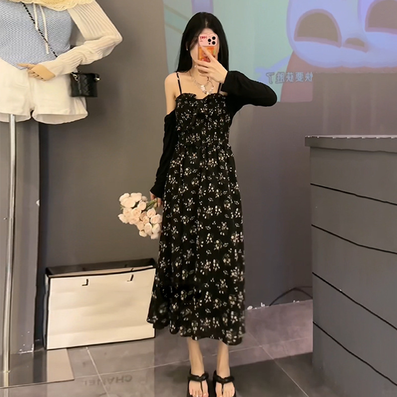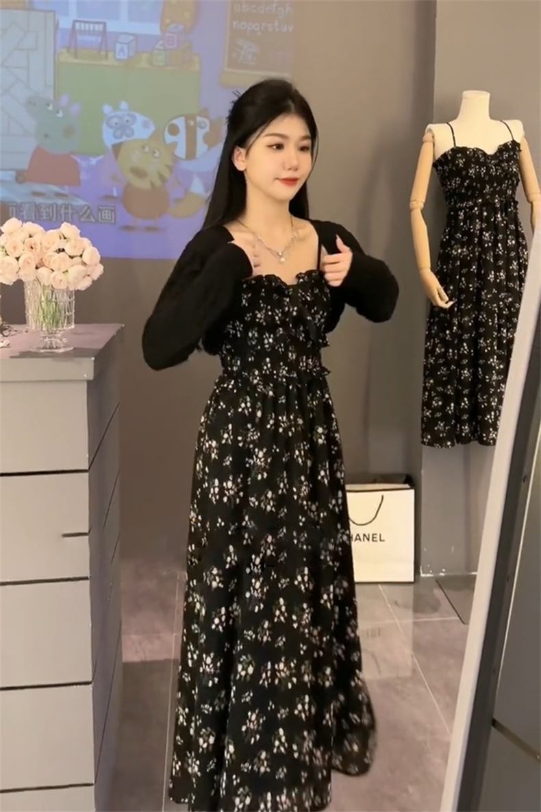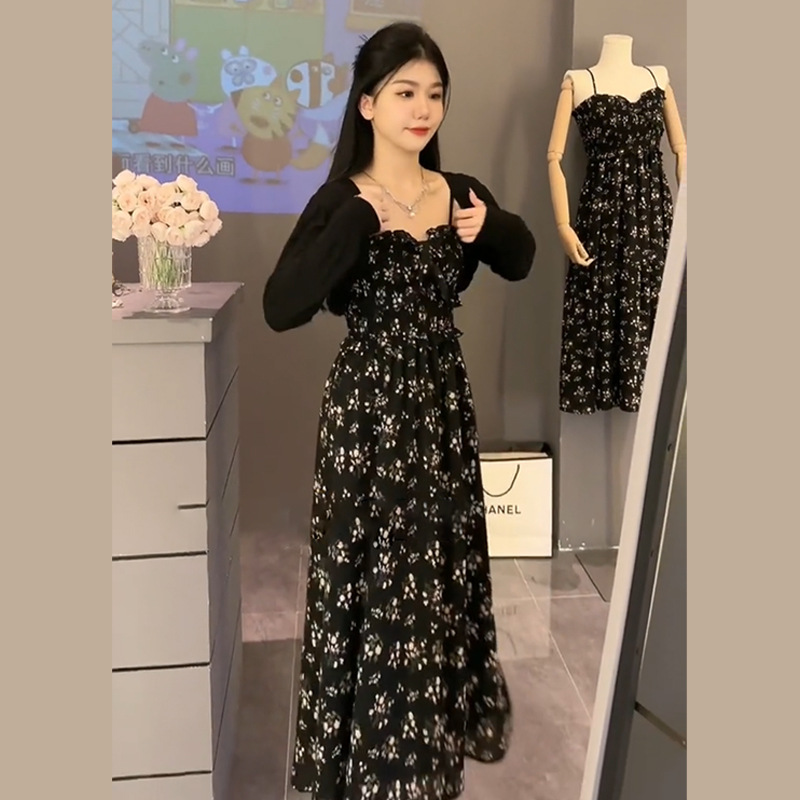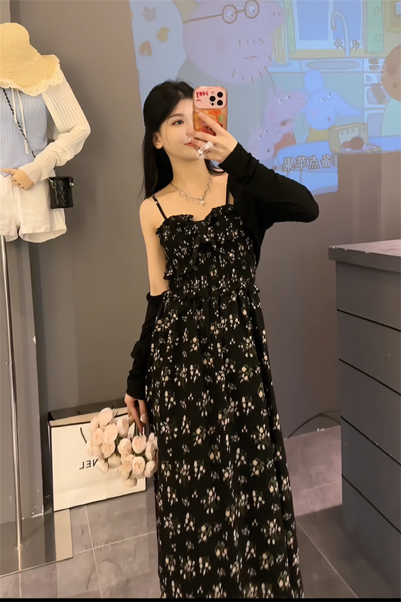 블랙 플로럴 스트랩 원피스 이른 봄 차 원피스 원피스 전체 세트 여름 여성의 2024 새로운