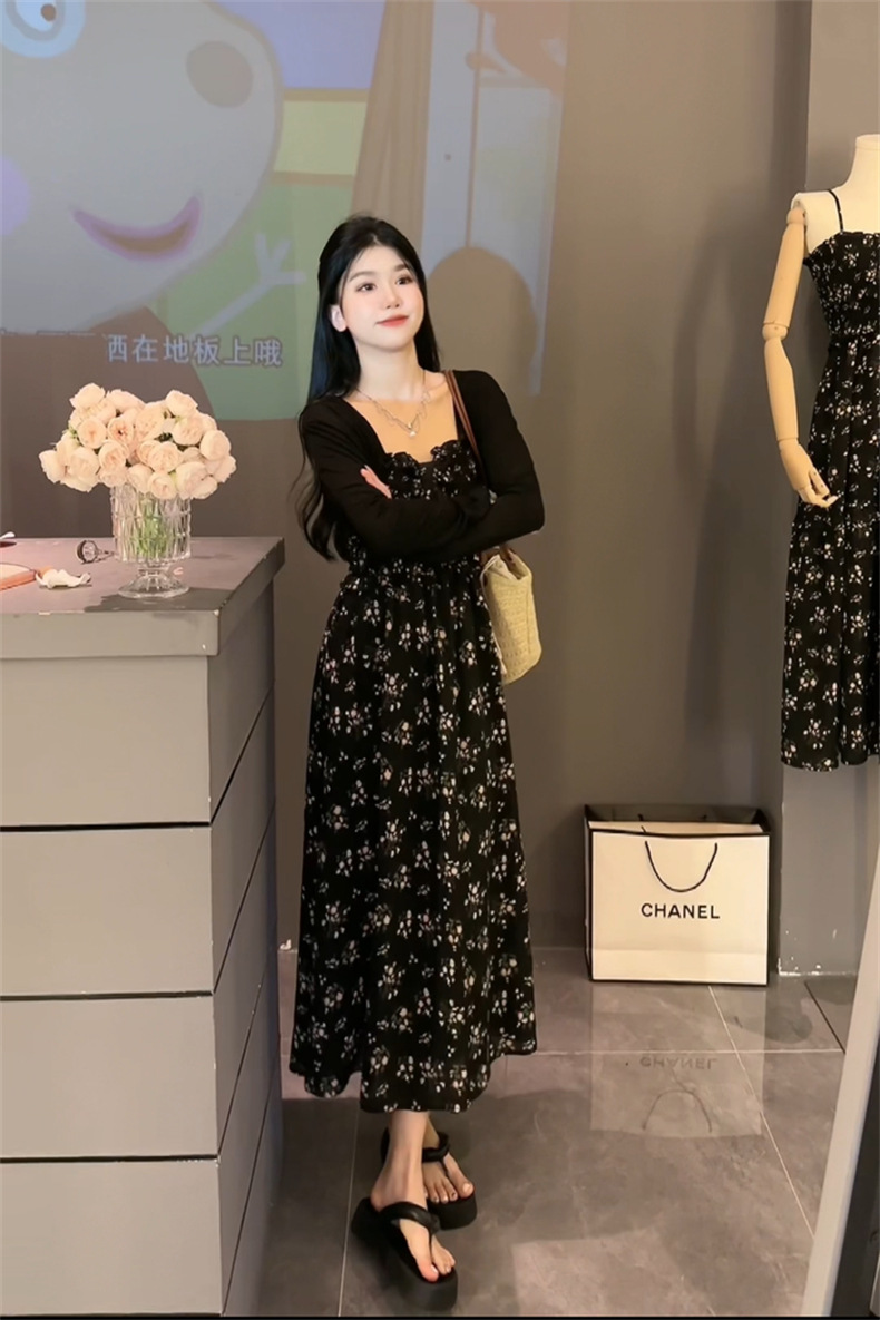 블랙 플로럴 스트랩 원피스 이른 봄 차 원피스 원피스 전체 세트 여름 여성의 2024 새로운스토어 가기