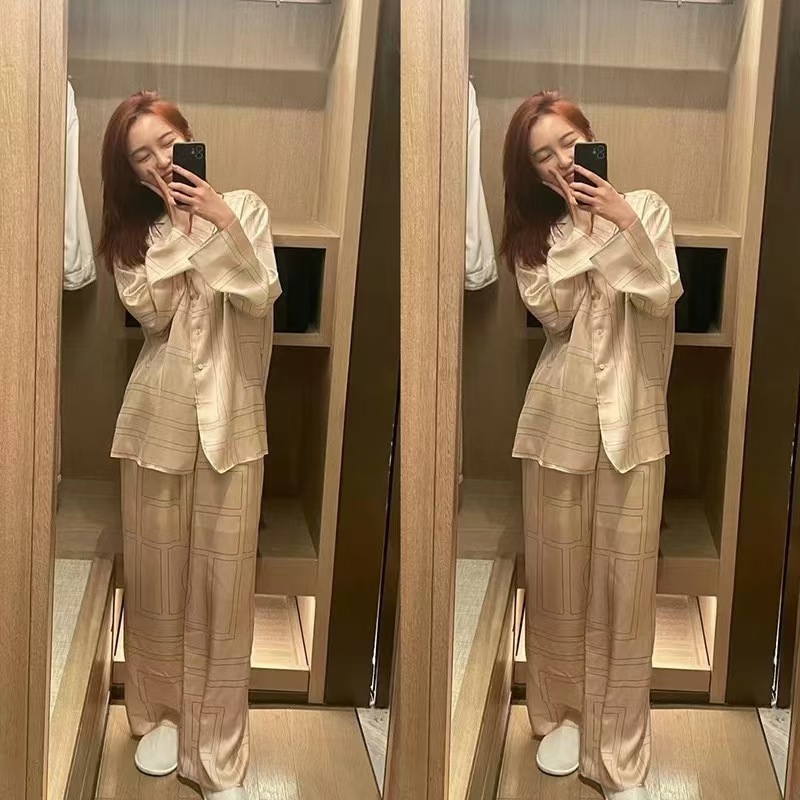 잠옷 여성의 여름 게으른 하이 엔드 아이스 실크 카디건 긴팔 니치 라이트 럭셔리 여성용 프린트 세트 홈 의류스토어 가기